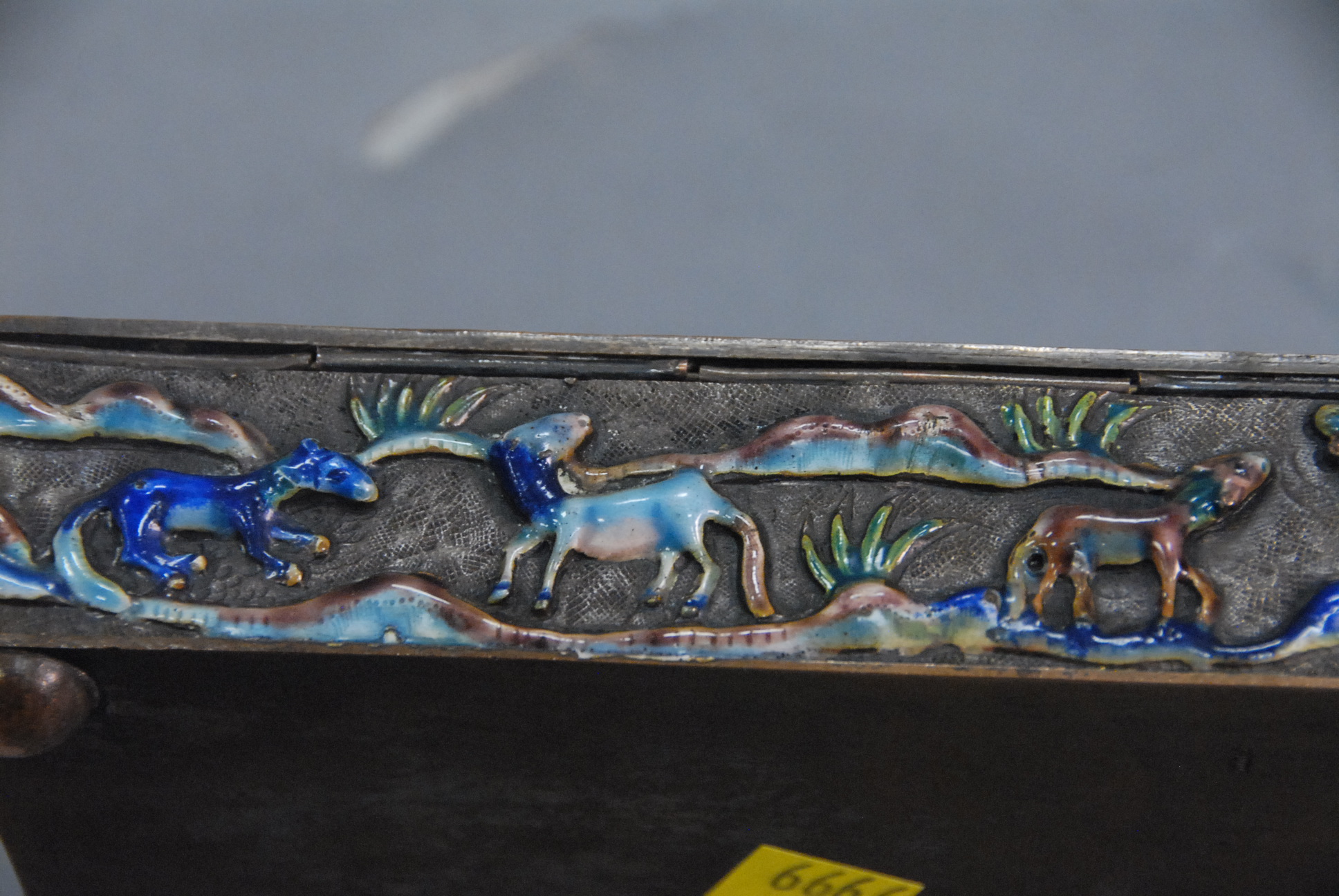 Lot 15: Celadon jade dragon belt buckle lg. 3 3/4in. mounted on an enameled cigarette box with enameled horses lg. 12in. ht. 2 1/2in. wd. …