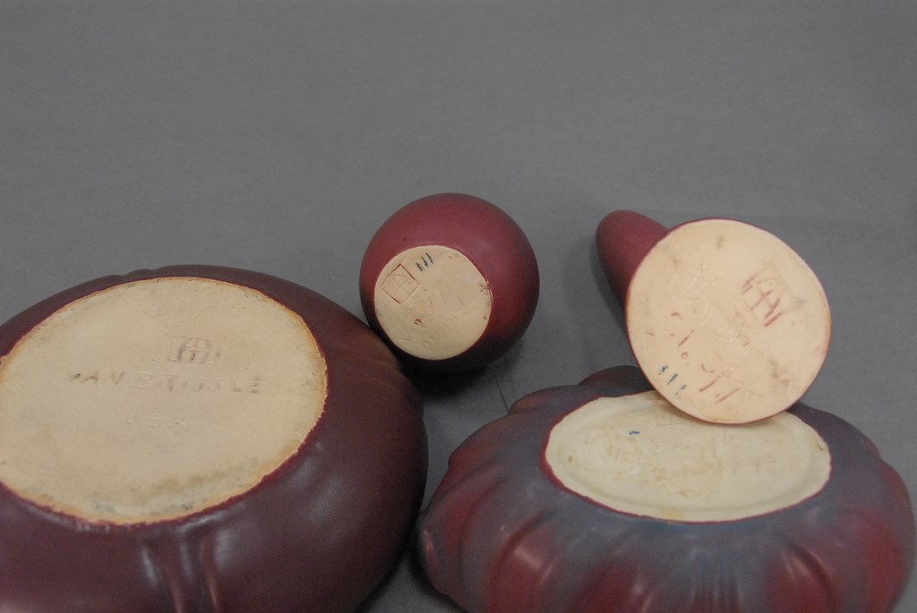 Four piece lot of Van Briggle pottery to include two open pots and two vases. largest dia. 9in.