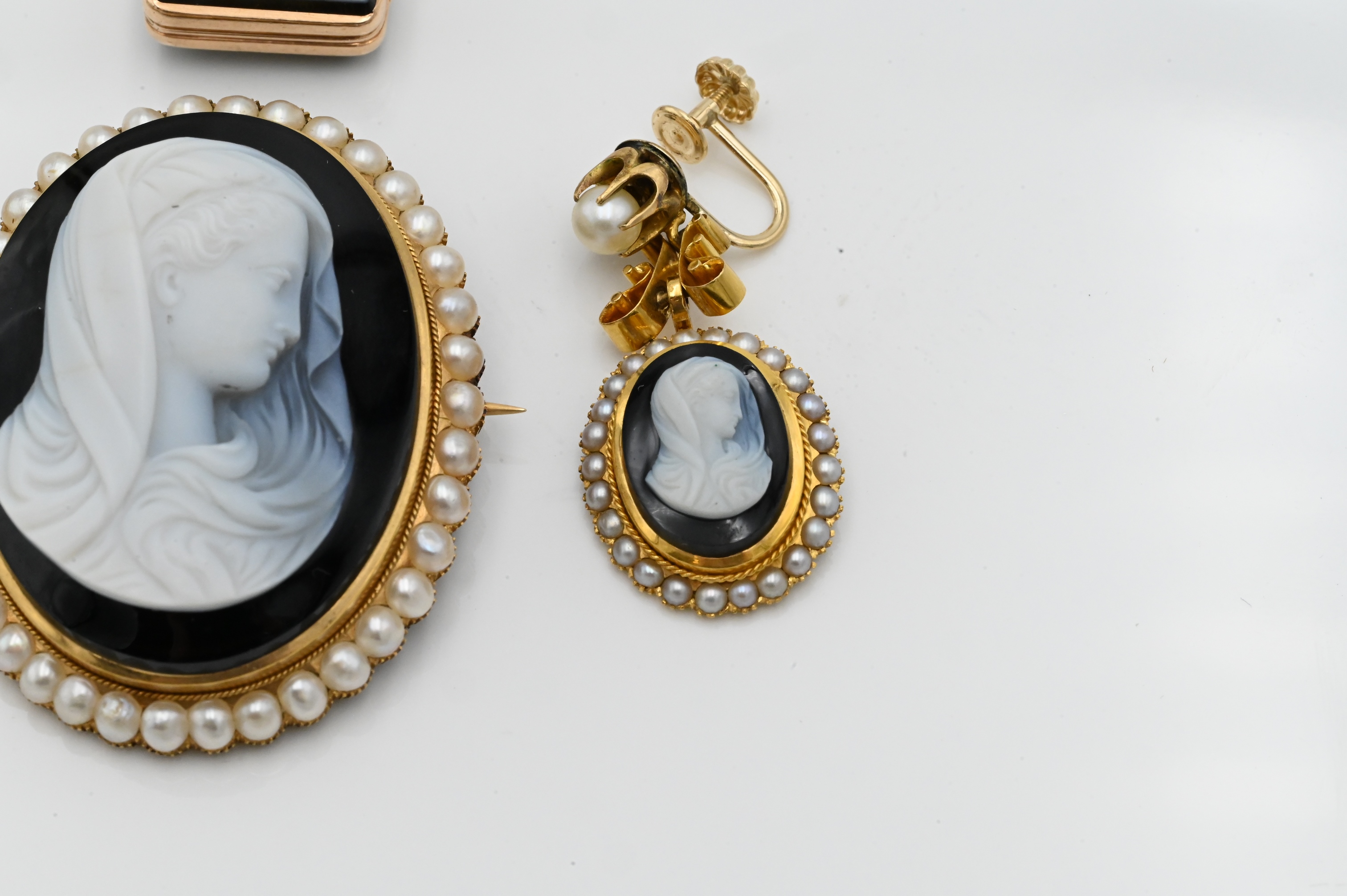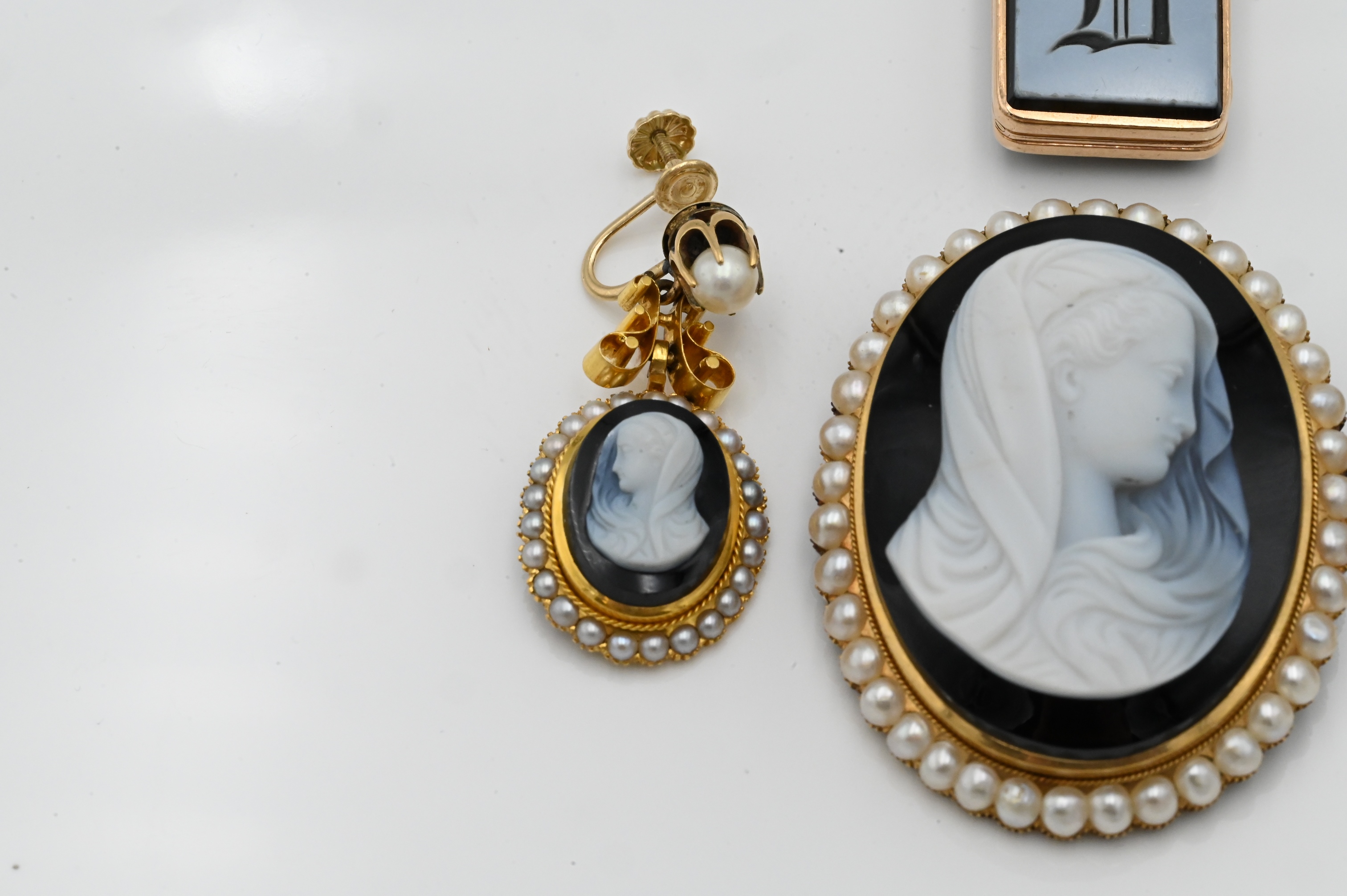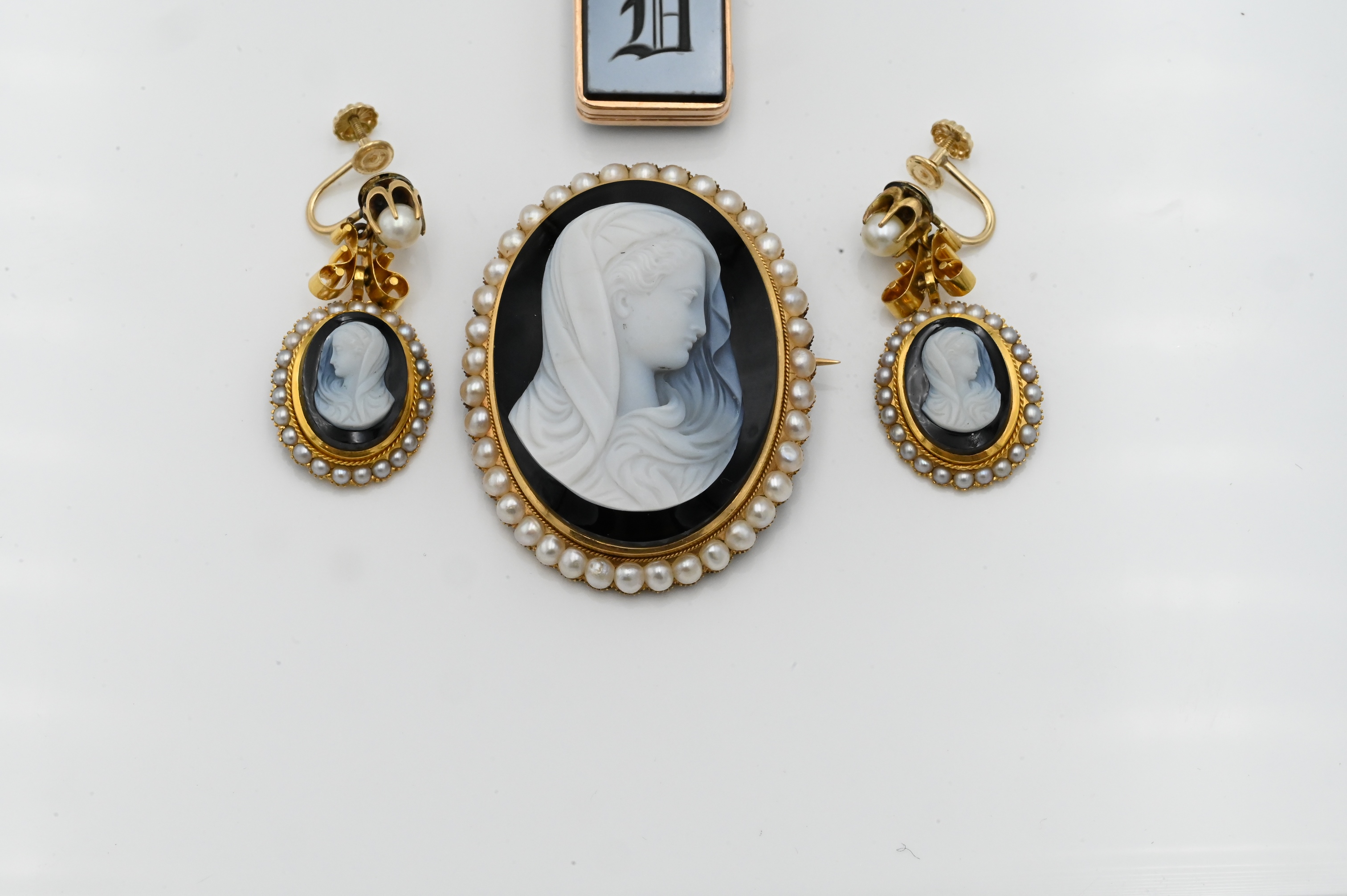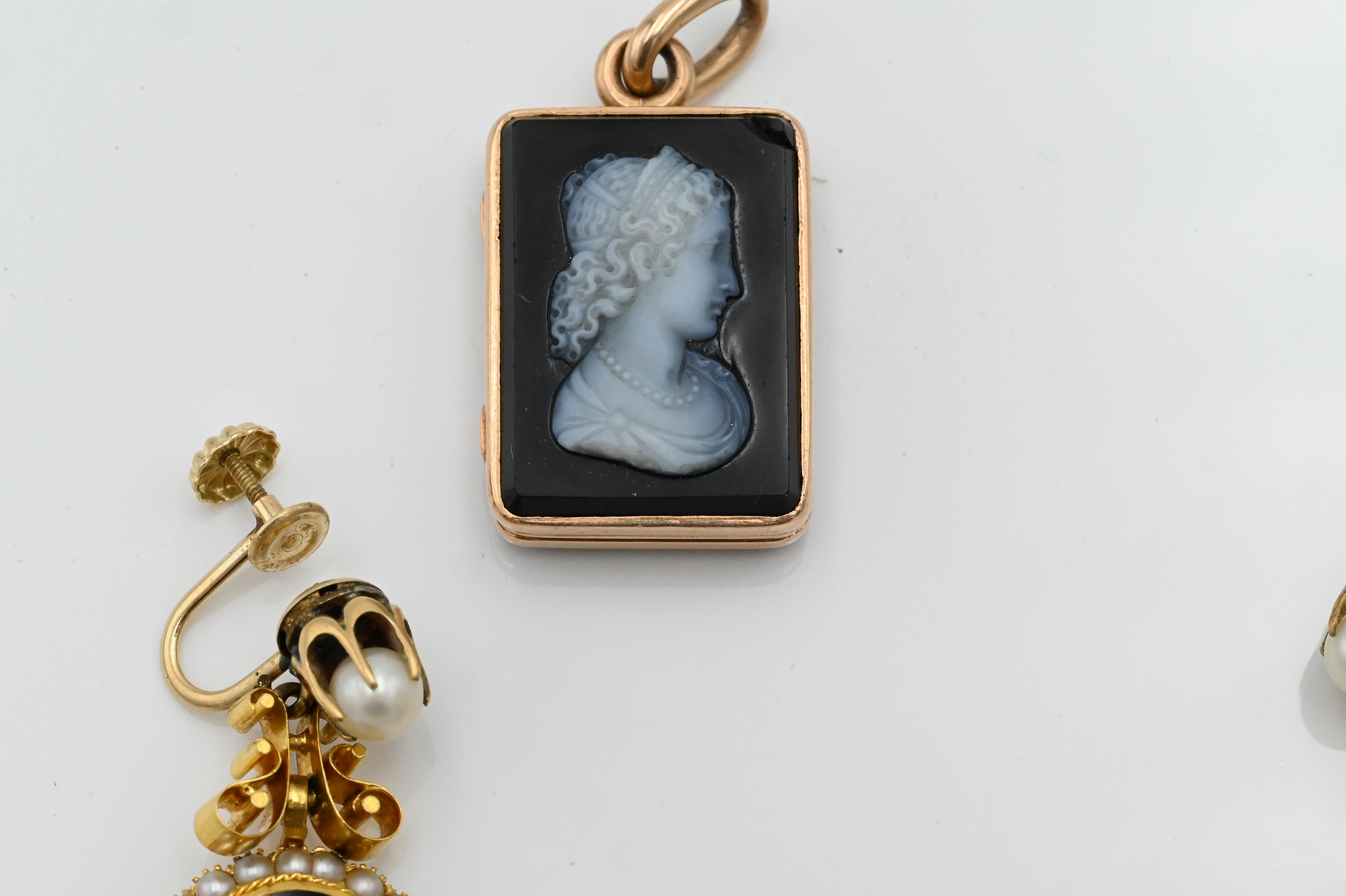 to include veiled woman brooch, screw back earrings, along with a stone cameo locket
