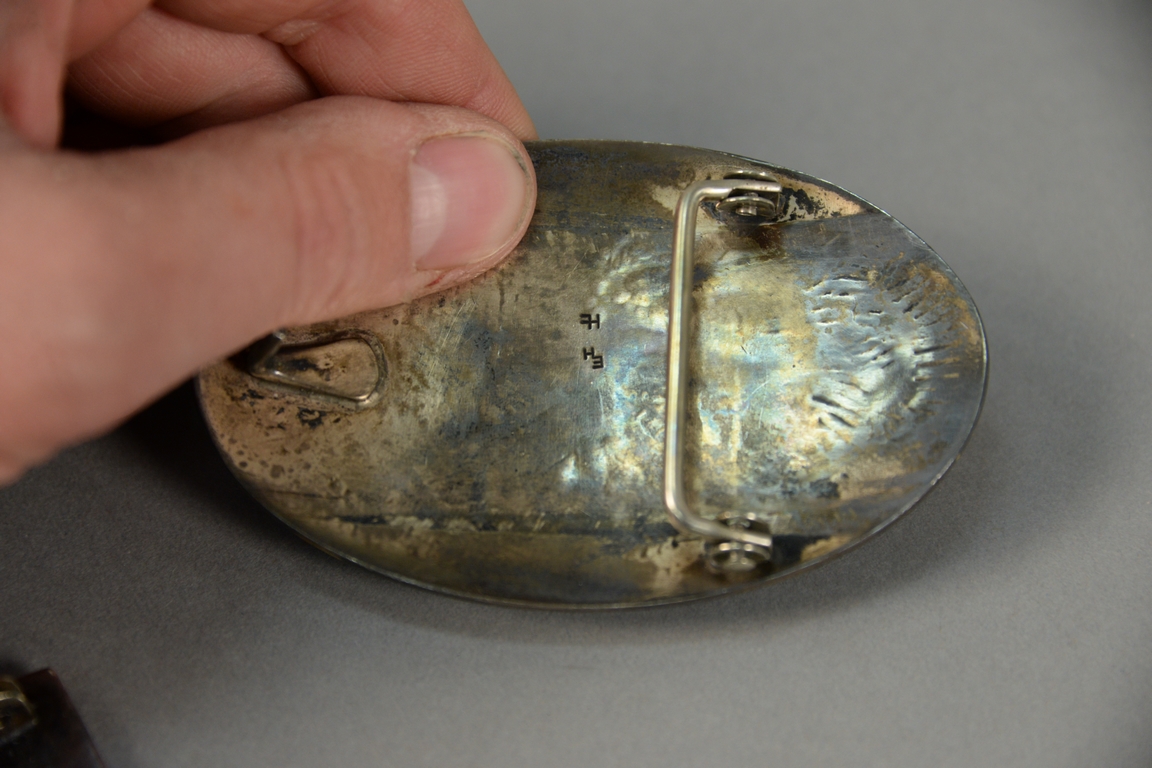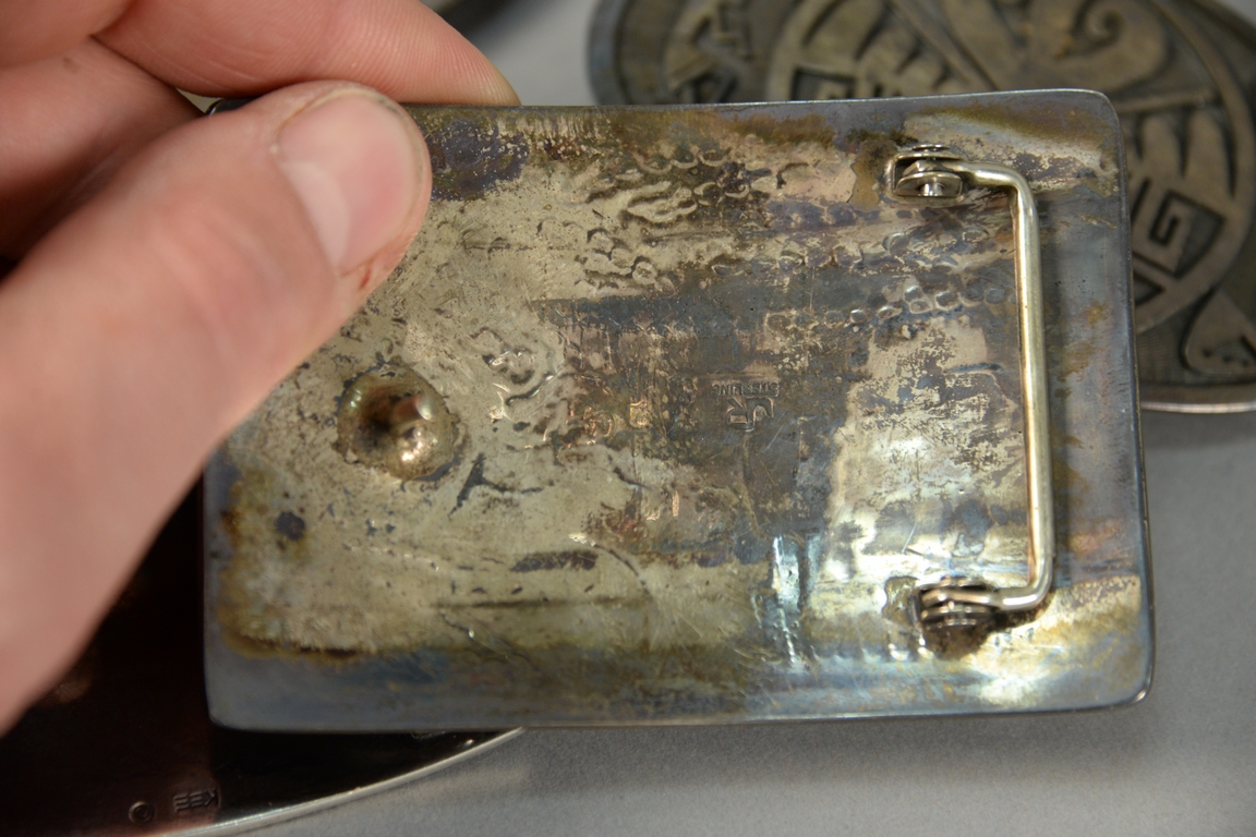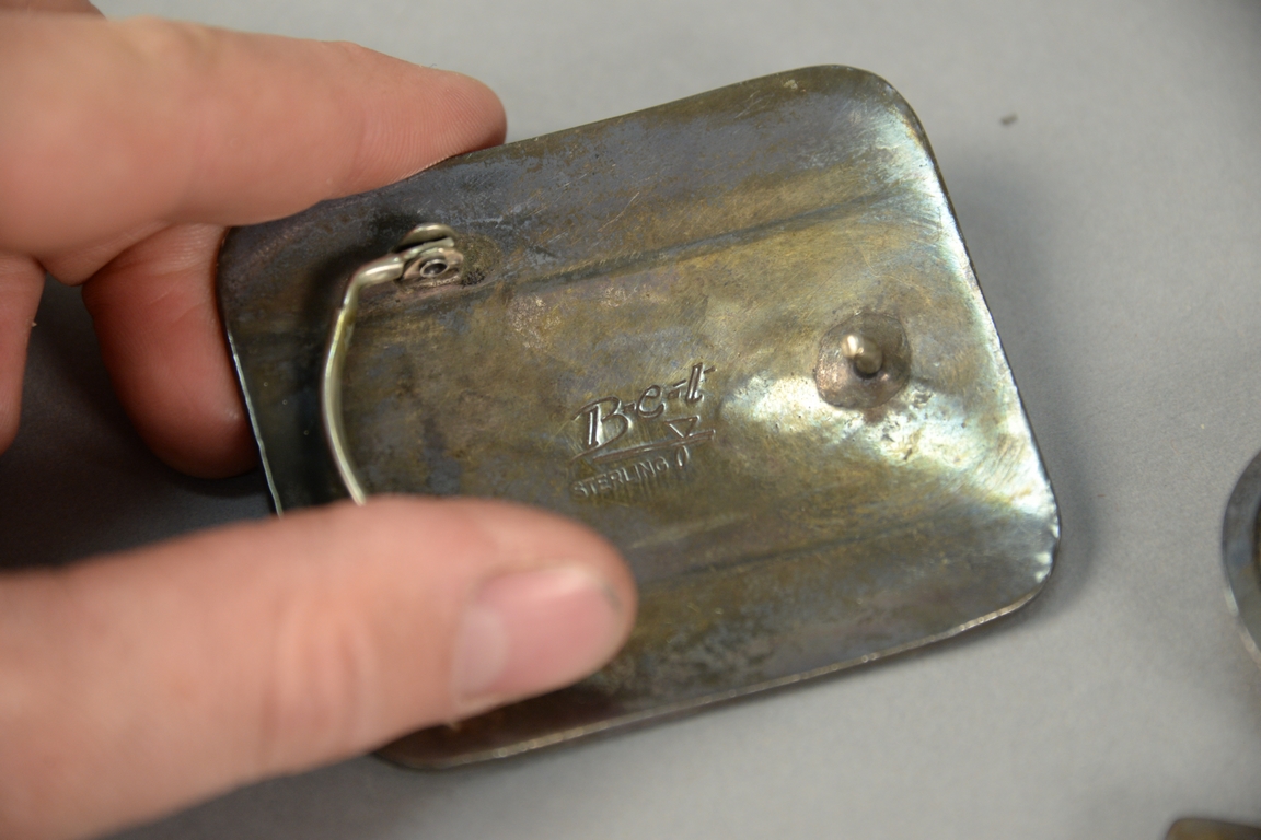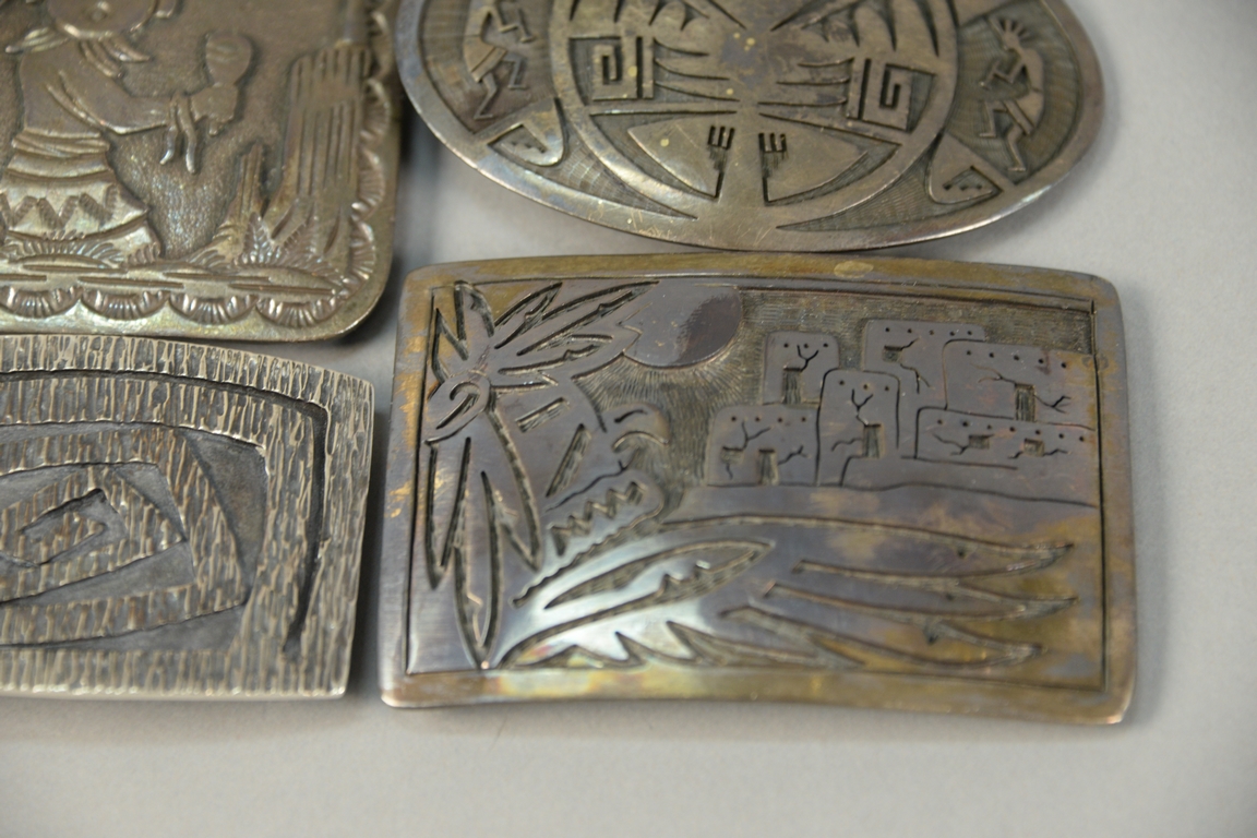 Lot 15: Four Western Navajo Native American Indian sterling silver belt buckles, marked Bet, JR, EHHC, etc. largest: 3 1/4 x 3 1/2, 8.9 t oz.