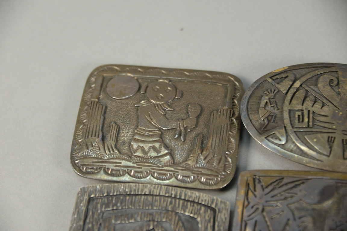 Four Western Navajo Native American Indian sterling silver belt buckles, marked Bet, JR, EHHC, etc. largest: 3 1/4 x 3 1/2, 8.9 t oz.