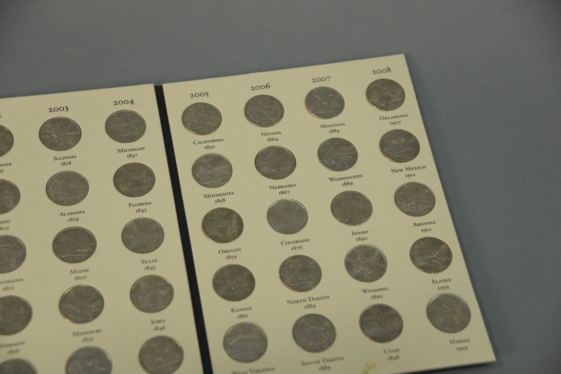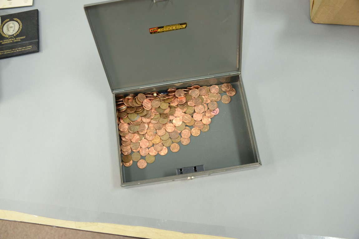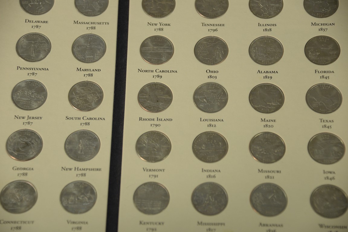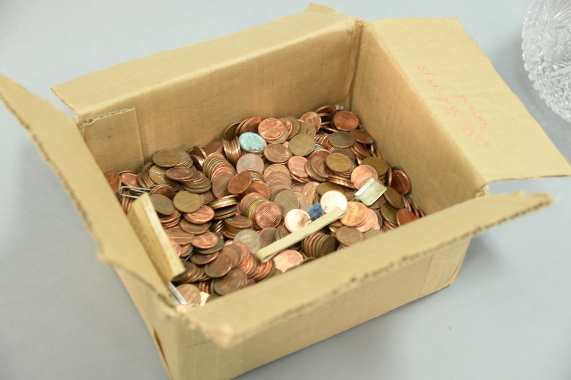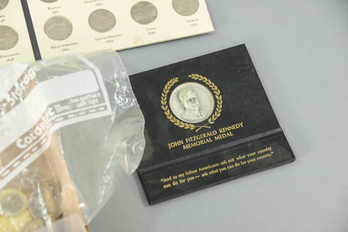 Lot 15: Group of coins including 1893 Columbian Exposition 1960 mint set, State quarters and foreign coins along with several hundred pennies.