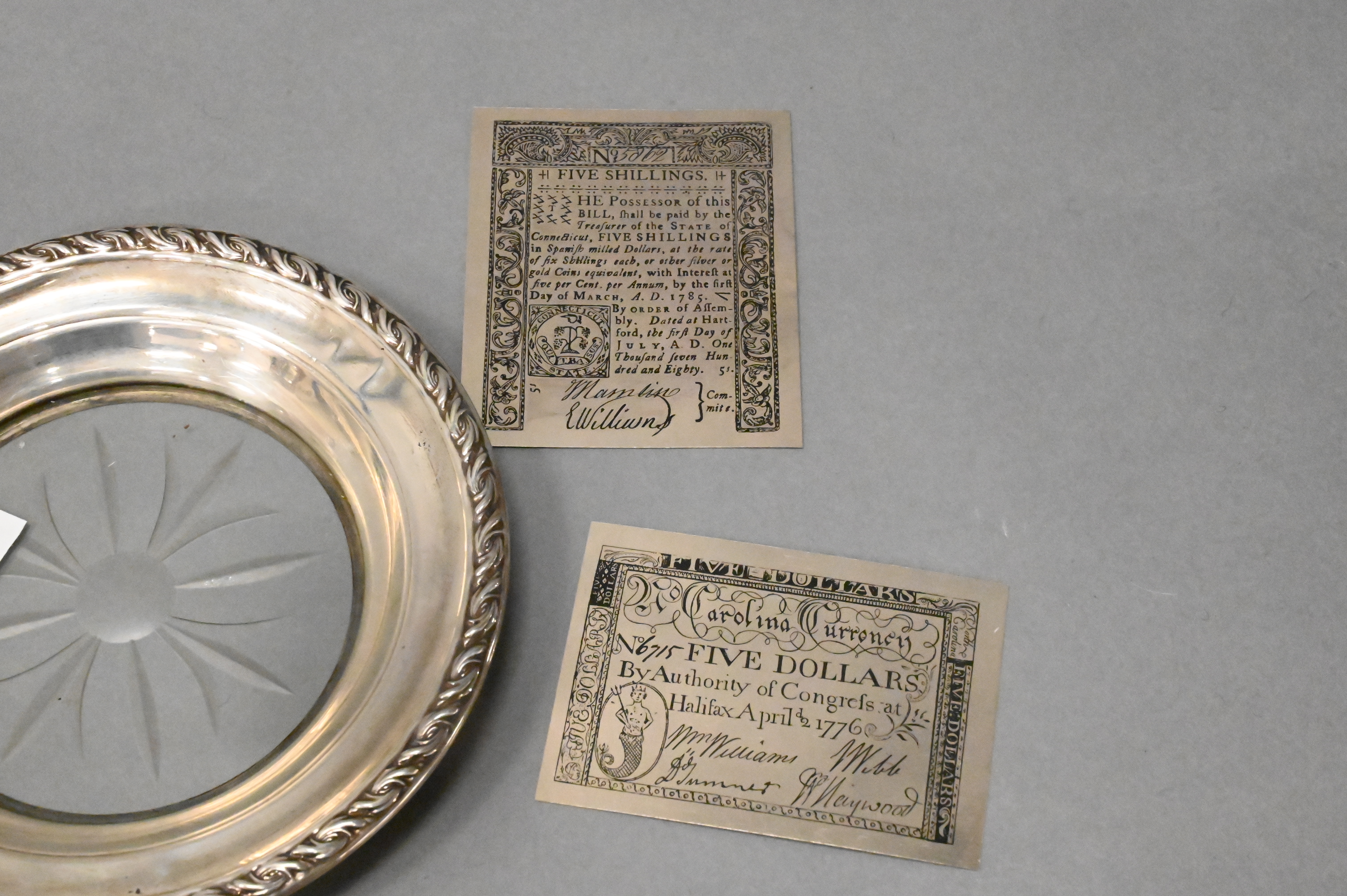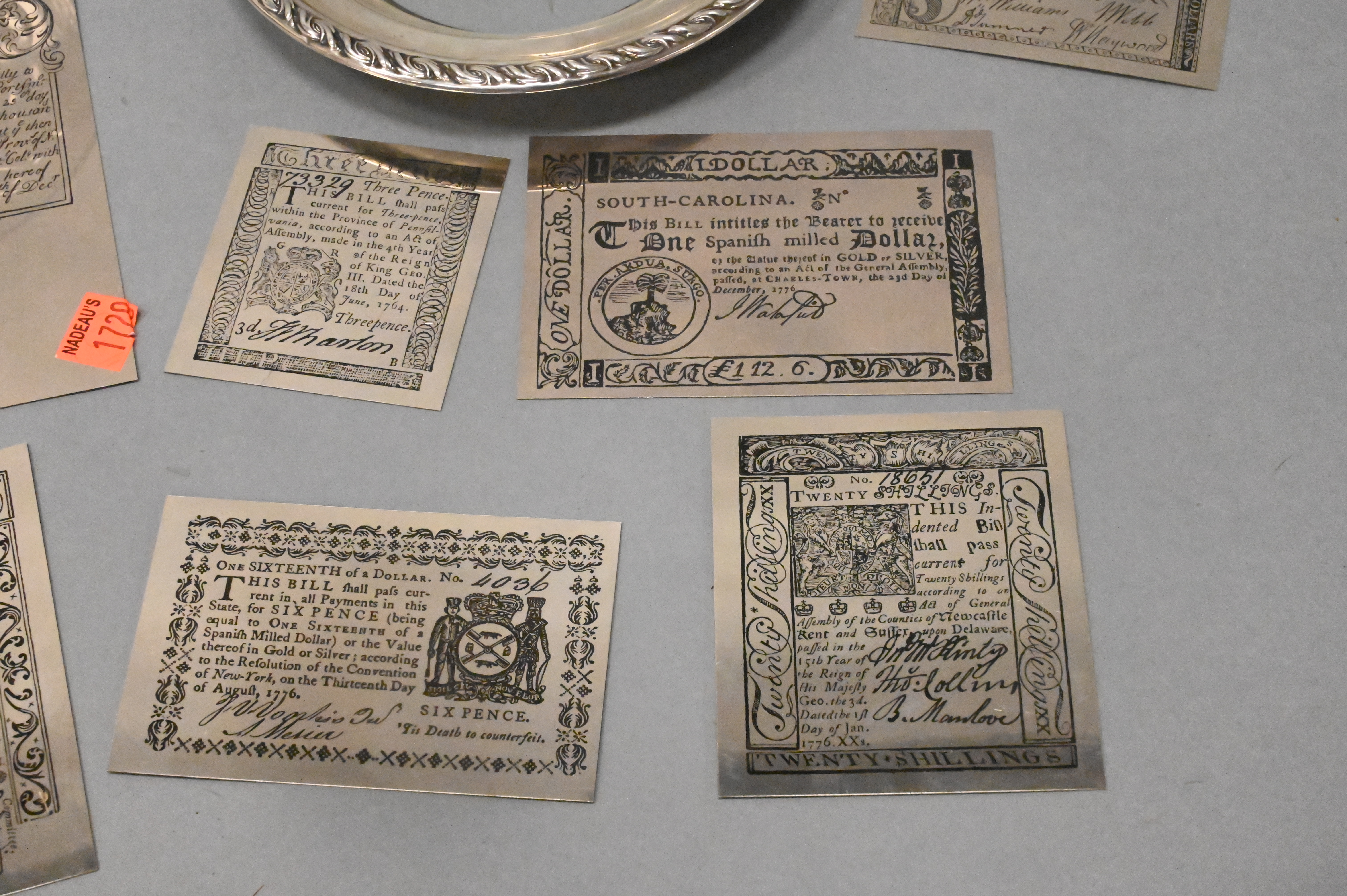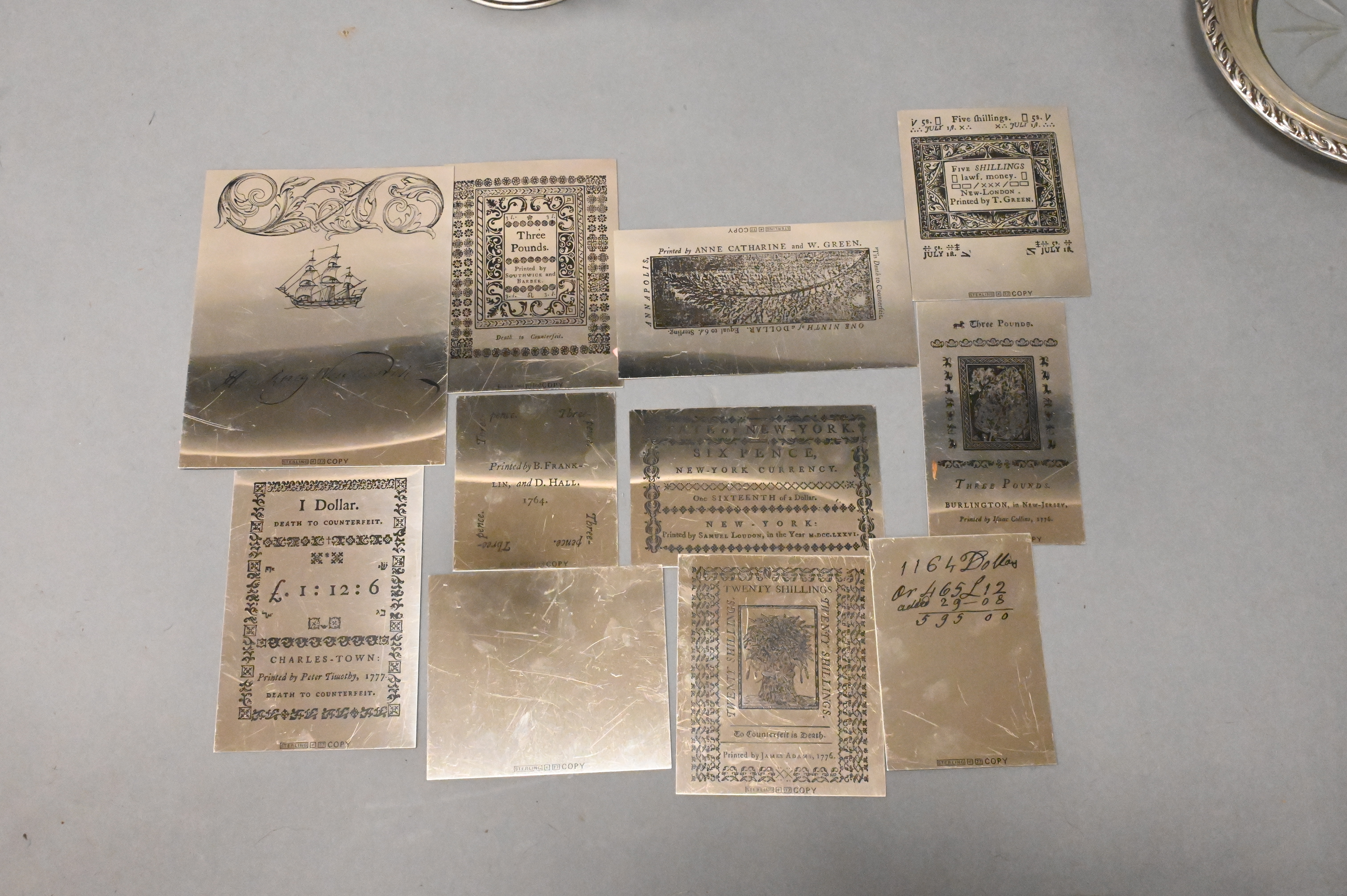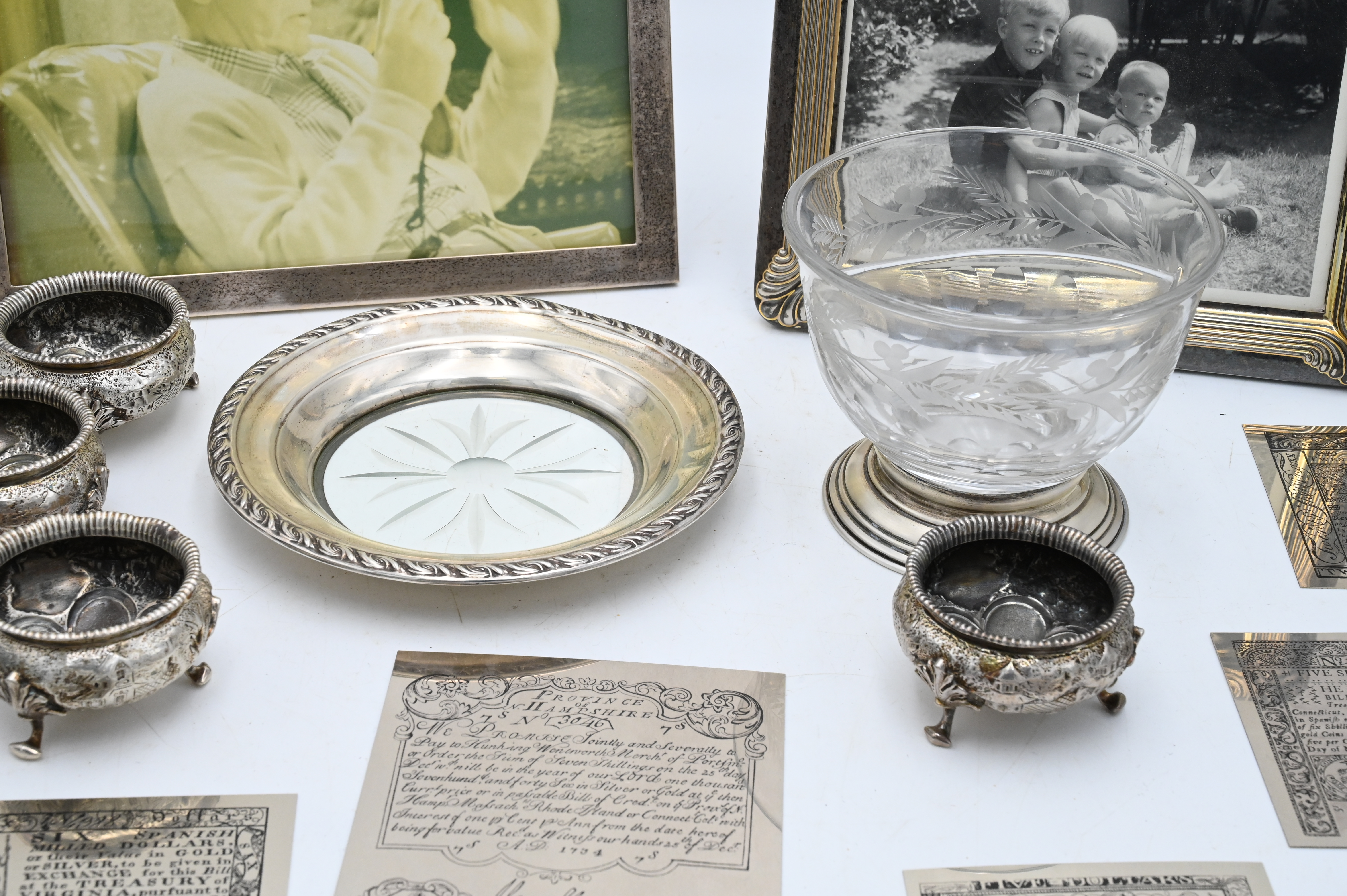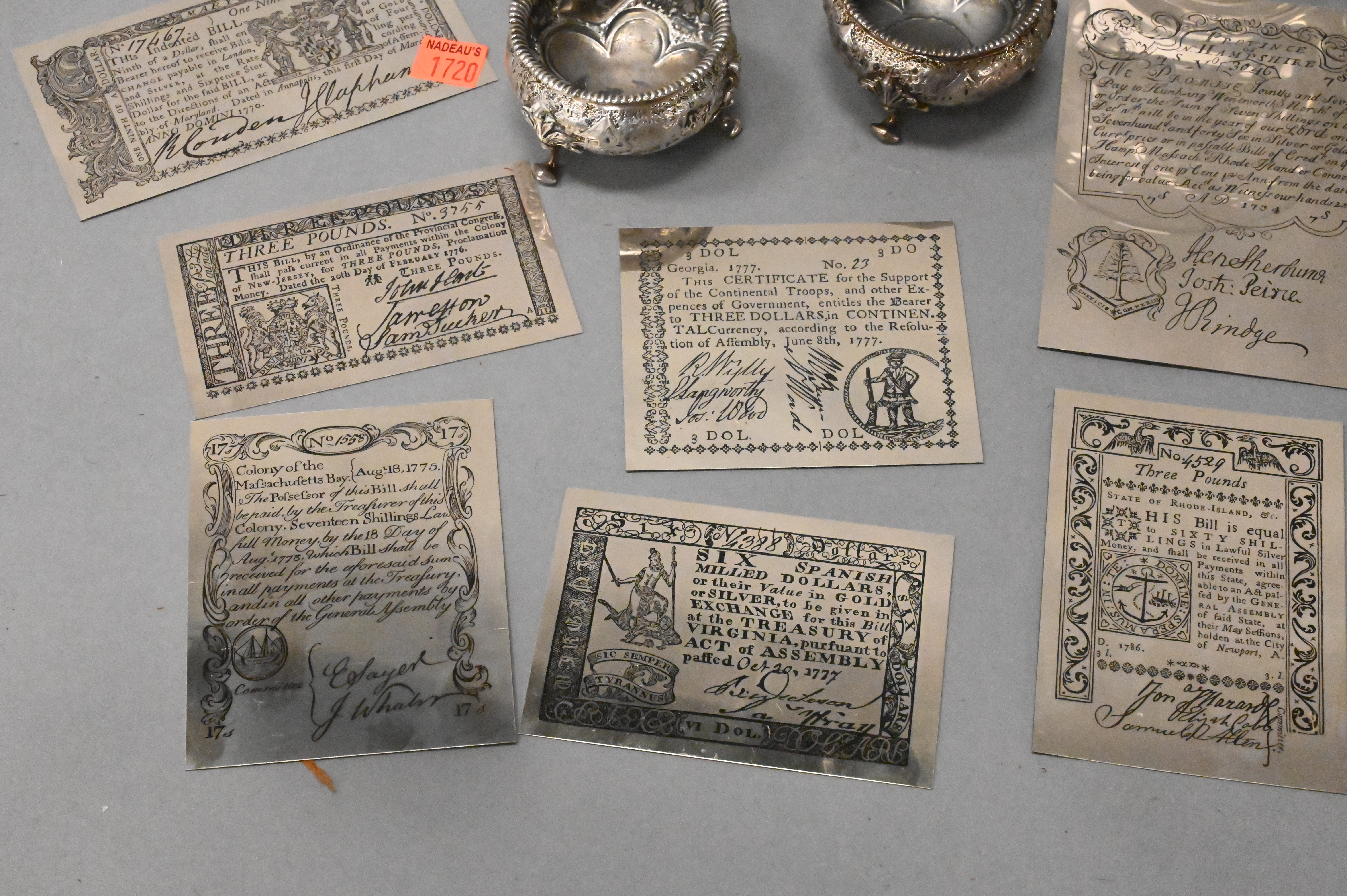 Group of Four Open Salts From Bailey and Co, with Japanese design, along with sterling silver copies of early paper money printing blocks, salt height 1 1/2 inches, diameter 2 1/2 inches, tallest object 4 inches, 17 t.oz.