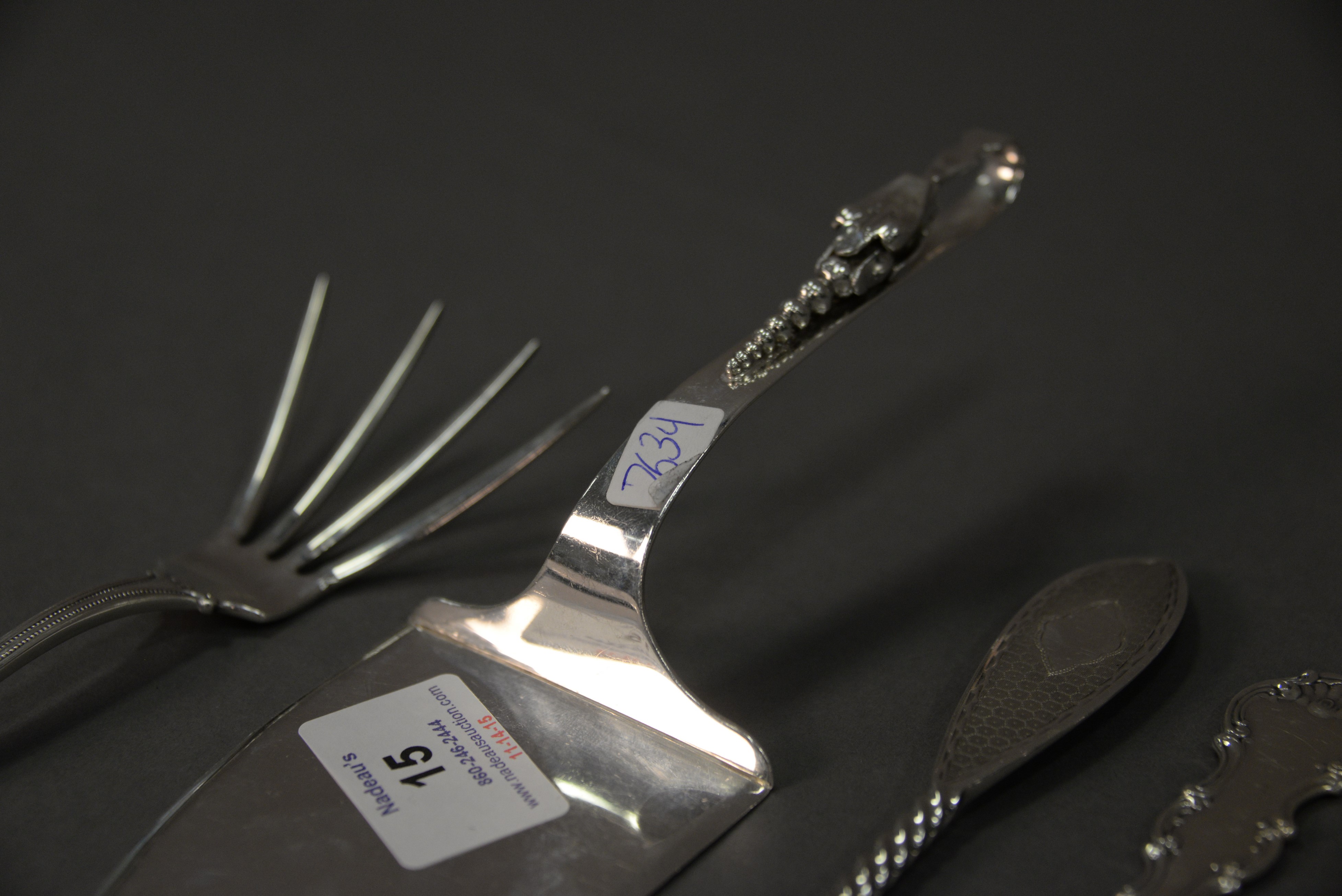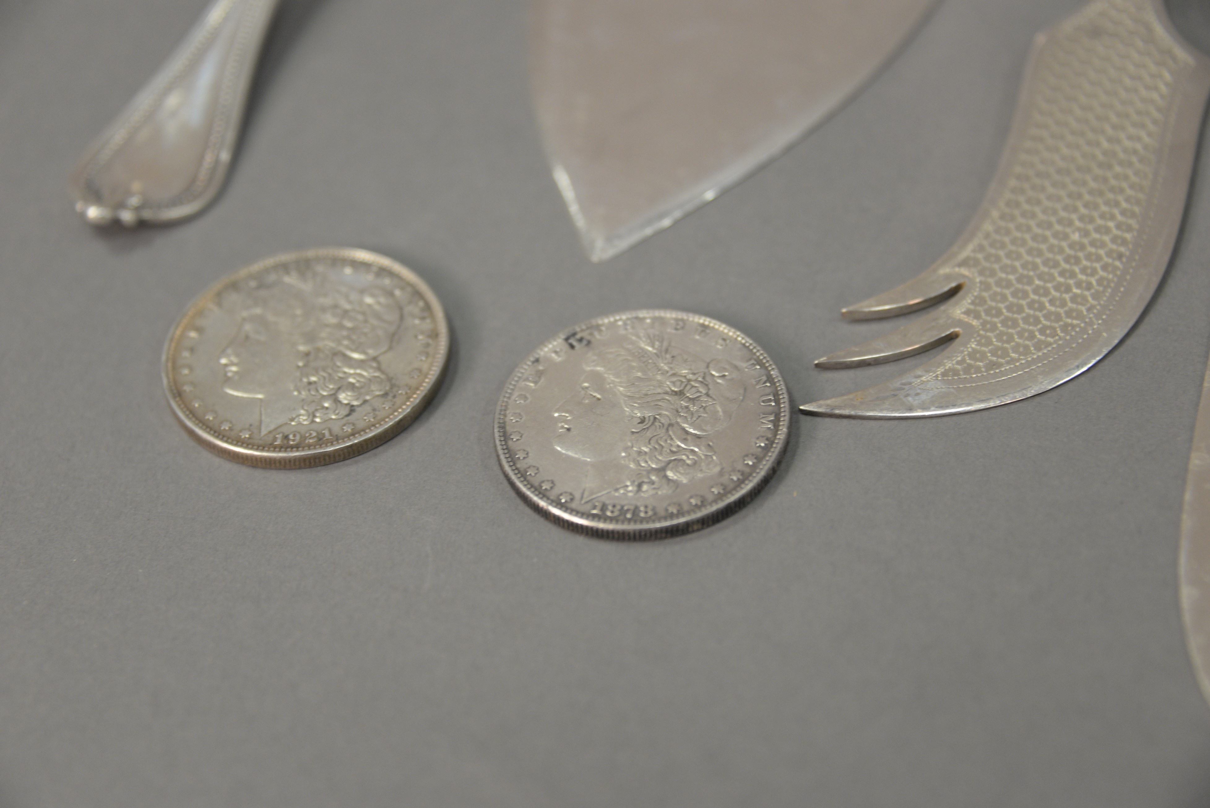 Lot 15: Group of silver to include two silver one dollar coins 1878 & 1921, and four serving pieces. 11.42 t oz.