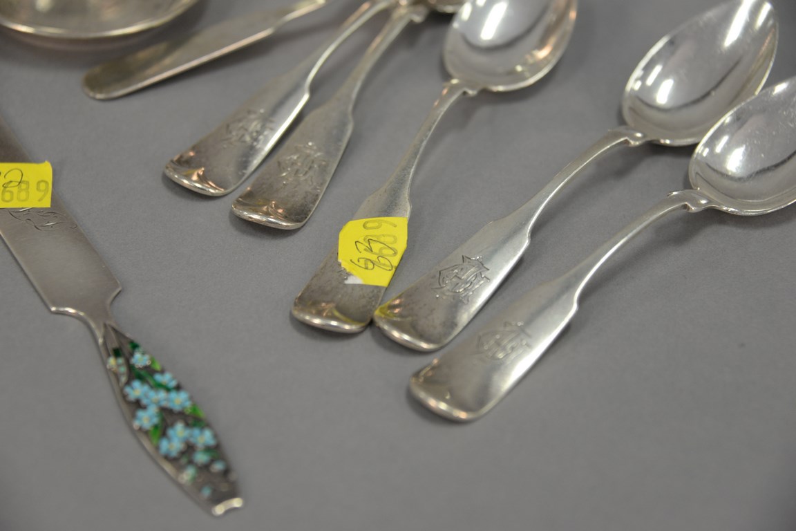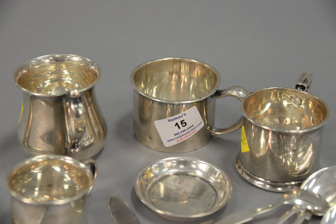 Lot 15: Group of sterling to include four mugs, enameled letter opener, set of six spoons, candle snuffer, etc. 17.7 t oz. weighable silver