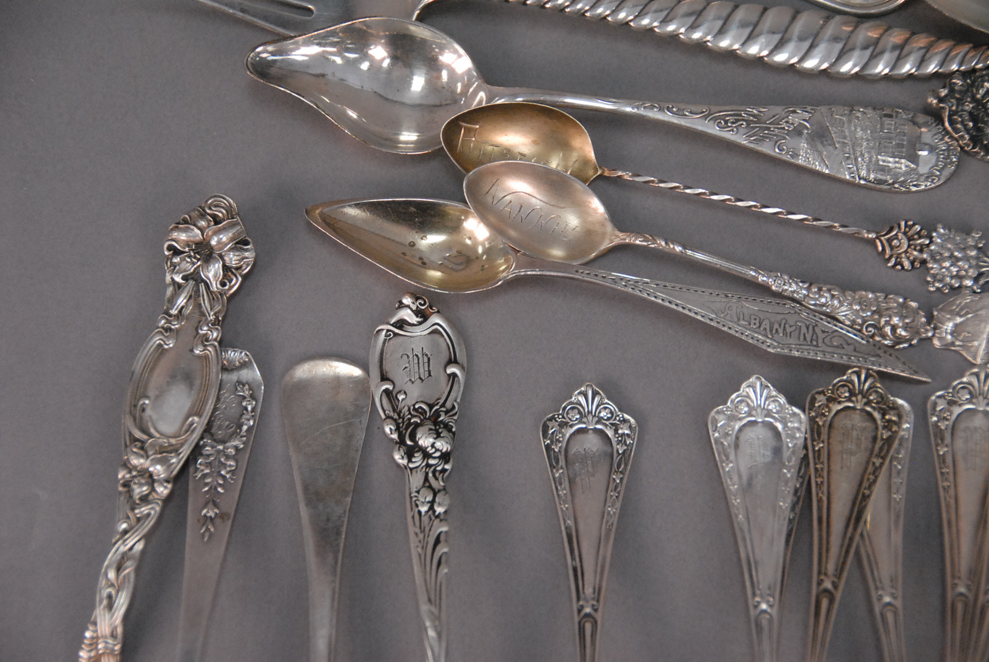 Large group of sterling spoons, demitasse spoons and souvenir spoons, 20.4 t. oz.