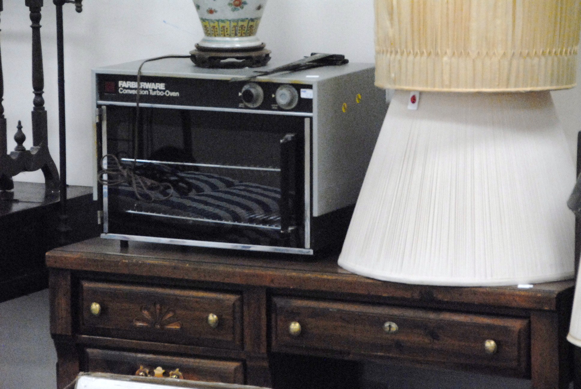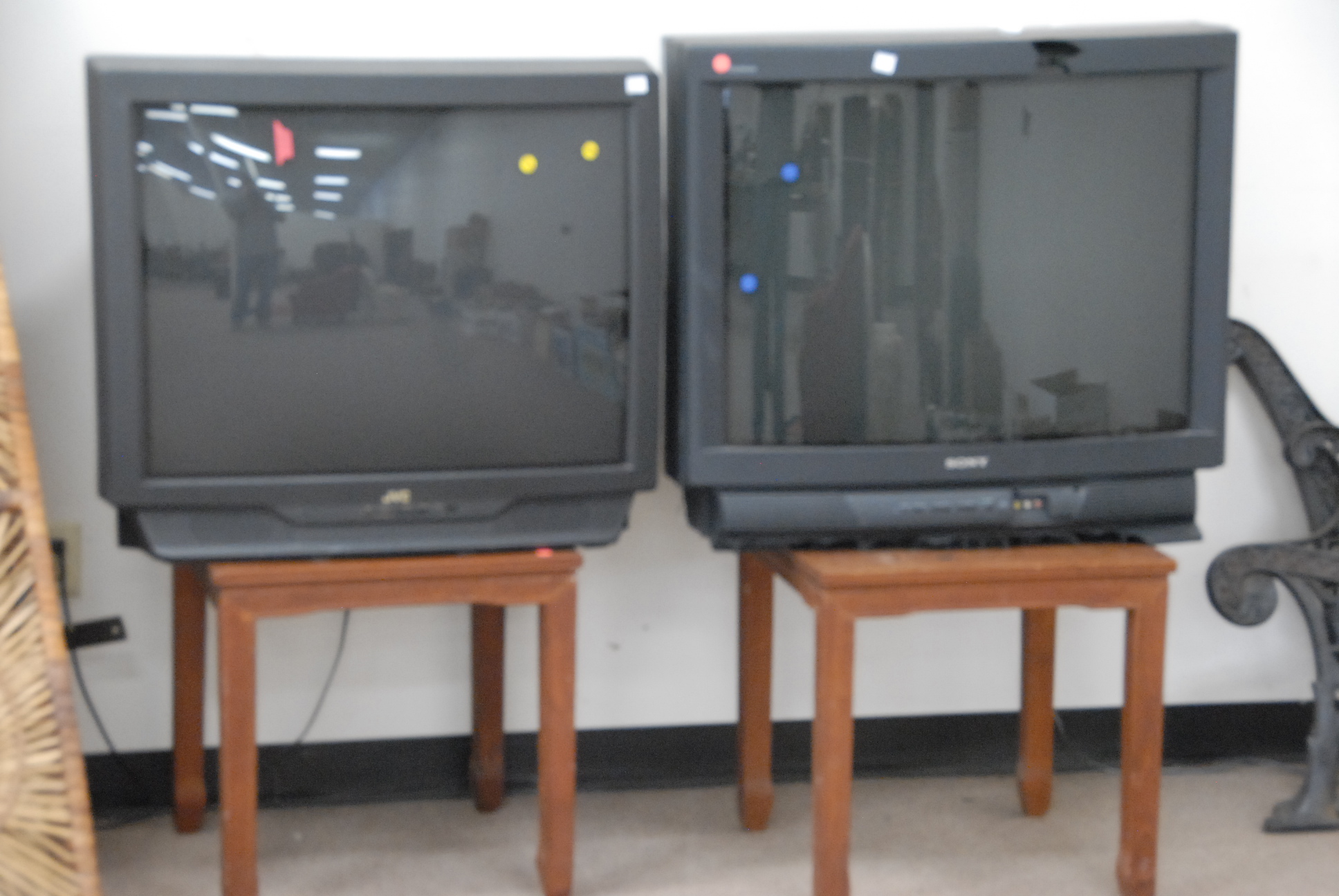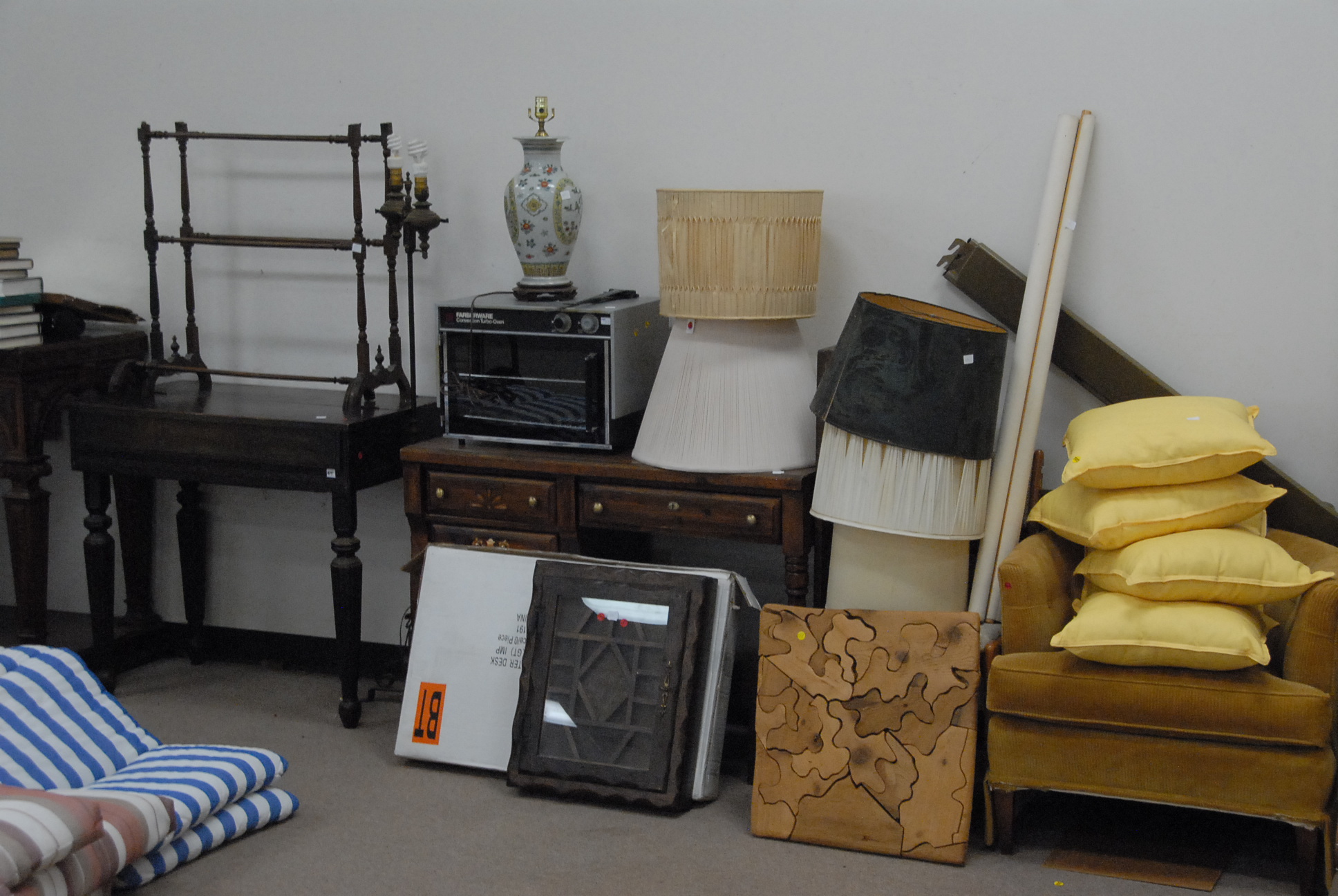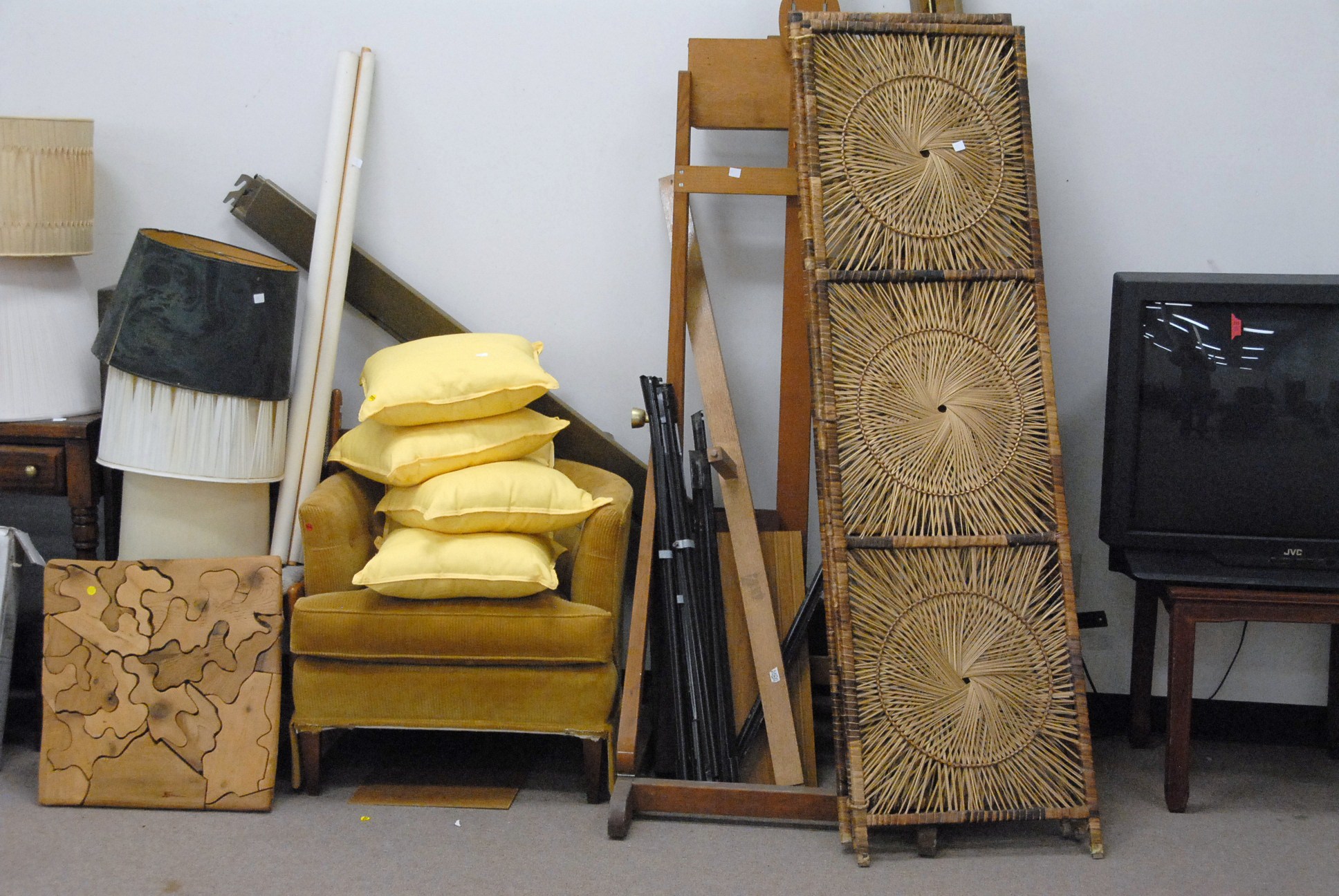 Large grouping including TVs, an easel, couple of chairs, spinet desk, modern desk, table lamp, floor lamp, lamp shades, pillows, and a couple of iron ends for a park bench, etc