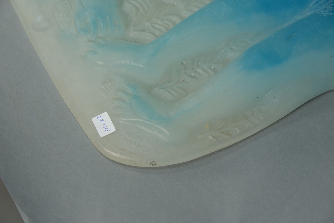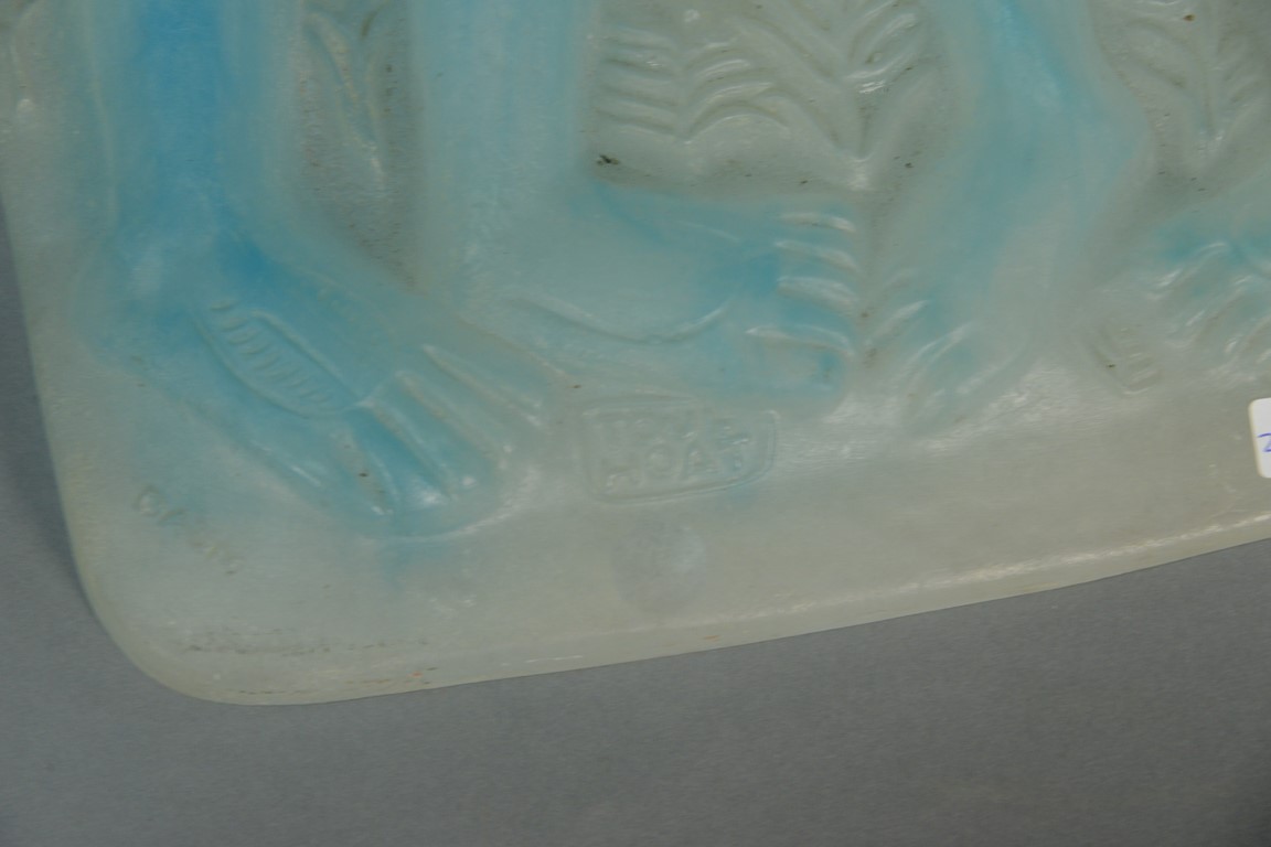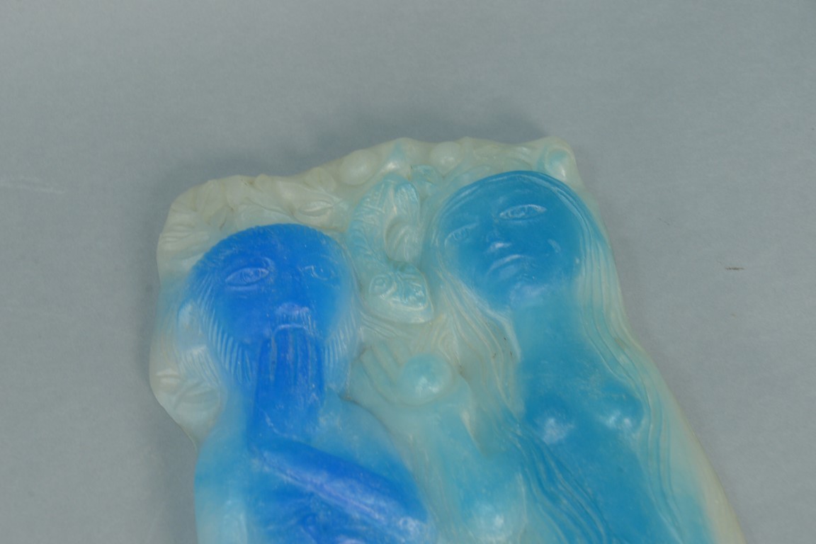 Lot 15: Pierre Toulhoat for Daum blue, green, and frosted glass pate-de-verre figural plaque Paradis Adam and Eve marked: Daum Toulhoat…