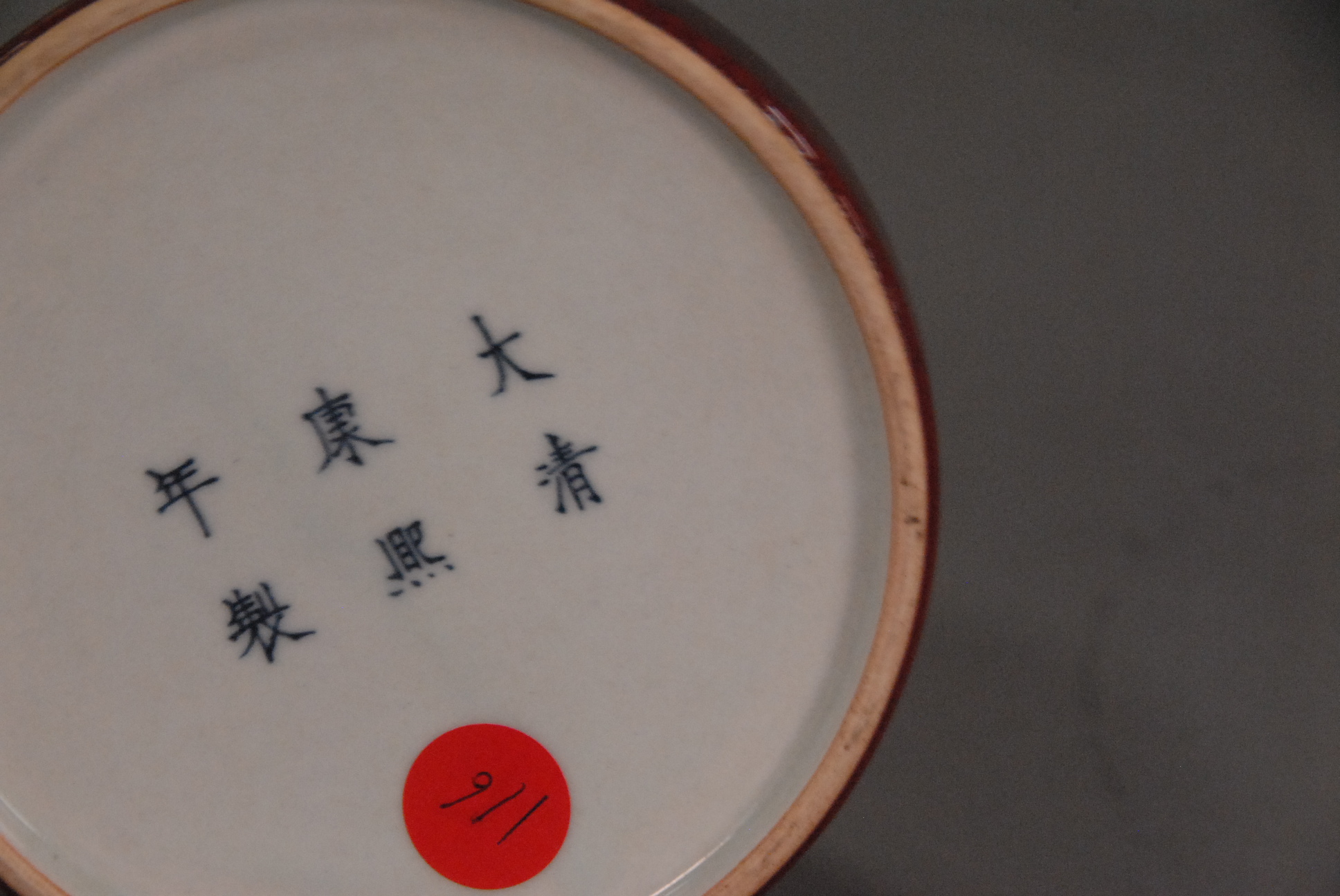 Red flamb glazed peach bloom water pot with incised dragons marked on bottom with six characters.