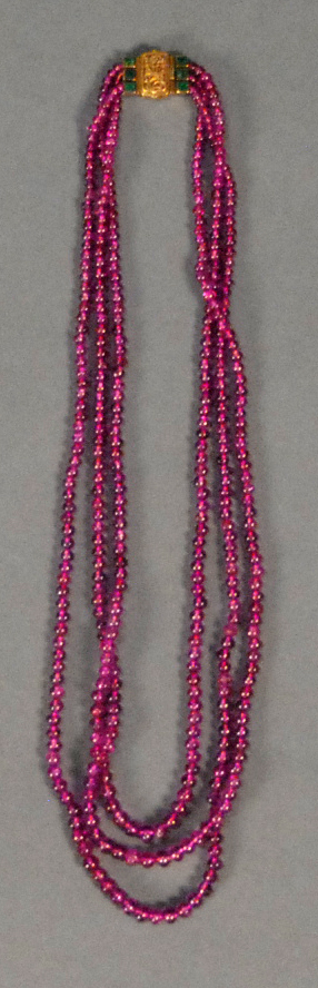 Lot 15: Ruby necklace composed of three graduated strands of bead rubies, average size of these round rubies is 3mm-4.5mm and the strands measure by average 17, 18, and 19, necklace has an 18K yellow gold clasp set with 3 square cut emeralds on each side