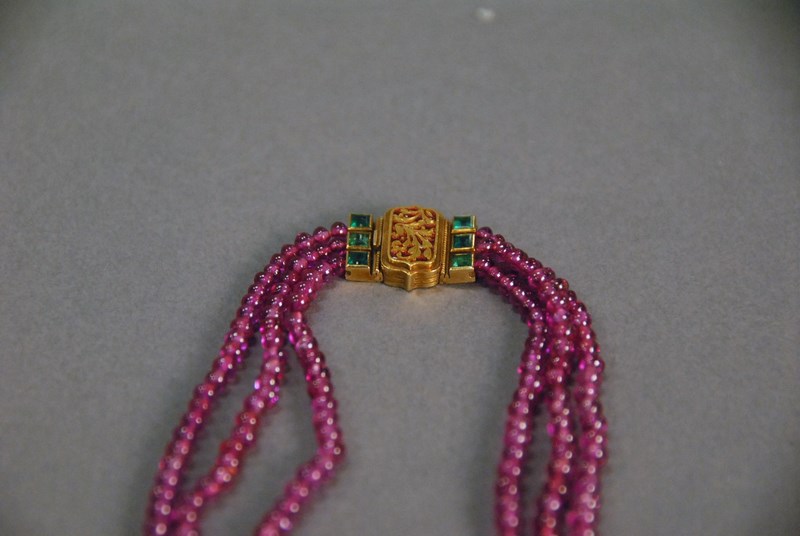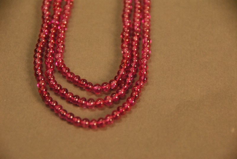 Lot 15: Ruby necklace composed of three graduated strands of bead rubies, average size of these round rubies is 3mm-4.5mm and the strands measure by average 17, 18, and 19, necklace has an 18K yellow gold clasp set with 3 square cut emeralds on each side