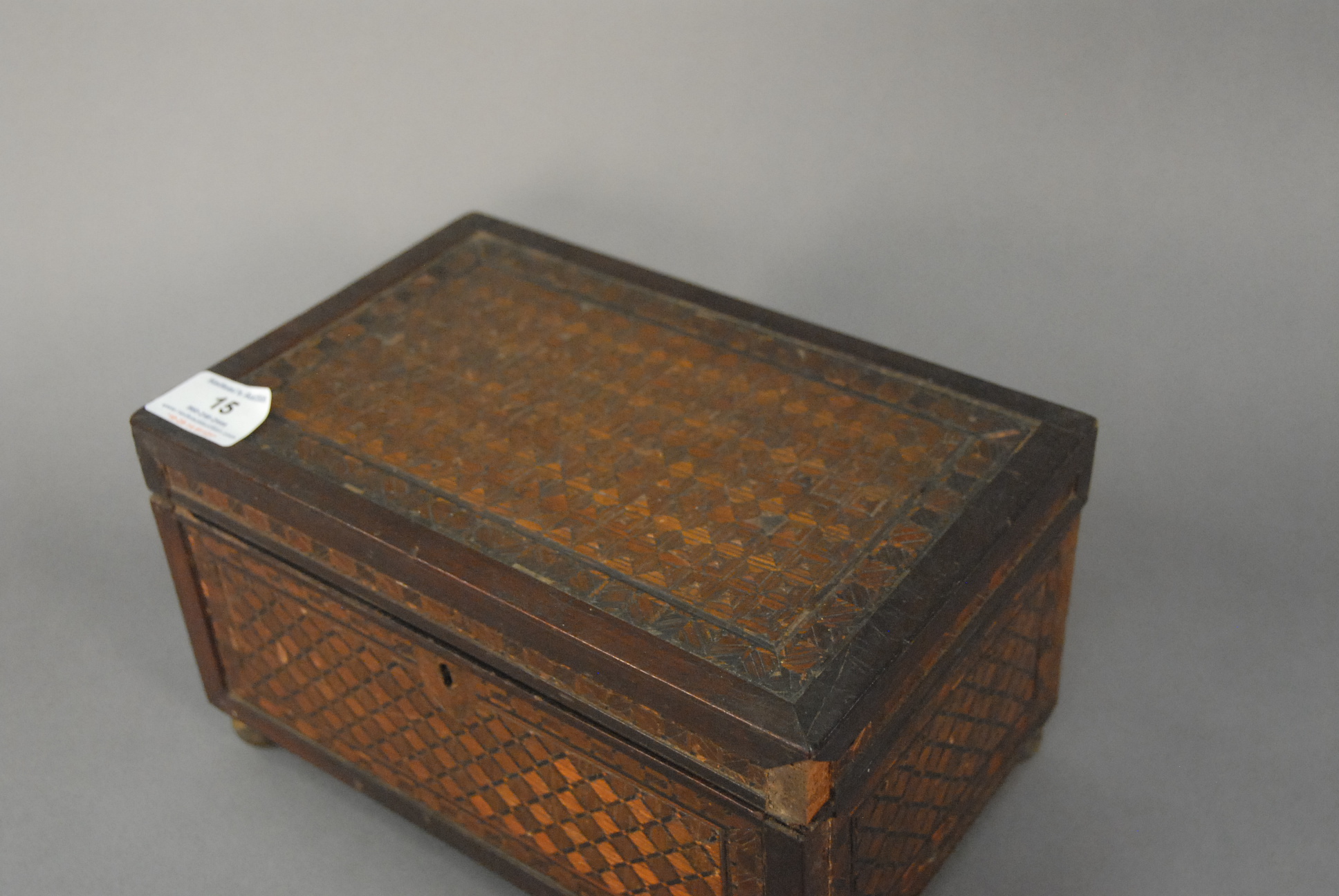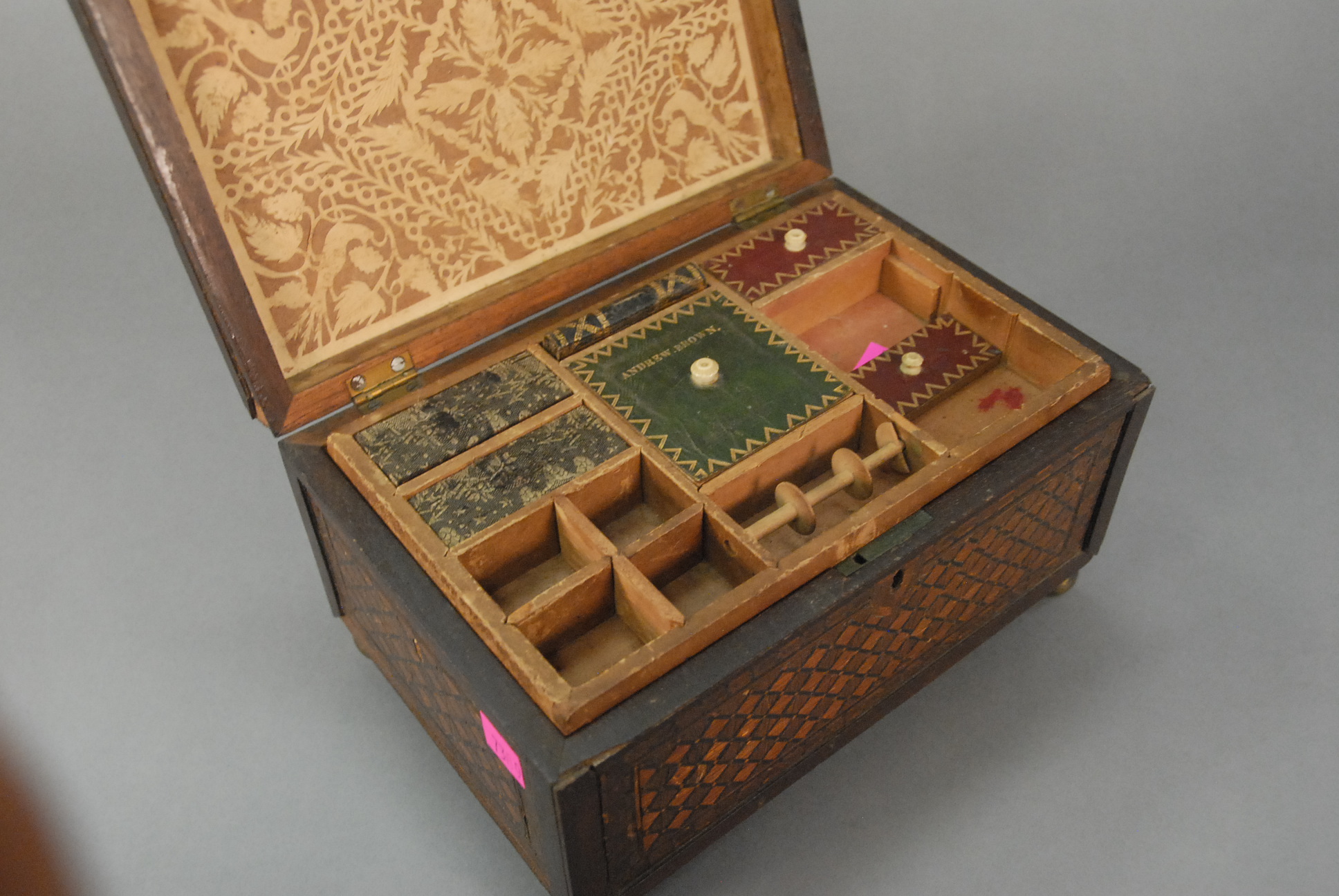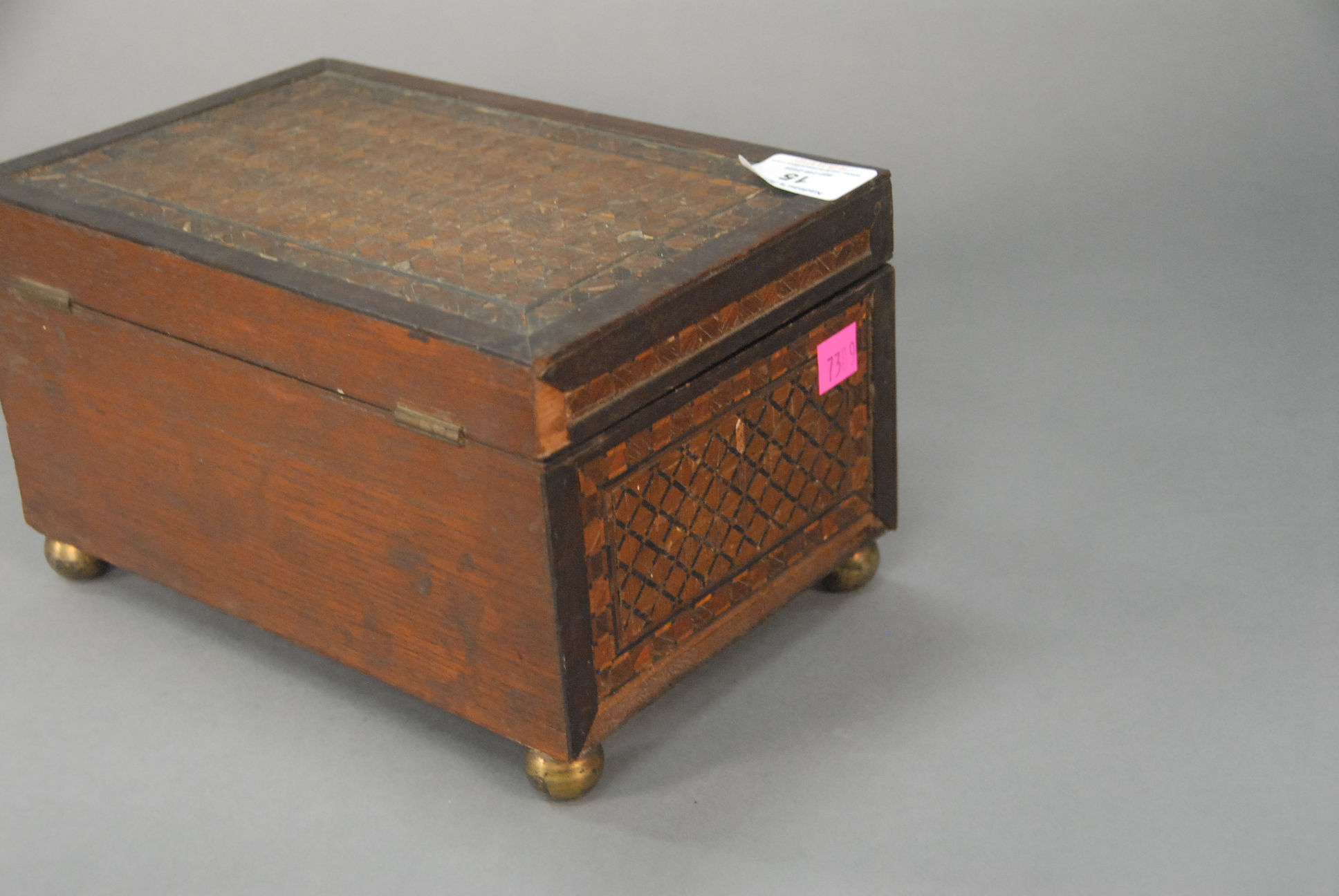Sewing box with woven panels and lift top set on brass ball feet, interior with leather and cloth top section, marked Andrew Brown losses at corner. ht. 5 3/4 in. wd. 10in.