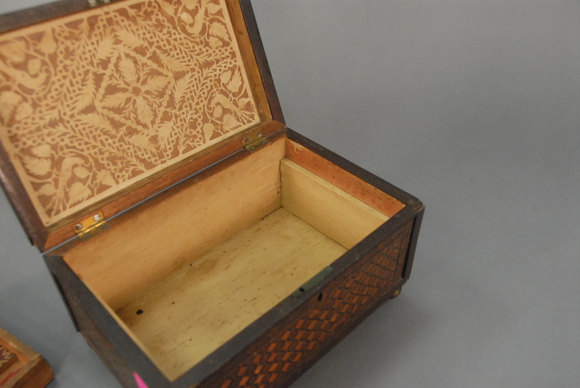 Lot 15: Sewing box with woven panels and lift top set on brass ball feet, interior with leather and cloth top section, marked Andrew Brown losses at corner. ht. 5 3/4 in. wd. 10in.