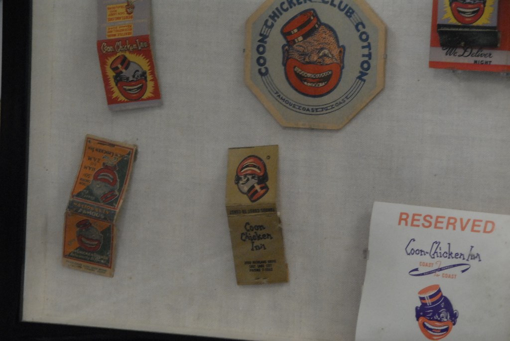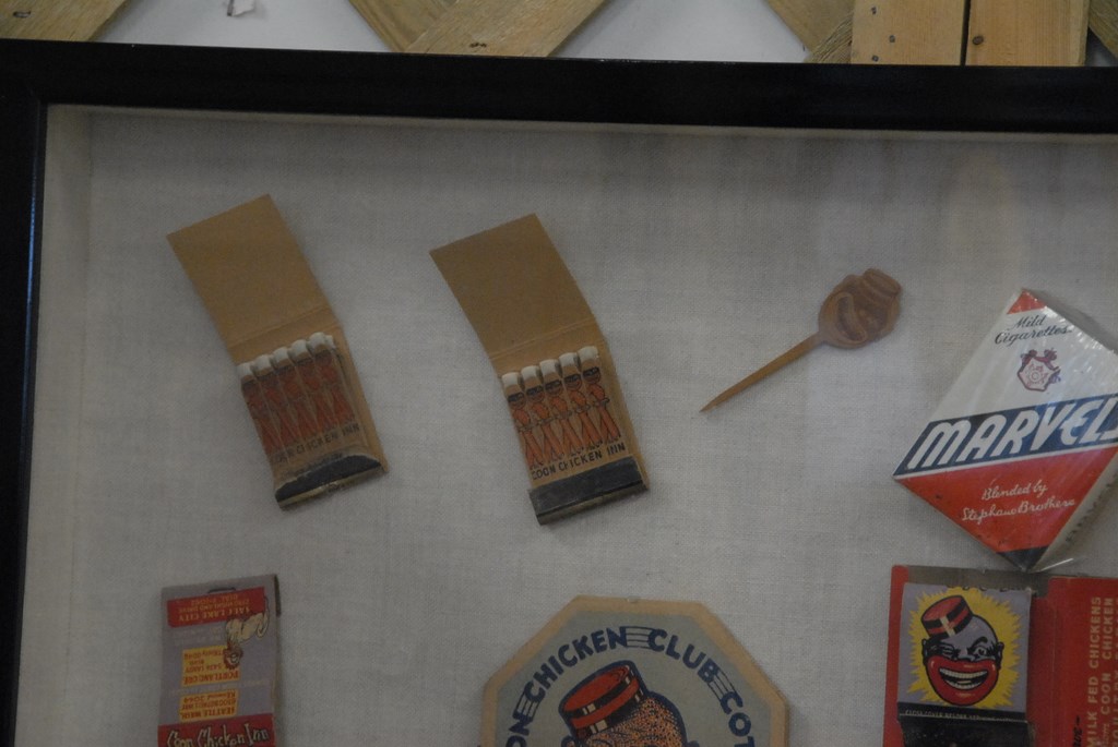 Small framed Coon Chicken collage with matches, drink coaster, tooth pick, etc., 17 x 17.