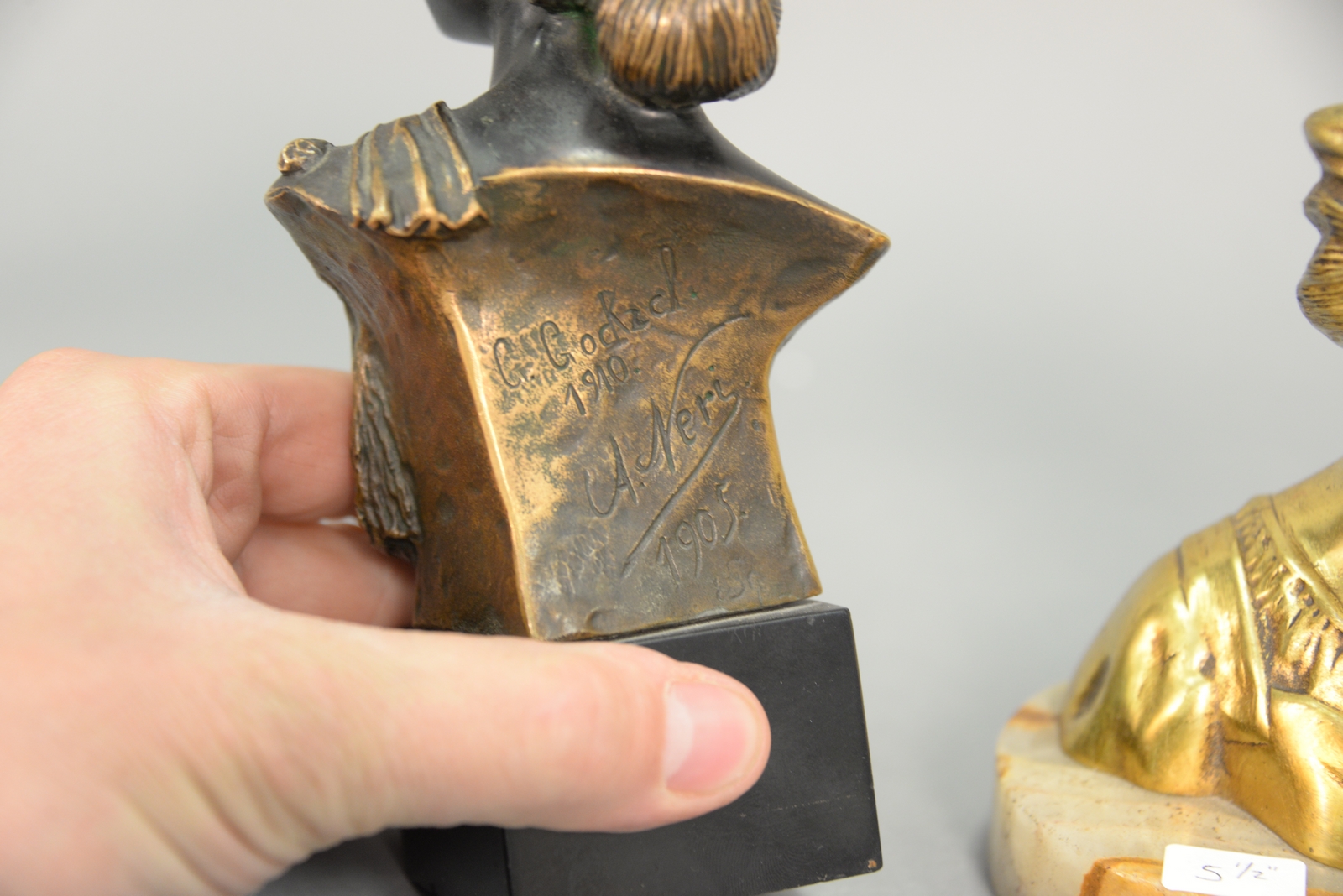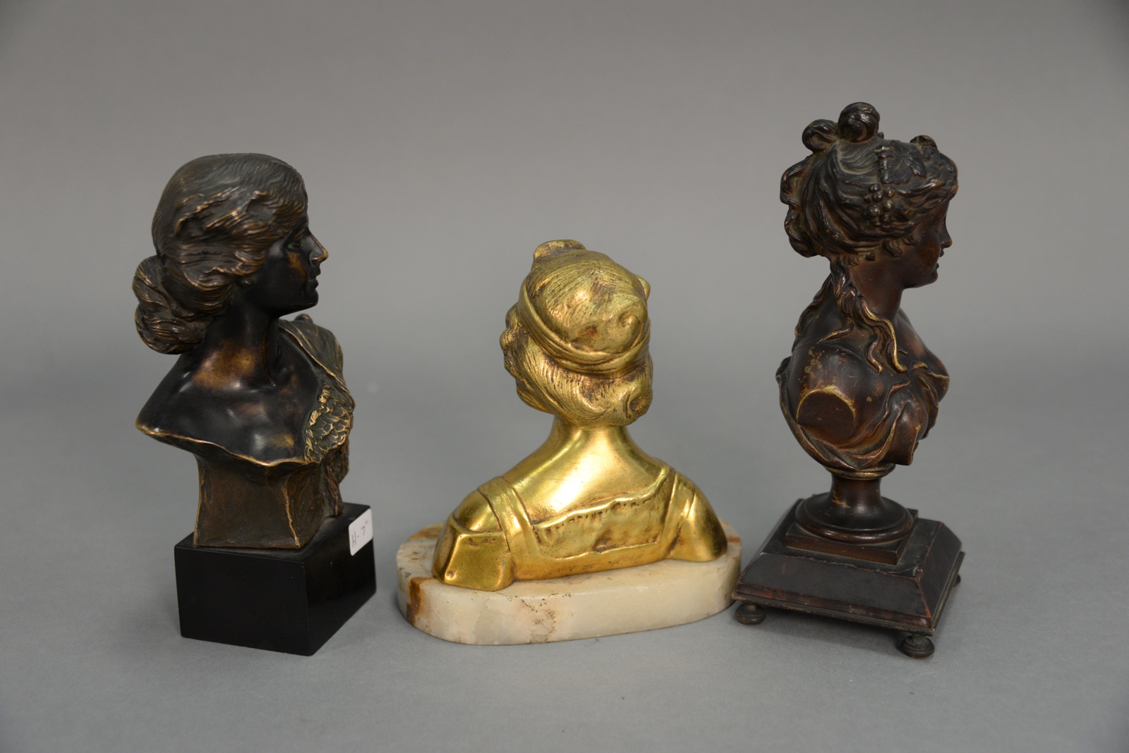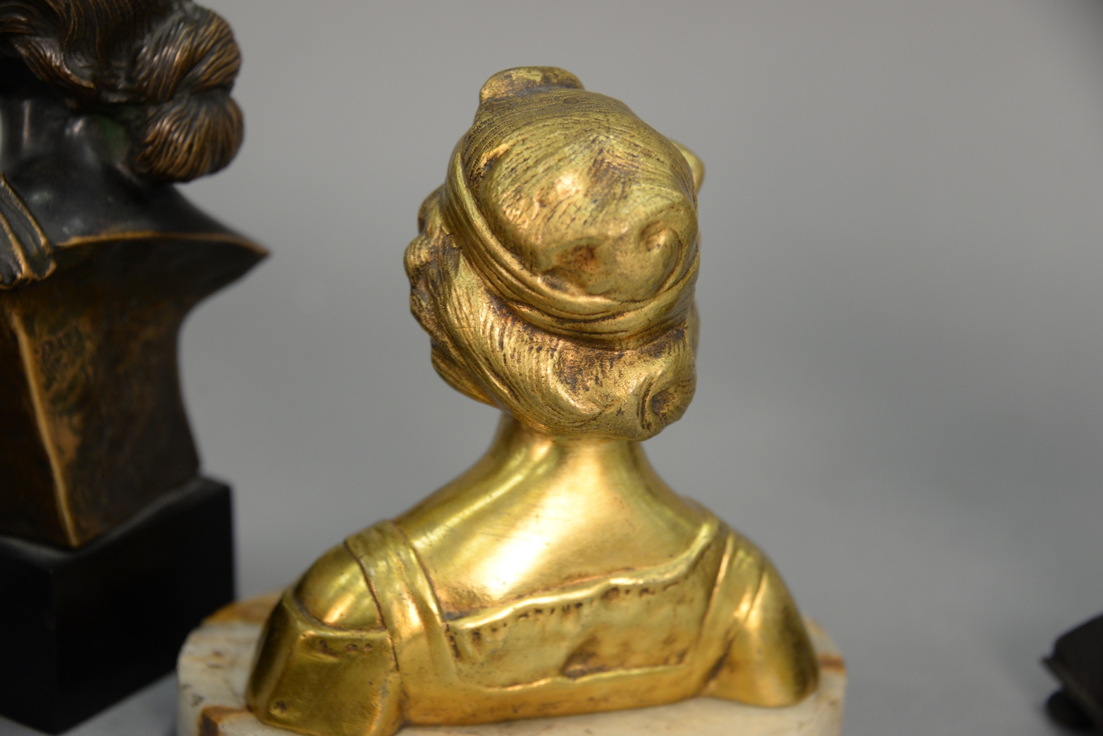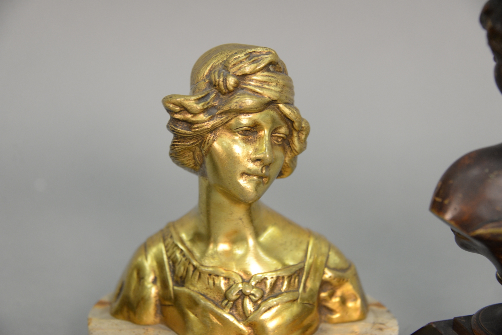 Three bronze busts of women including A. Neri art nouveau bust of a woman marked C. Gockzel 1910 A. Neri 1905 ht. 8in., Anfrie bronze bust of a young woman marked on back Anfrie ht. 7in., and a gilt bronze bust of a girl ht. 5 1/2in..