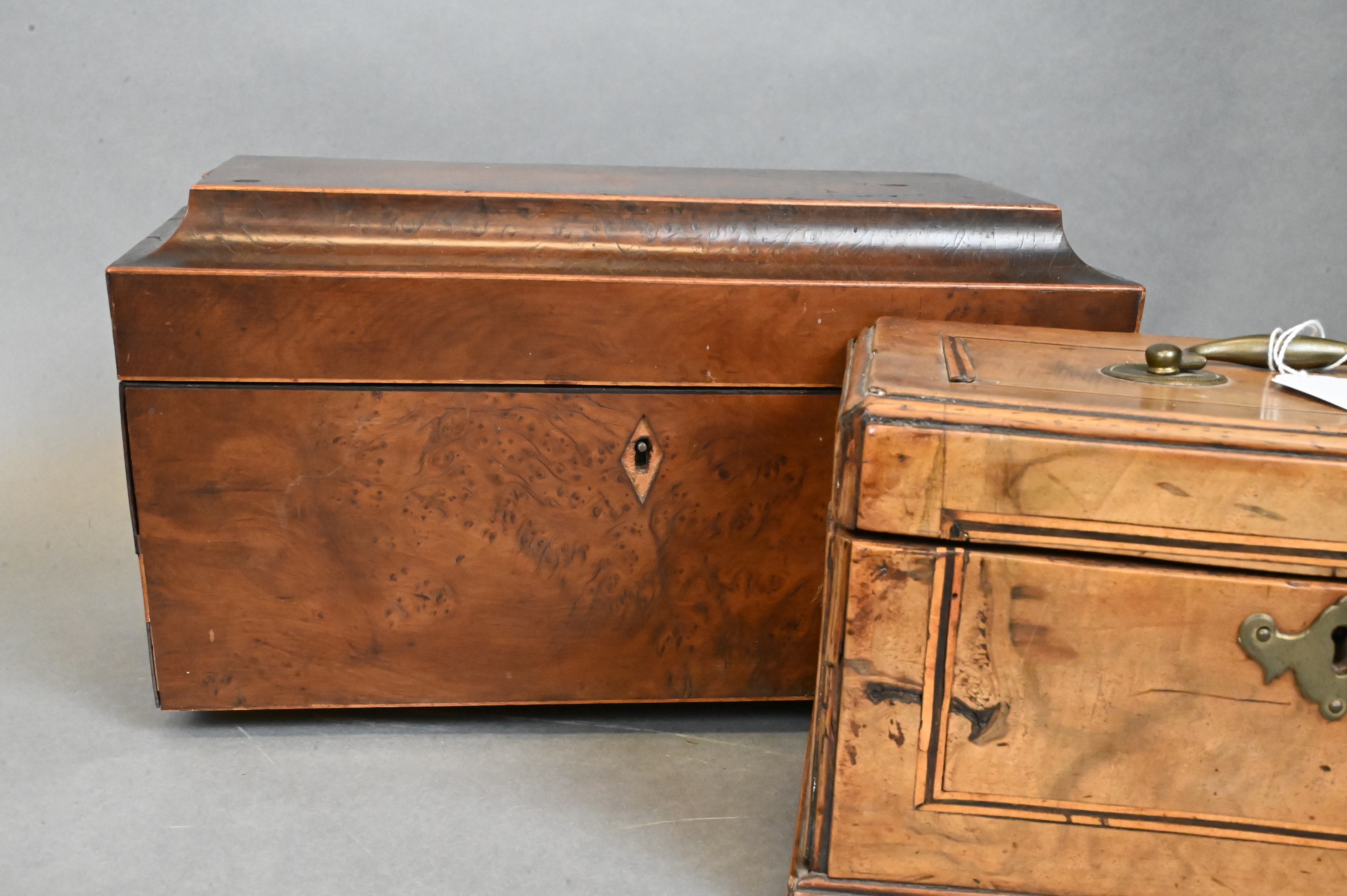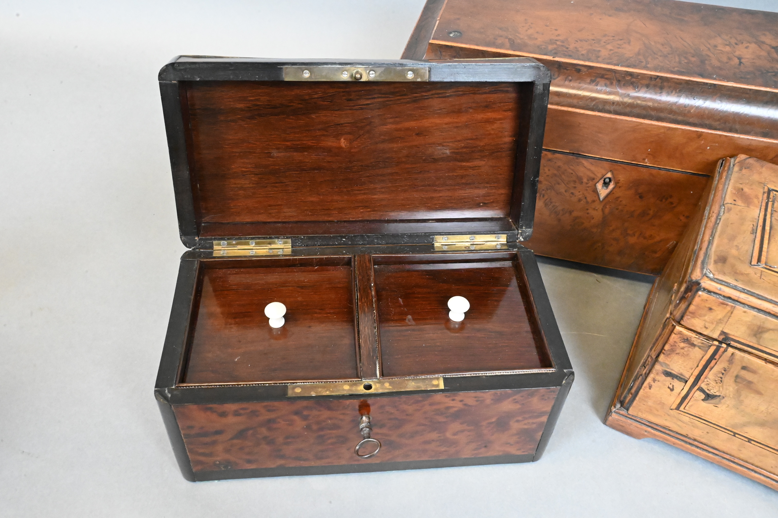 to include Regency brass bound burlwood and ebonized inlaid caddy opening to two lidded compartments, sarcophagus form burlwood caddy (one foot missing), brass bound and inlaid box with three compartments