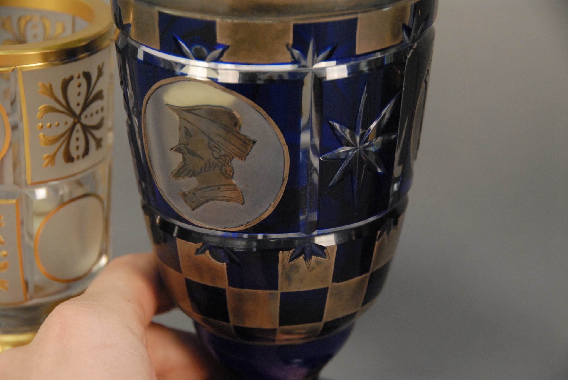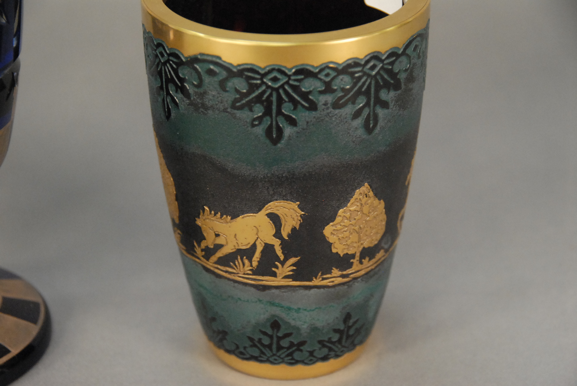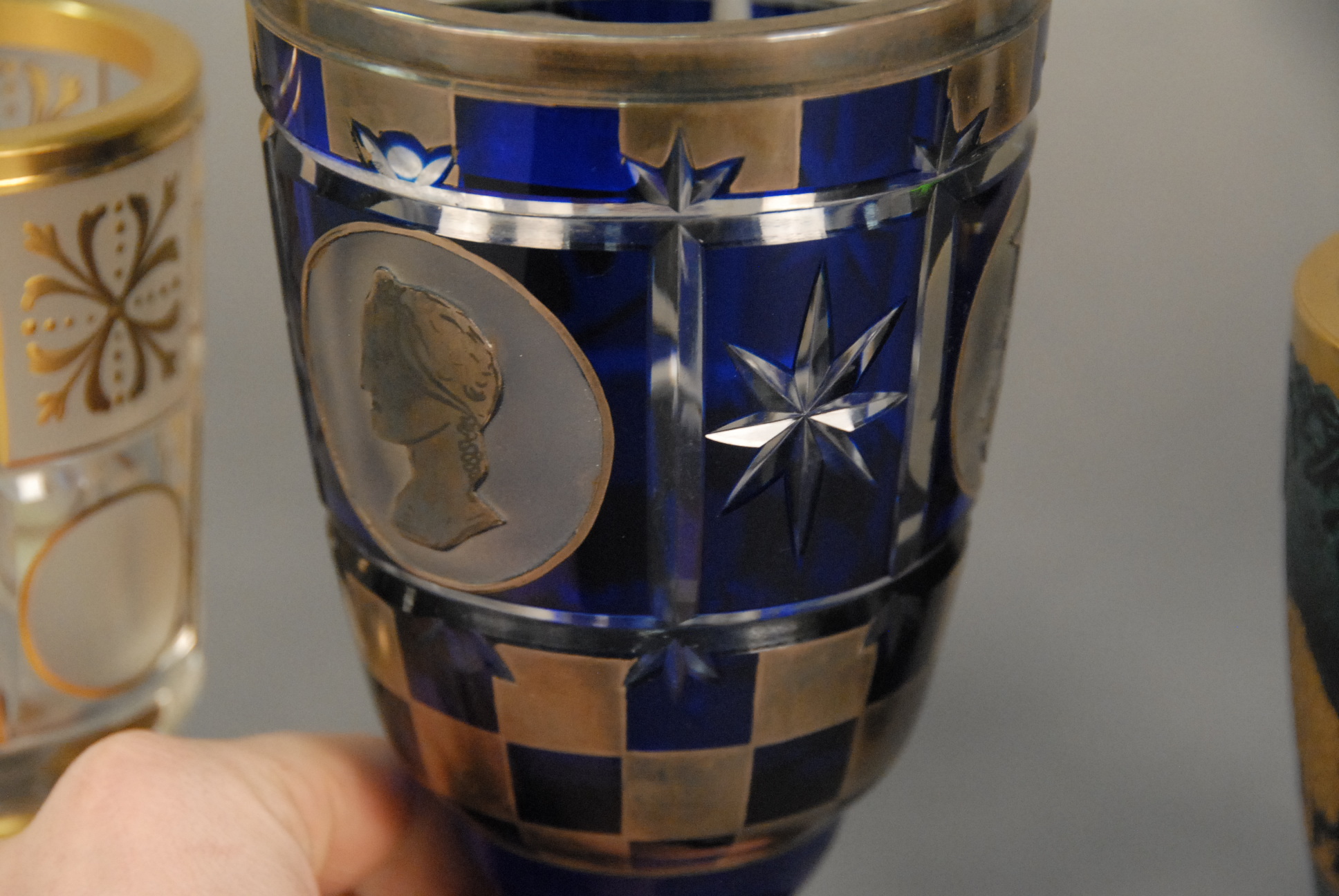 Three Moser type vases, one etched with silver overlay, hts. 5in., 6in., & 8in.