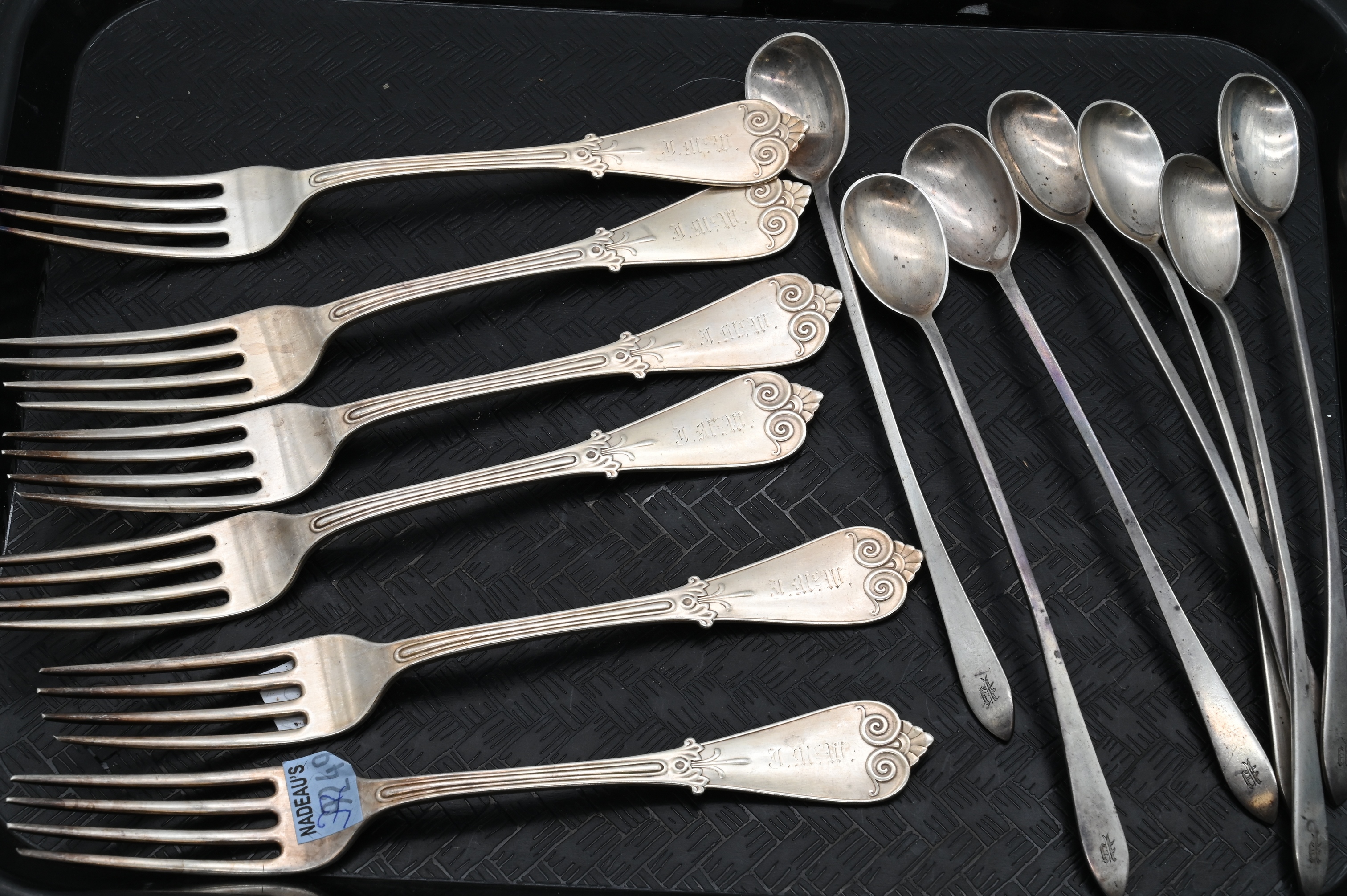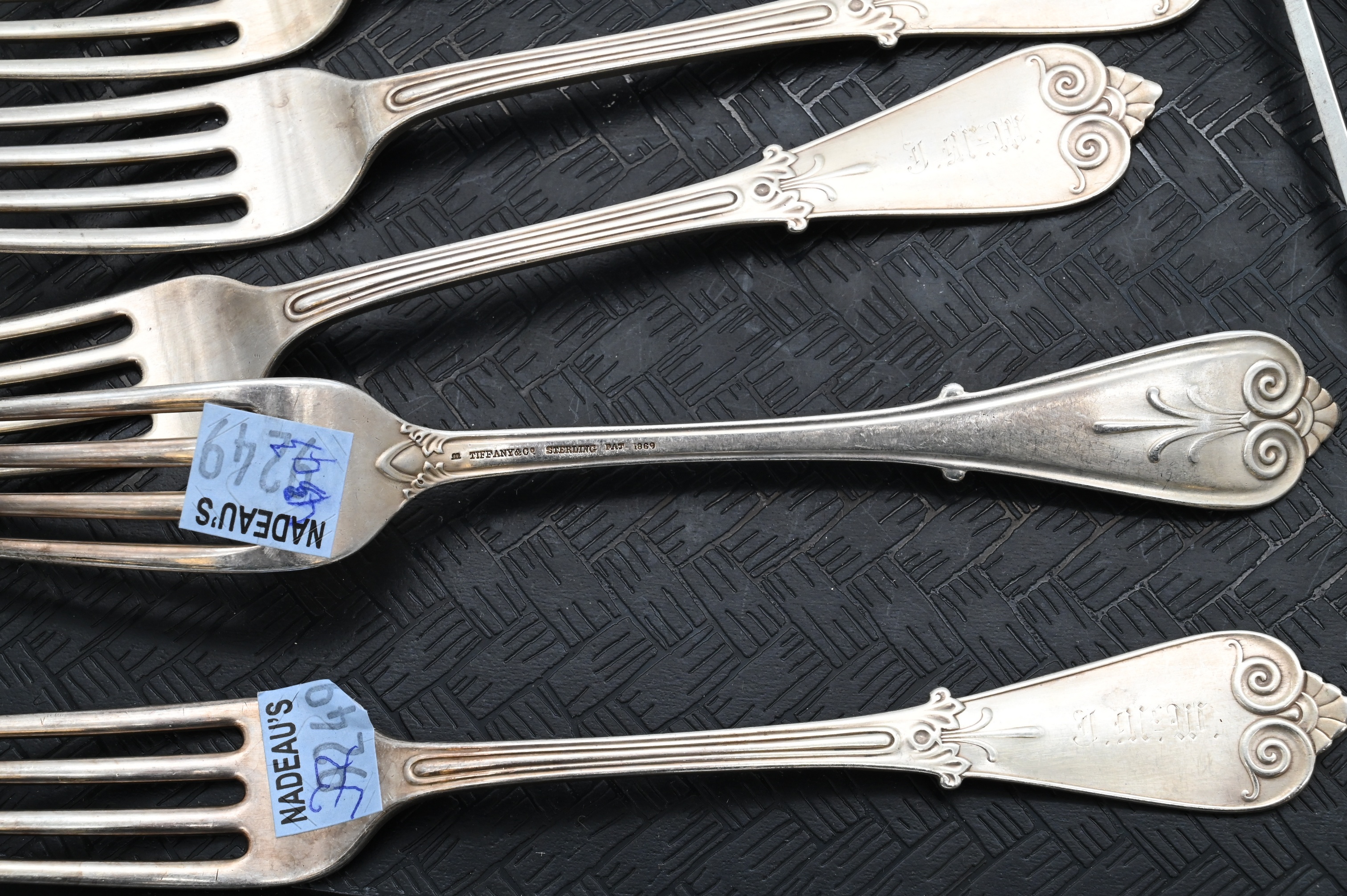 to include six dinner forks in Tiffany Sterling 1869 pattern with two side knobs, along with seven ice tea spoons in Faneuil pattern