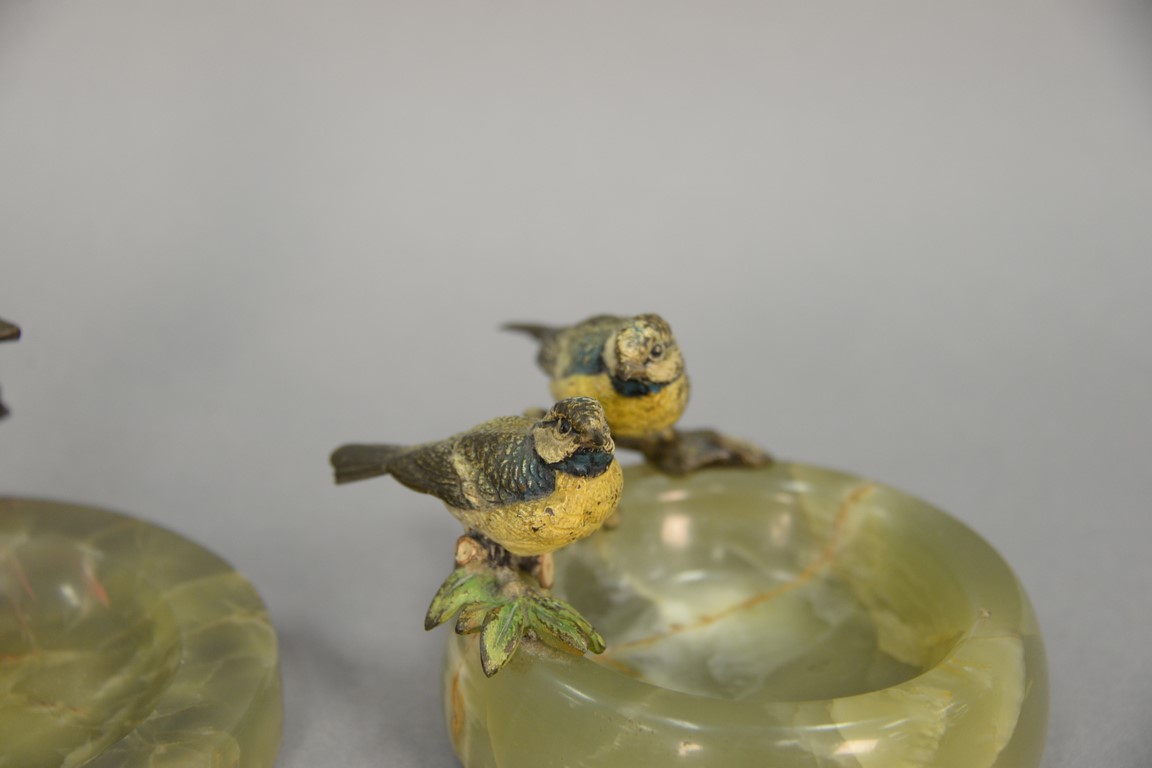 Lot 15: Two bronzes with alabaster trays including Austrian cold painted birds with round tray ht. 3 and a bronze of a young girl with sh…