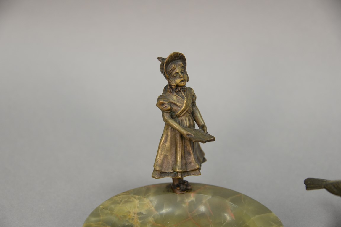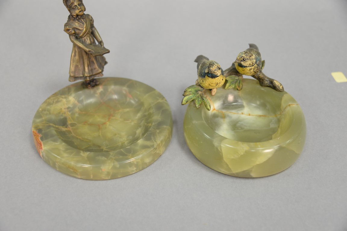 Two bronzes with alabaster trays including Austrian cold painted birds with round tray ht. 3 and a bronze of a young girl with sheet music on alabaster tray edge ht. 5.