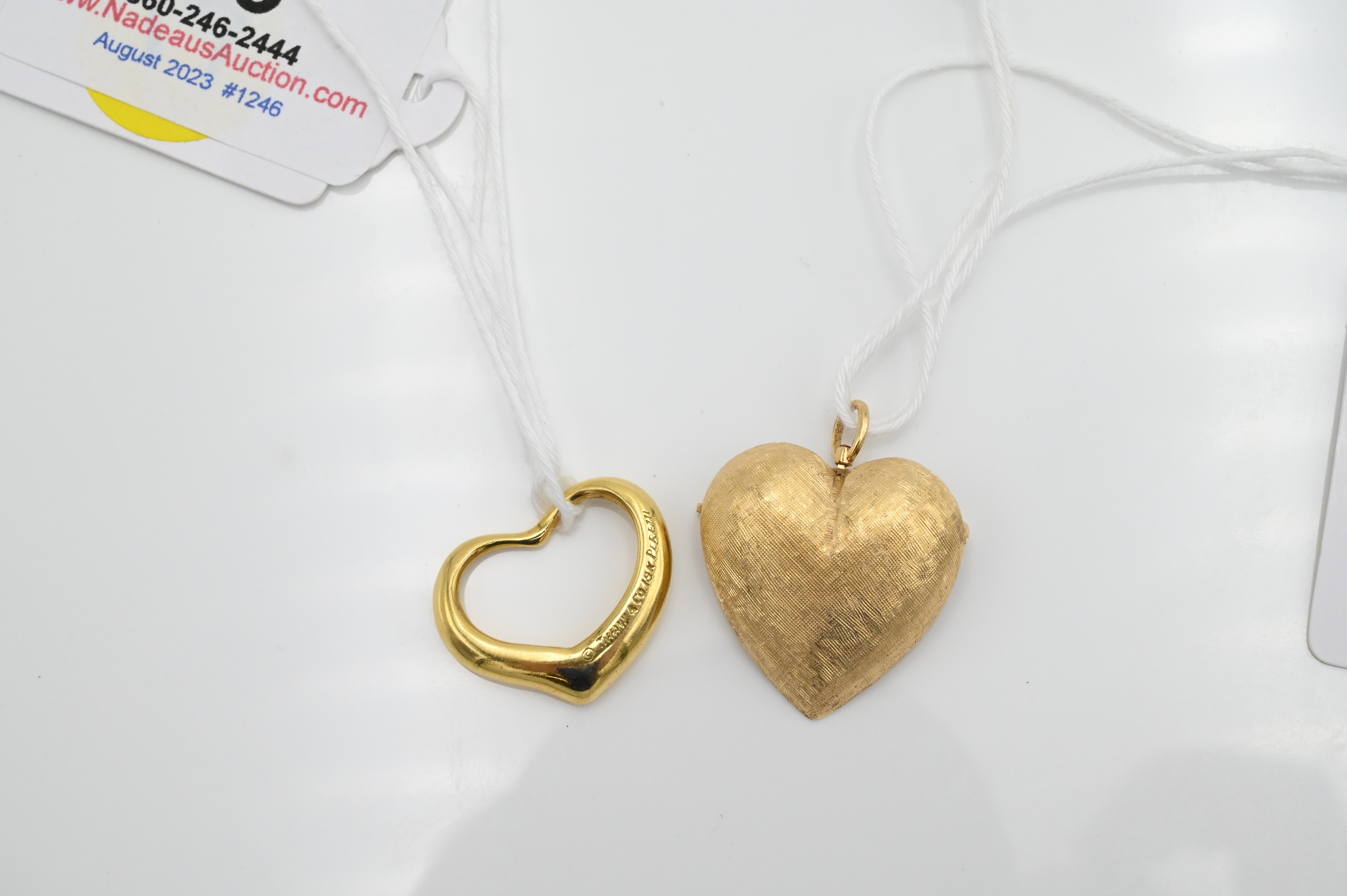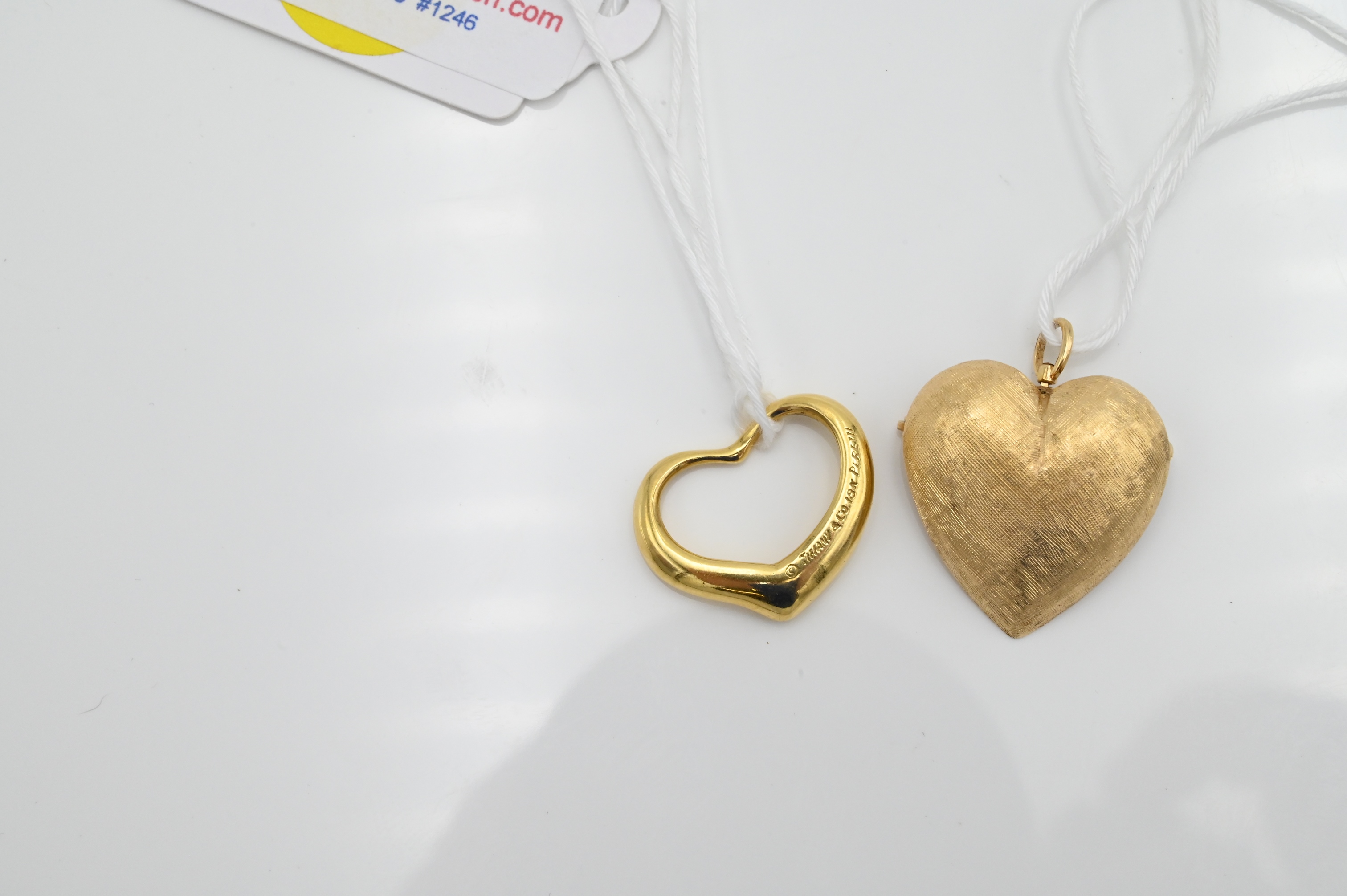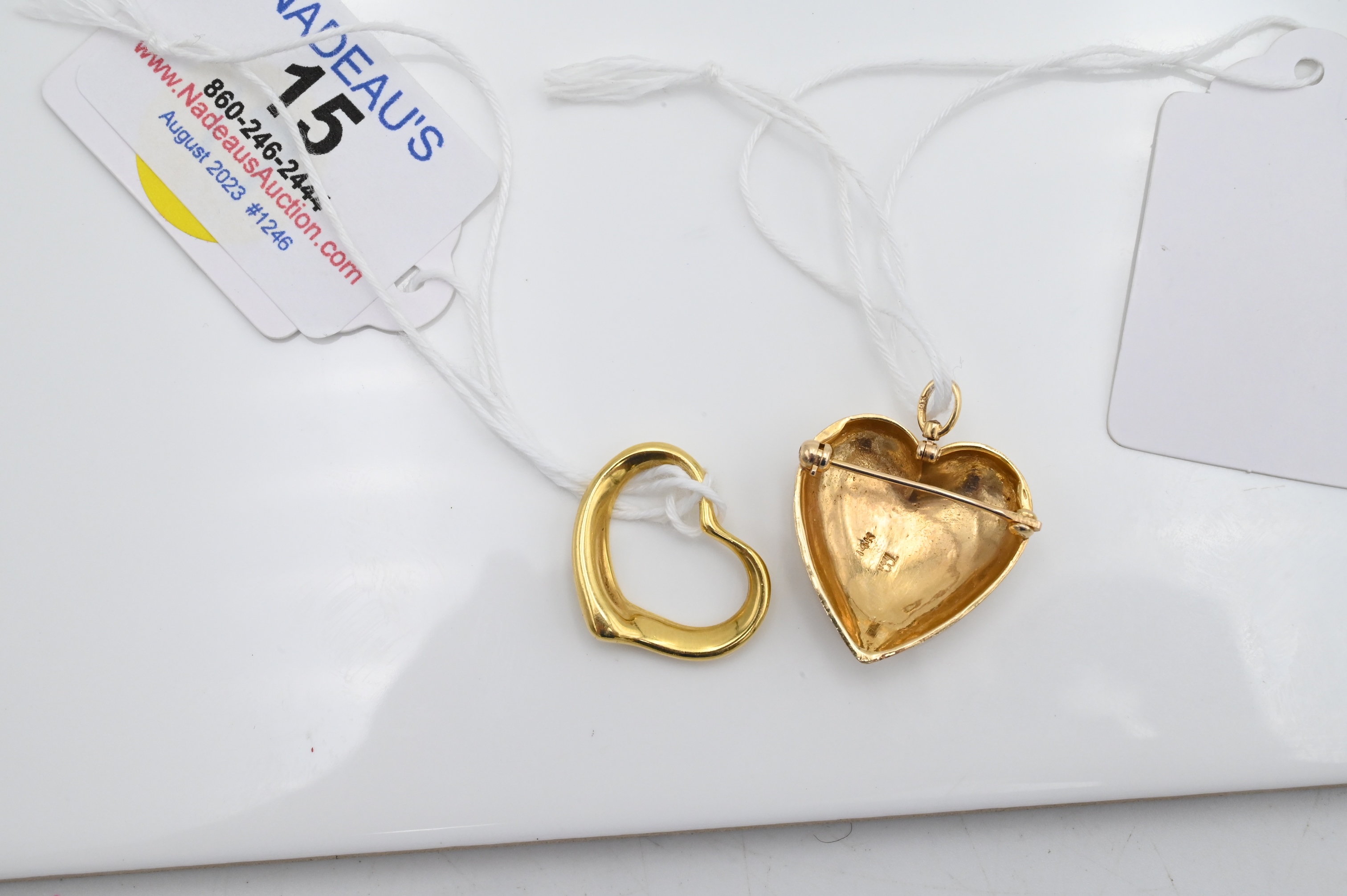 Two Heart Shaped Pendants, one 18 karat Tiffany & Co. weighing 4.5 grams, other is 14 karat 4.7 grams, along with a pin measuring at 3/4″ x 2″