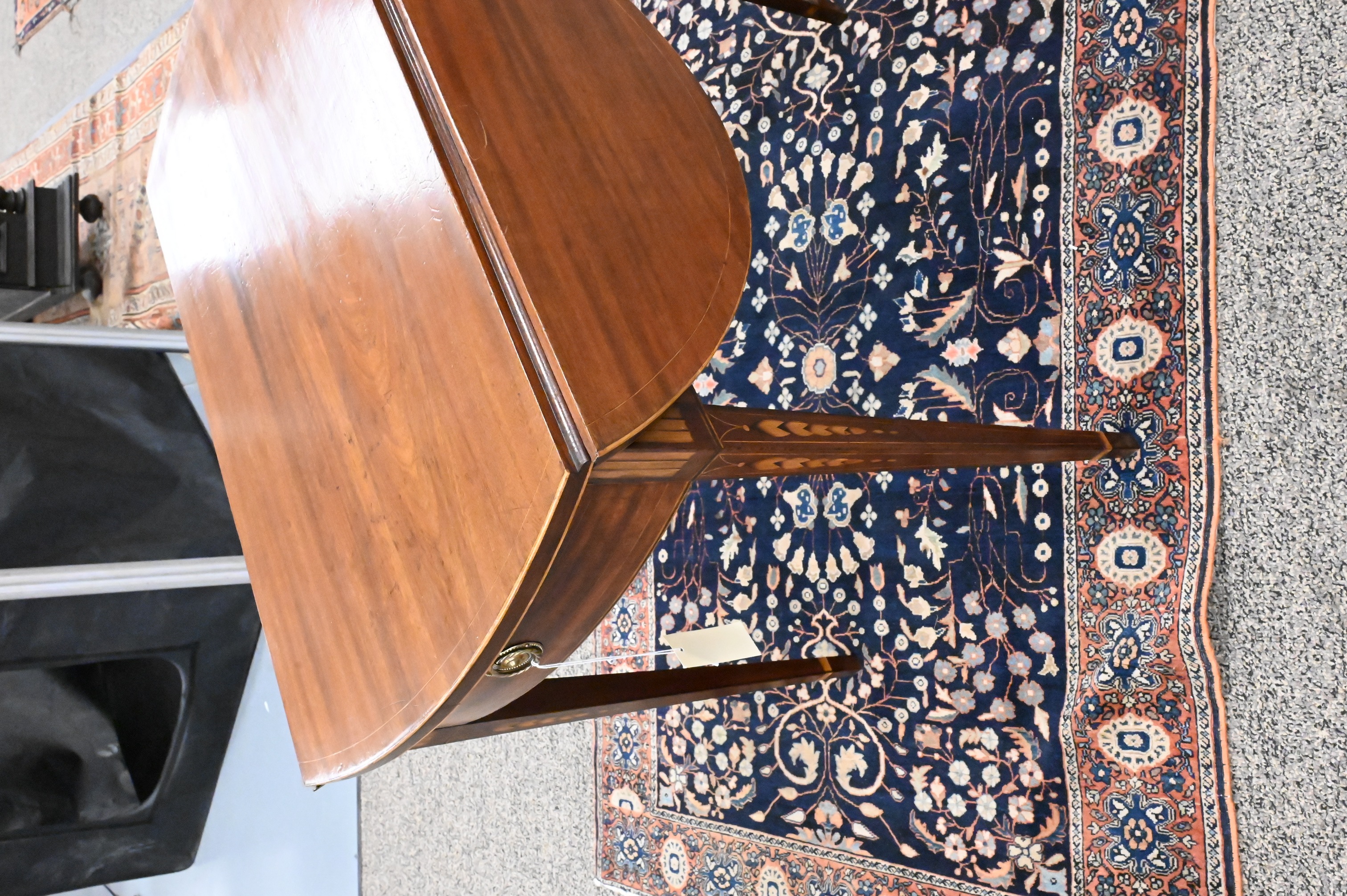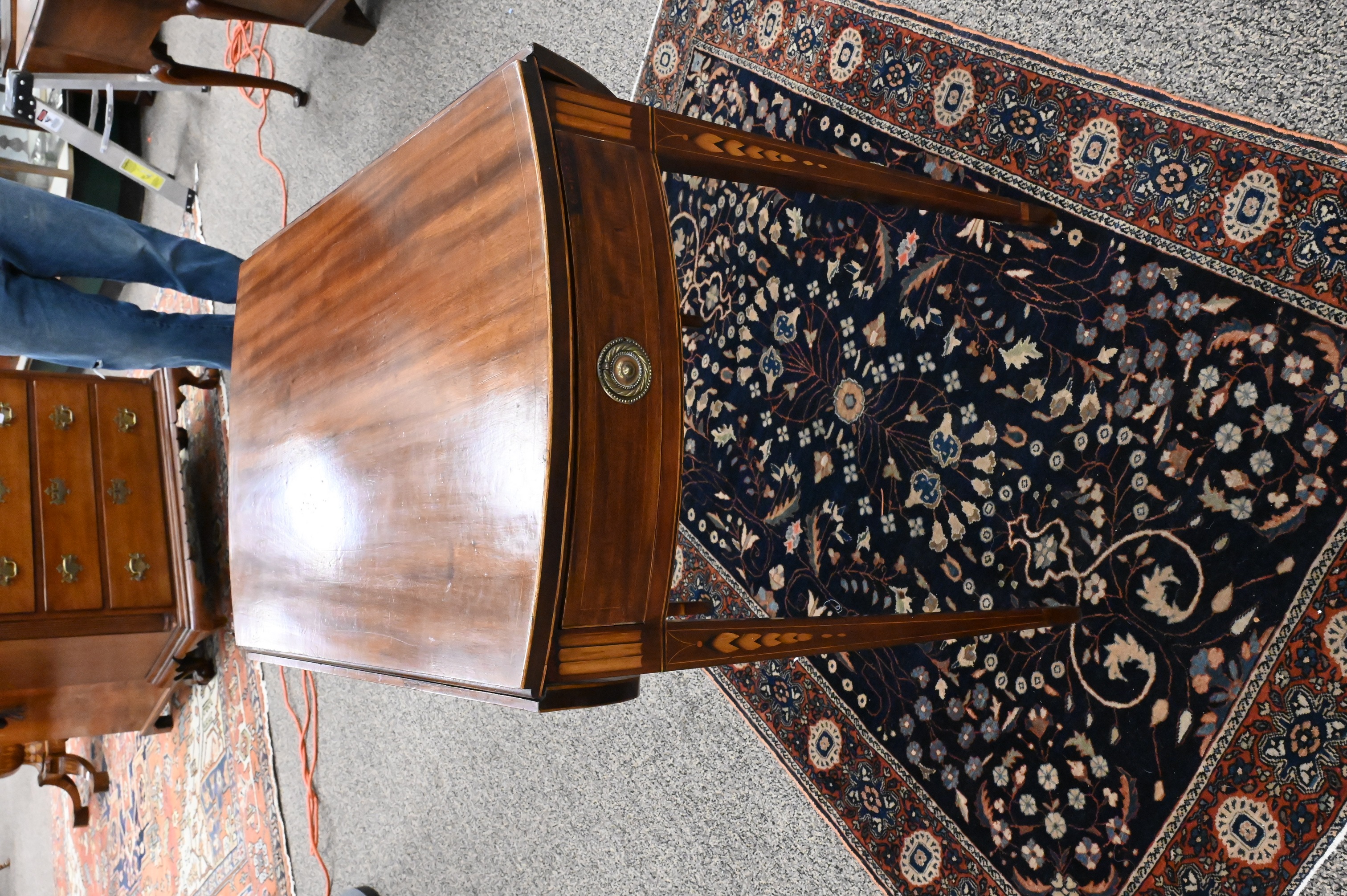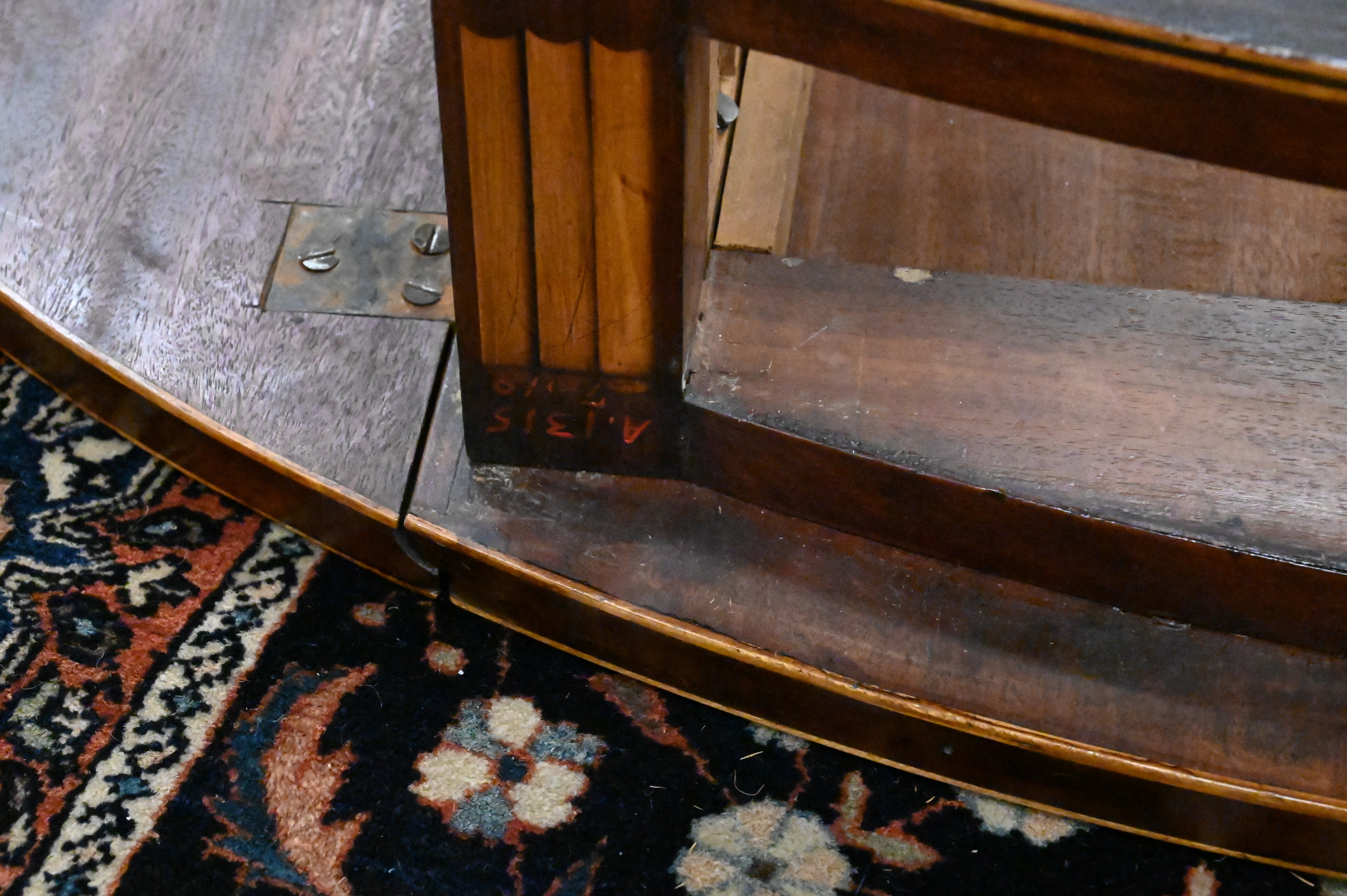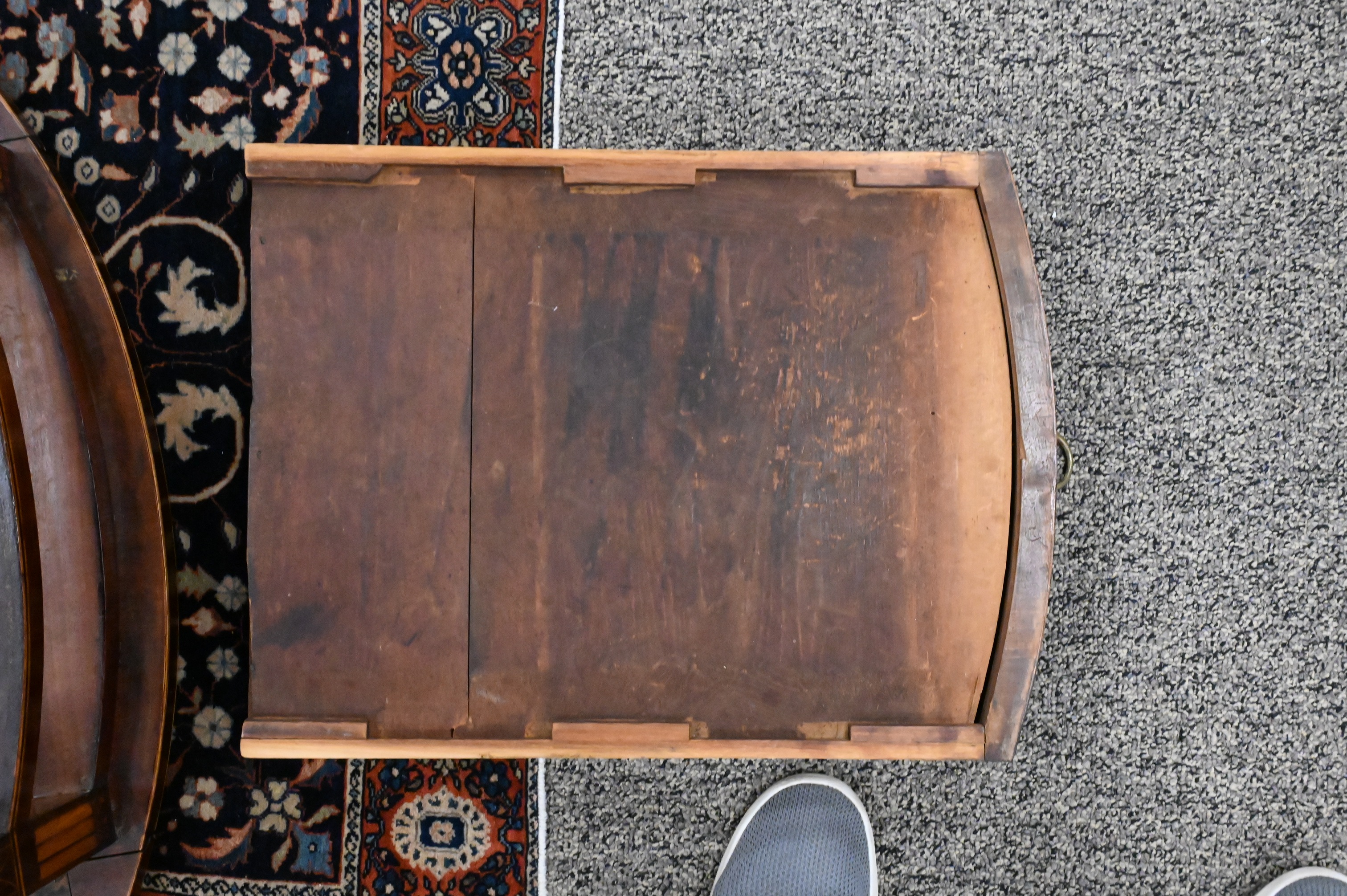 having oval drop leaves with line inlays, bowed ends with single drawer having bookend and husk inlay, yellow poplar drawer linings, black cherry hinged rails, Eastern white pine stationary rails