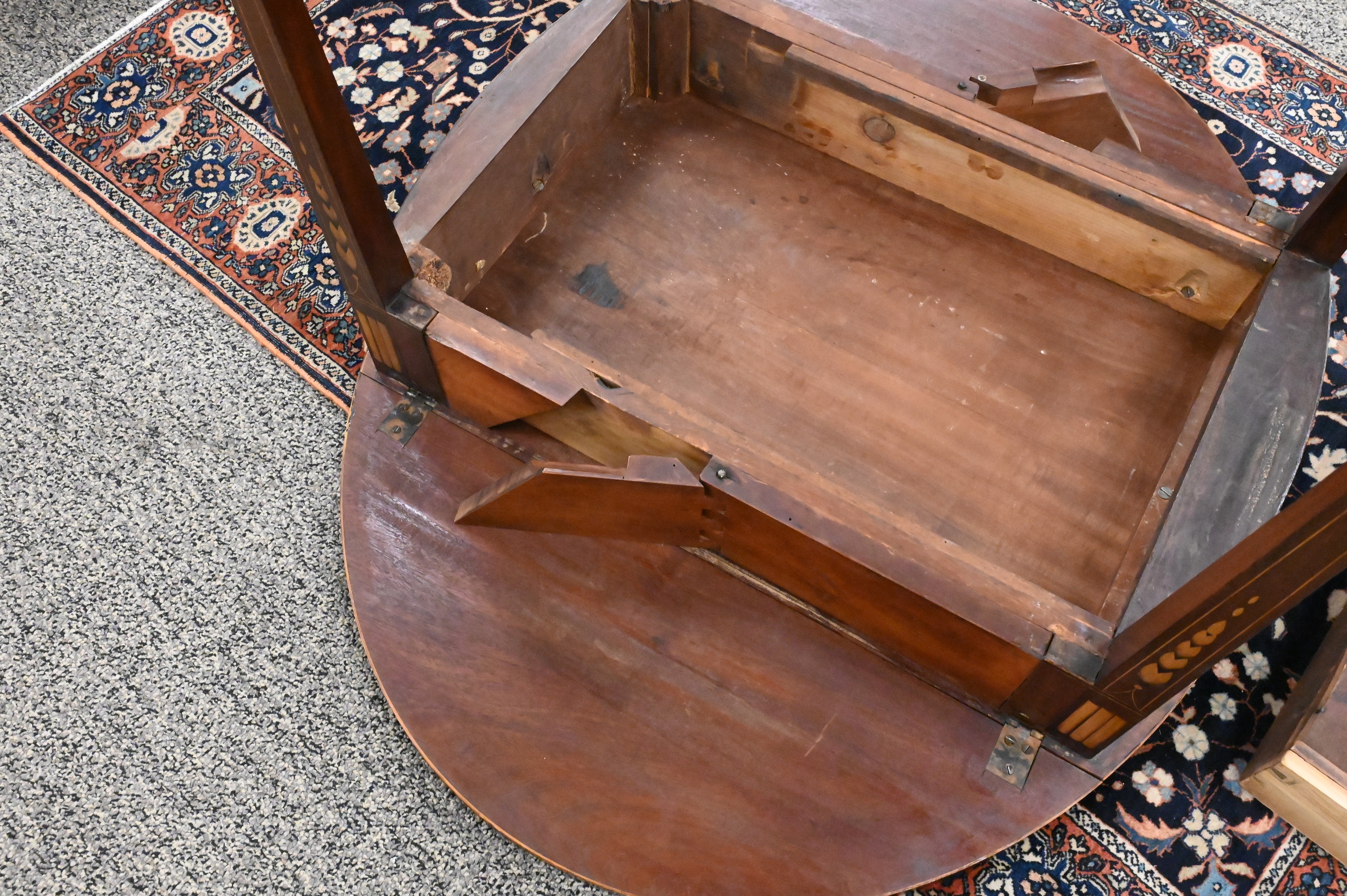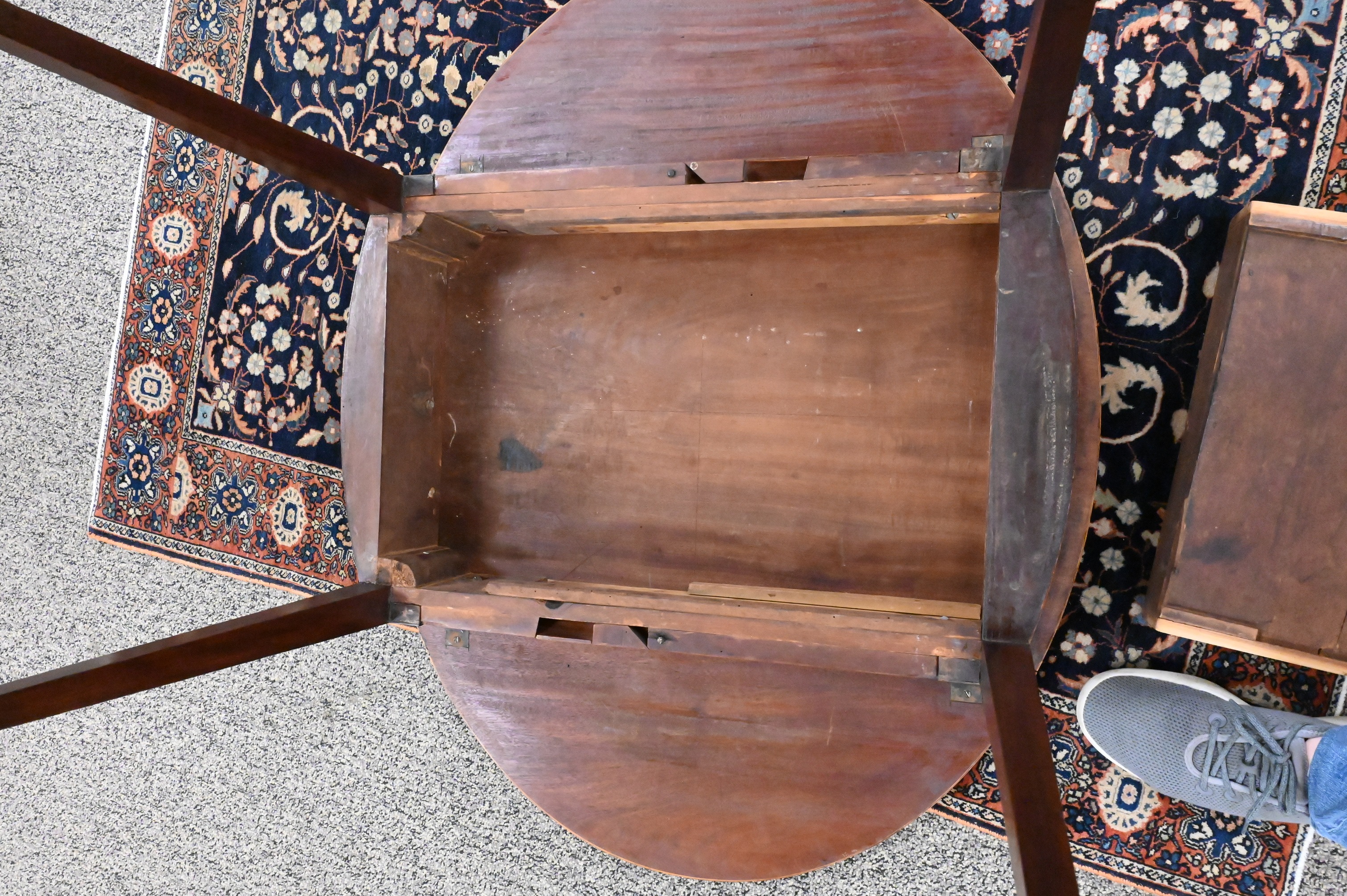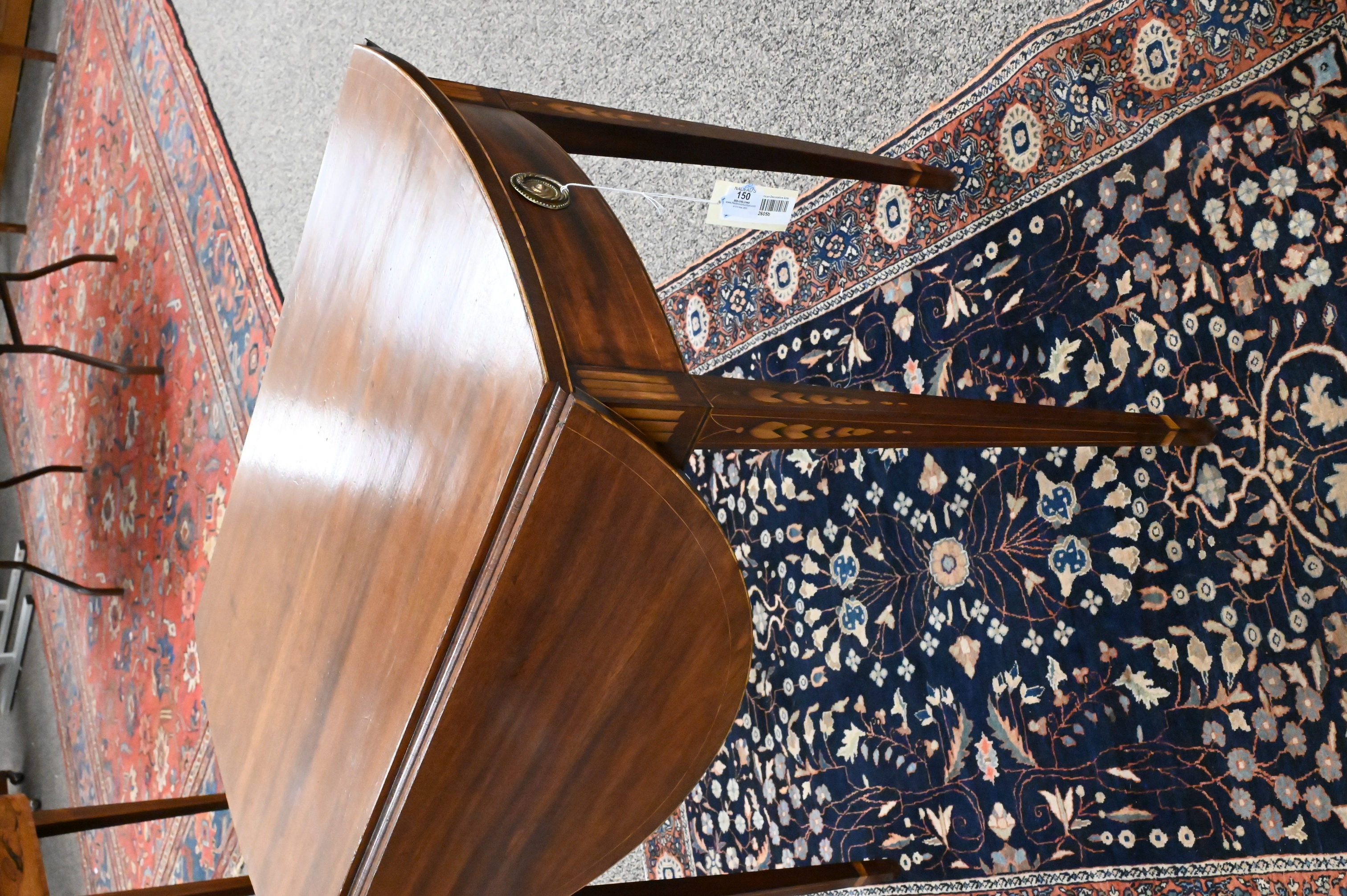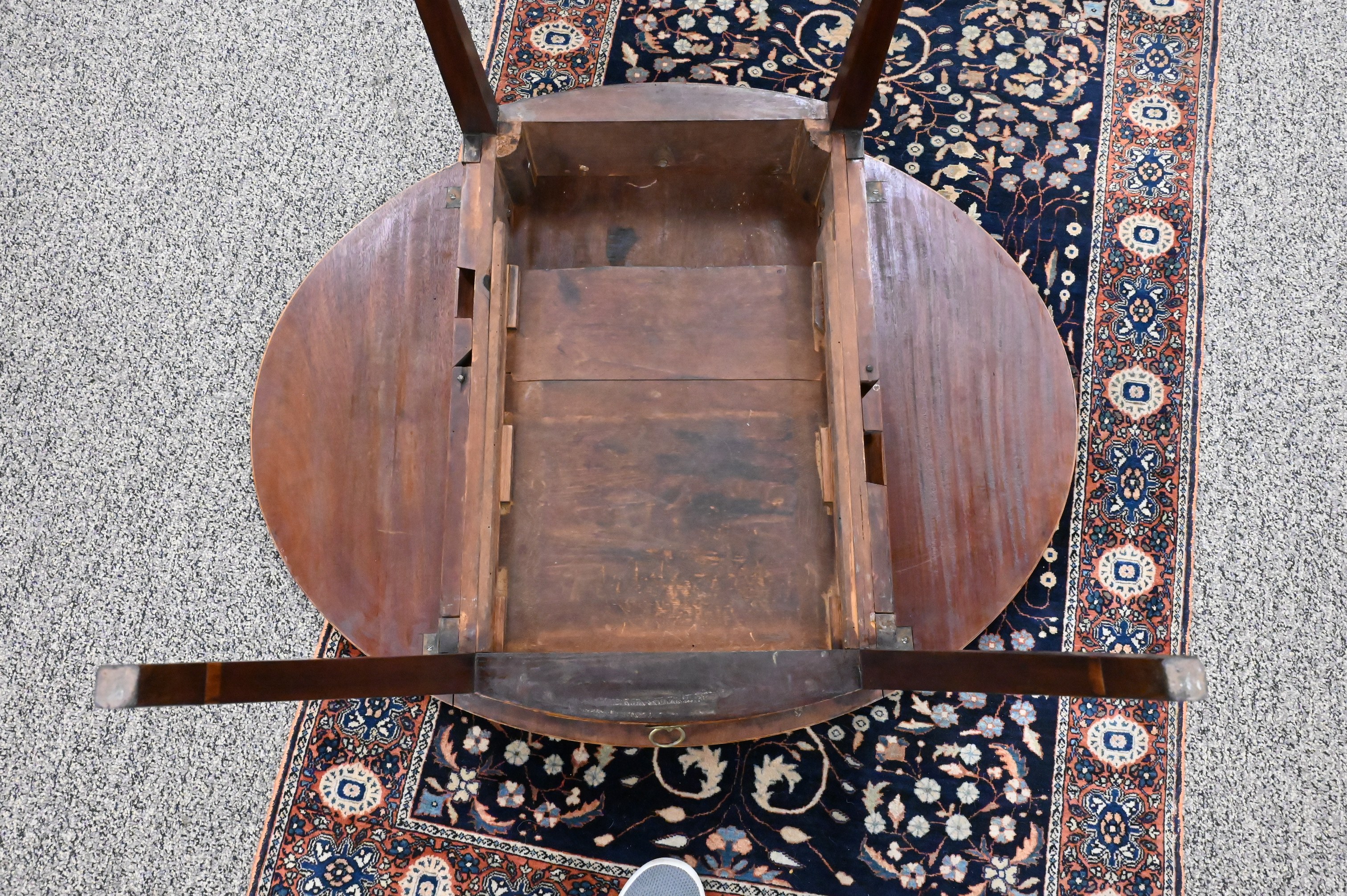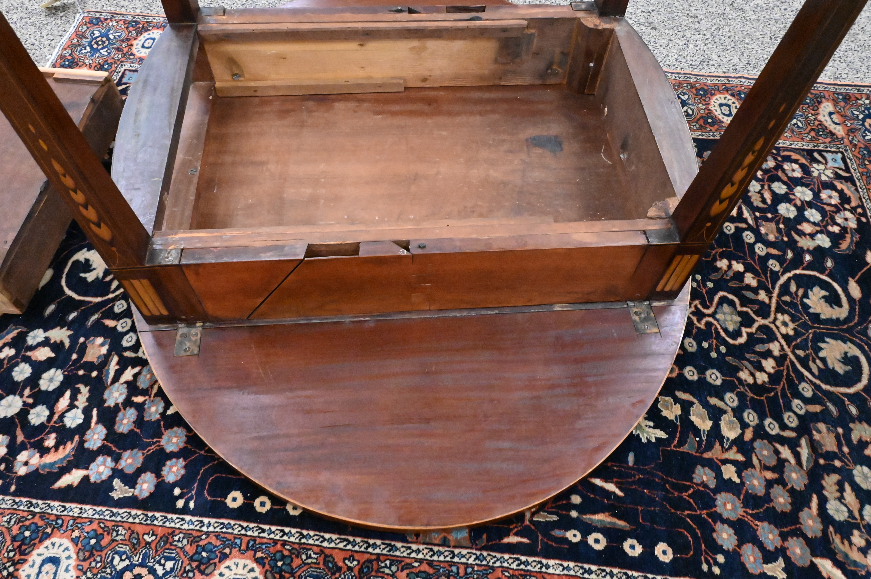having oval drop leaves with line inlays, bowed ends with single drawer having bookend and husk inlay, yellow poplar drawer linings, black cherry hinged rails, Eastern white pine stationary rails
