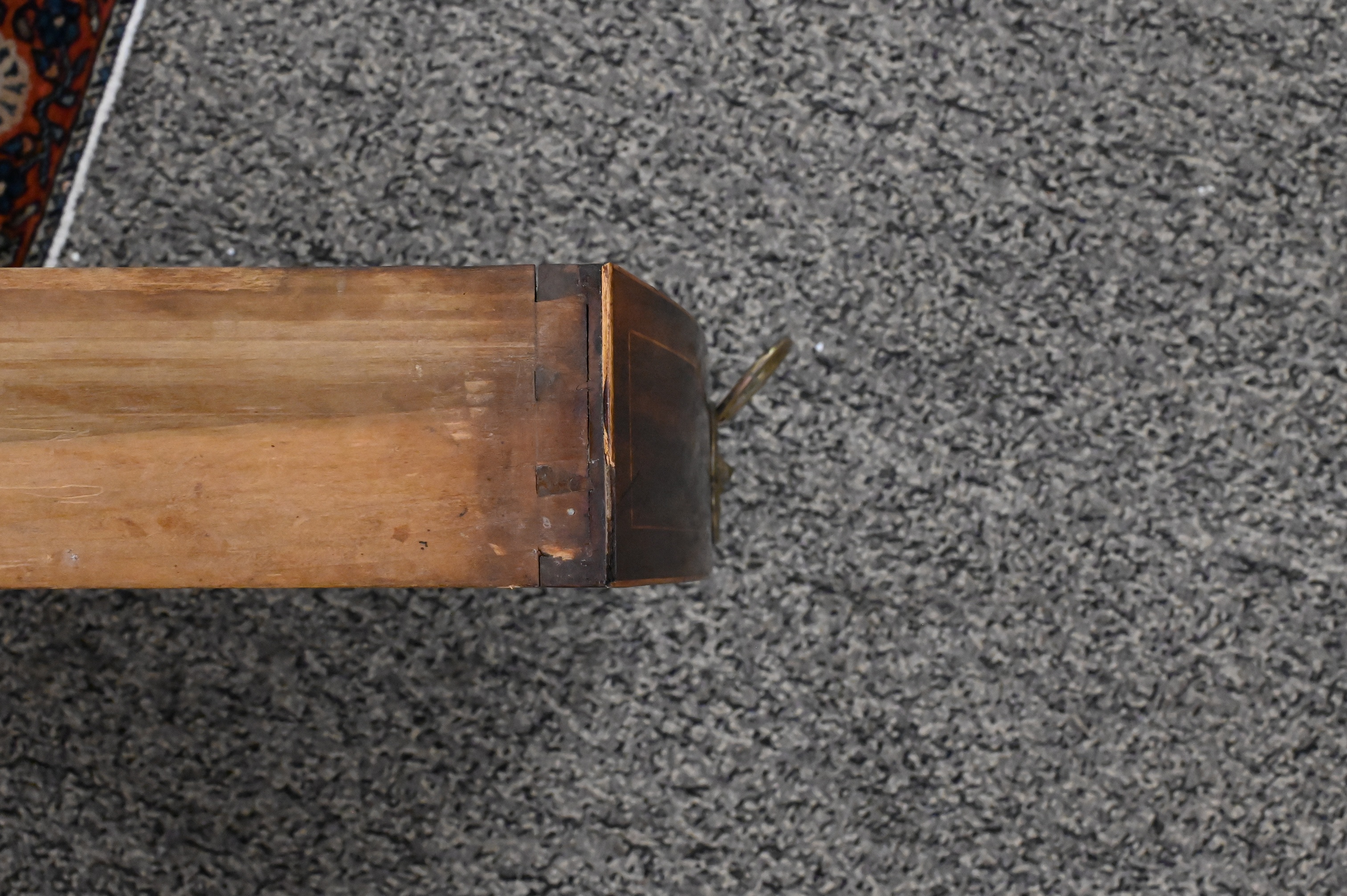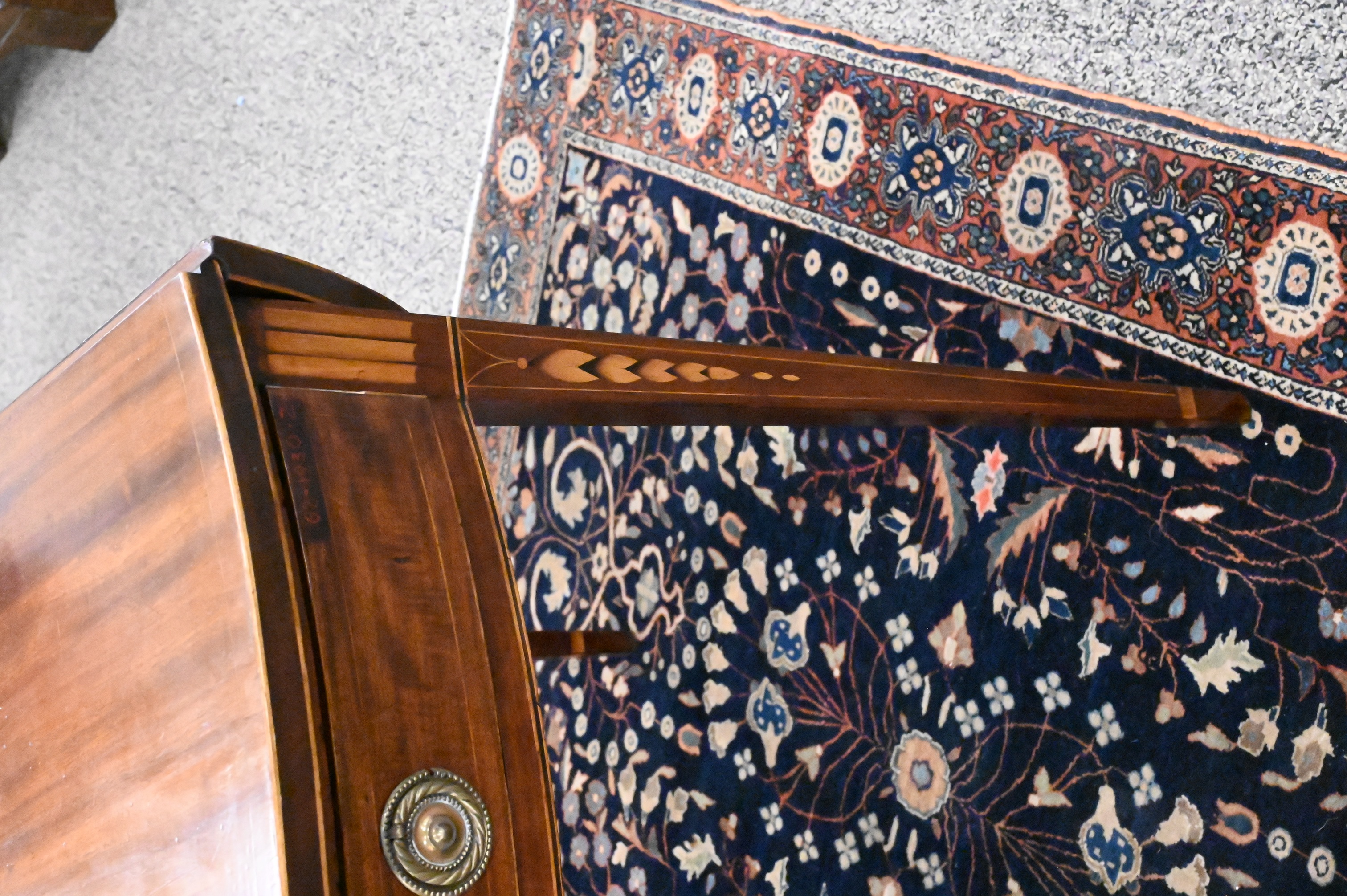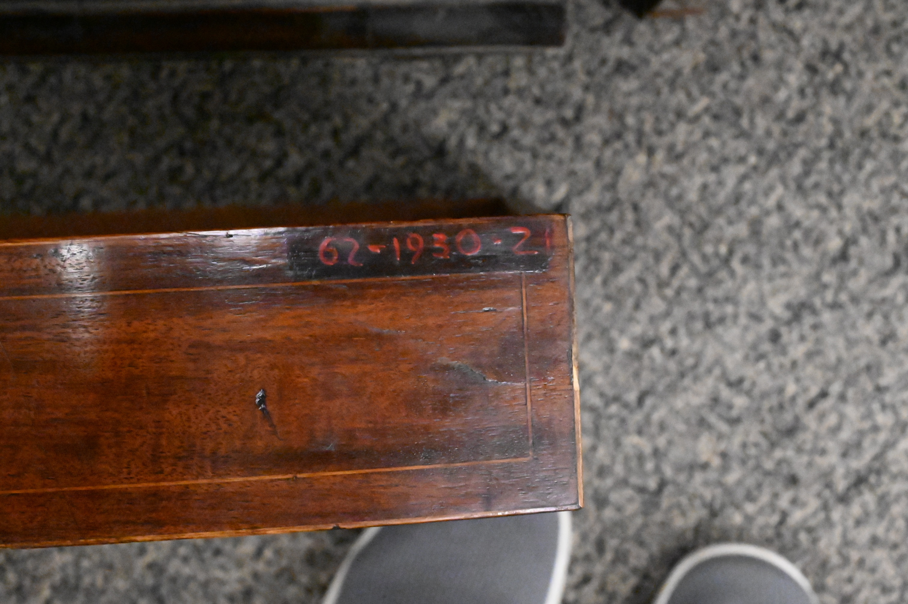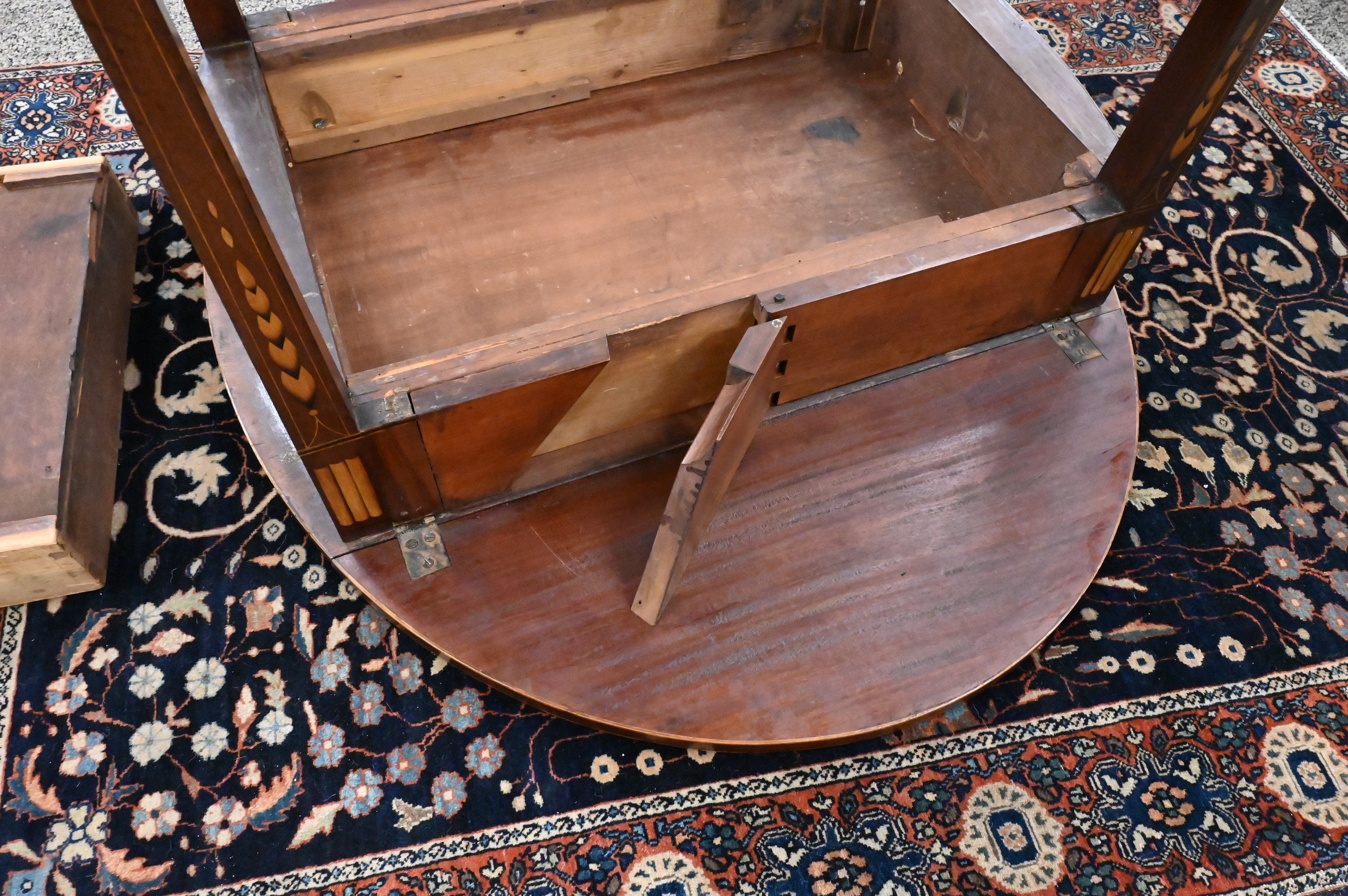having oval drop leaves with line inlays, bowed ends with single drawer having bookend and husk inlay, yellow poplar drawer linings, black cherry hinged rails, Eastern white pine stationary rails