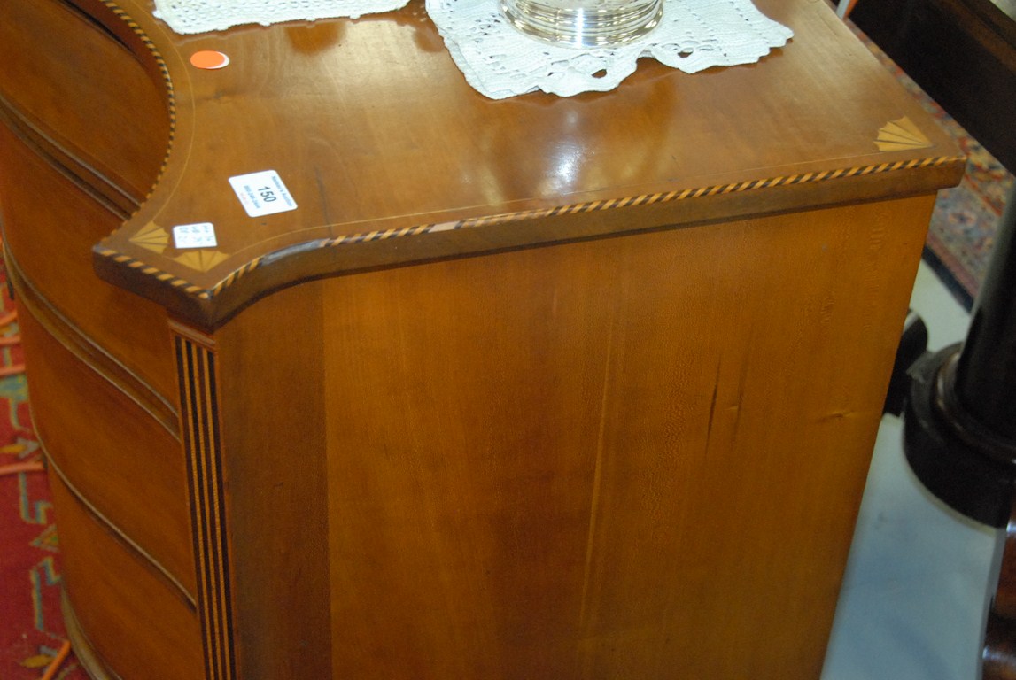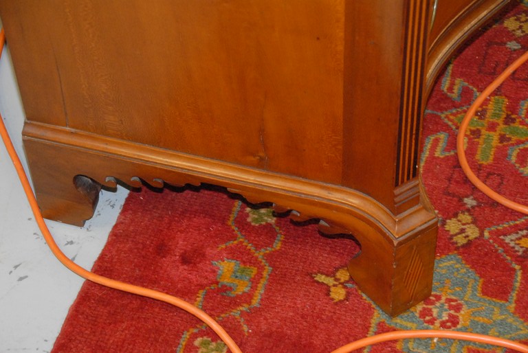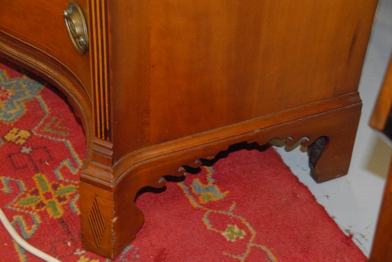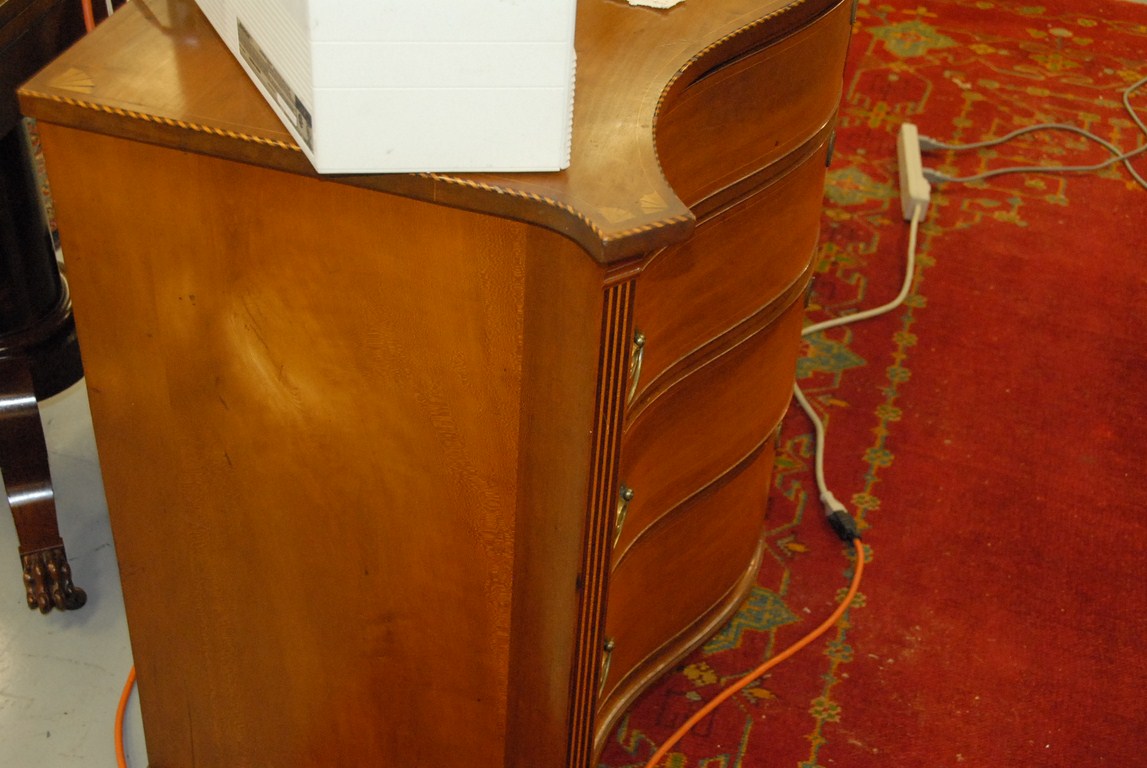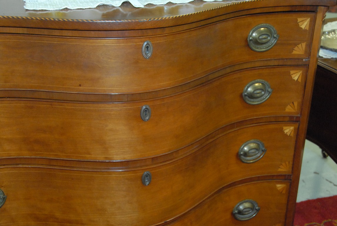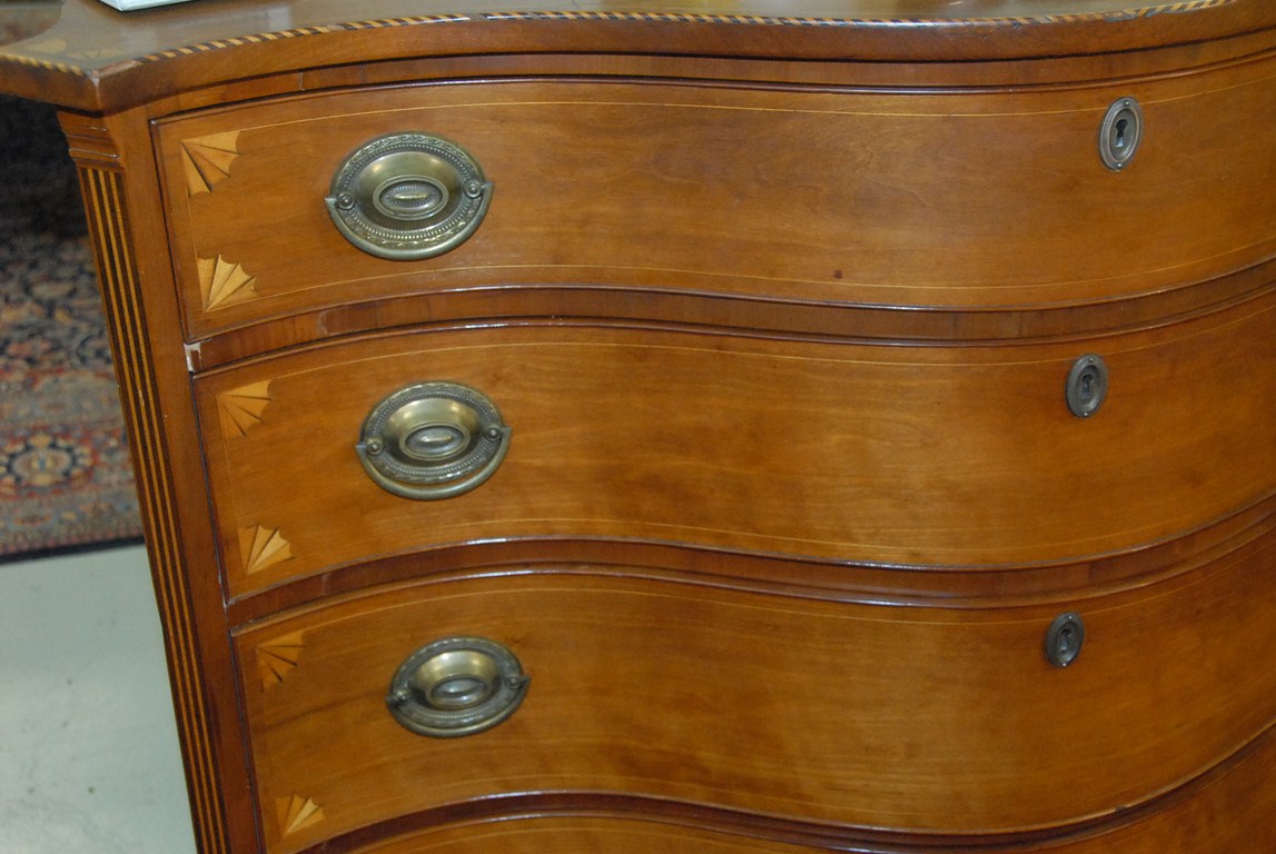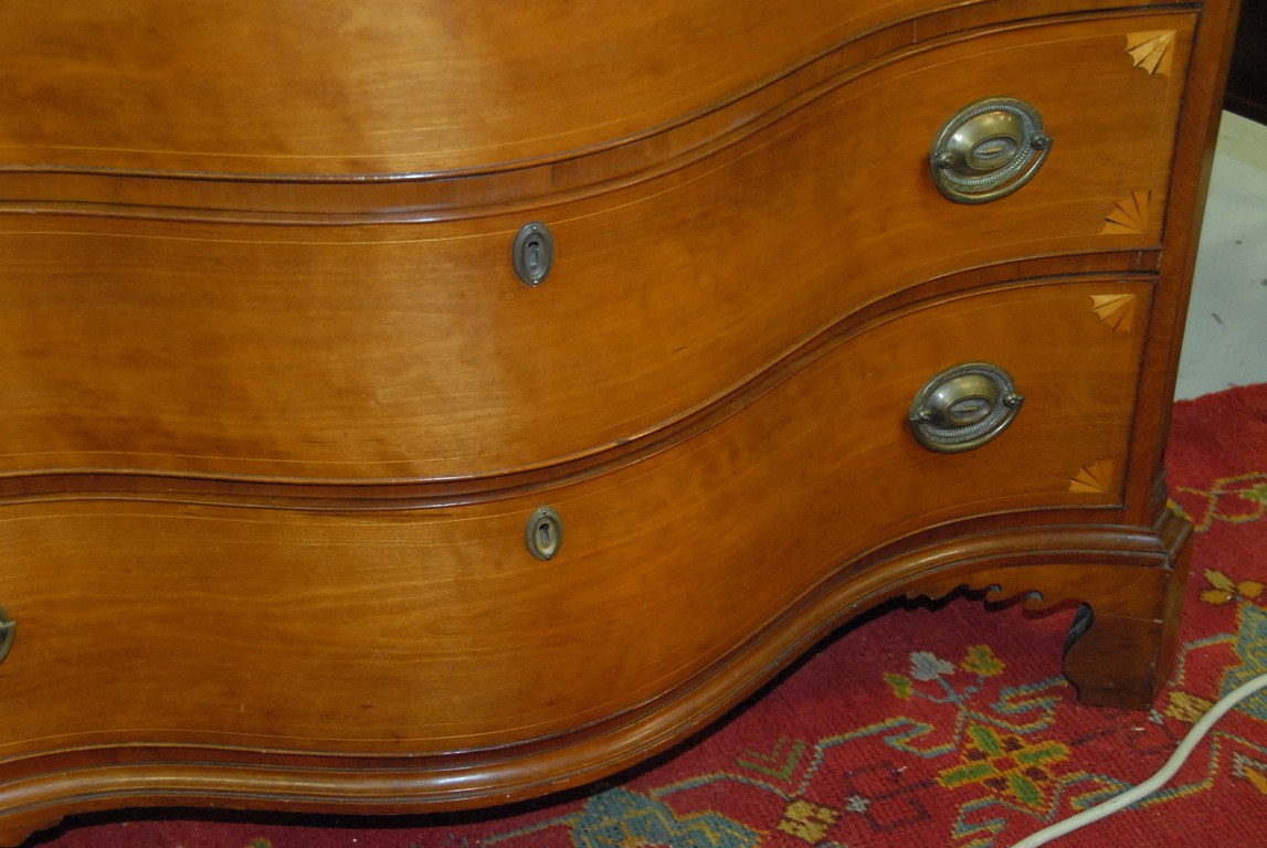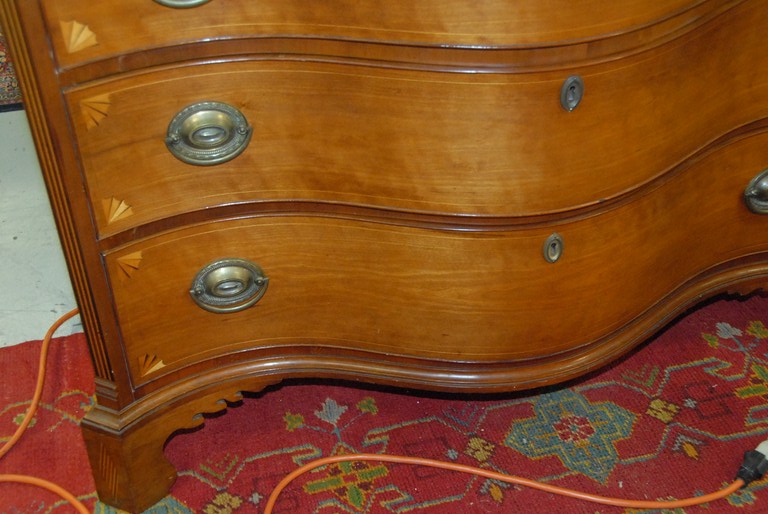 Cherry four drawer chest with exagerated serpentine front, probably Norwich, Connecticut circa 1800, having top with serpentine front and flat block corners over conforming case on cutout bracket feet with carved cusps, top with oval panel, line, and fan inlays, drawers with line and fan inlays, corner with two contrasting inlays, drawers with original oval brass pulls, pine secondary wood. ht. 36in. wd. 39in. dp. 21in.
