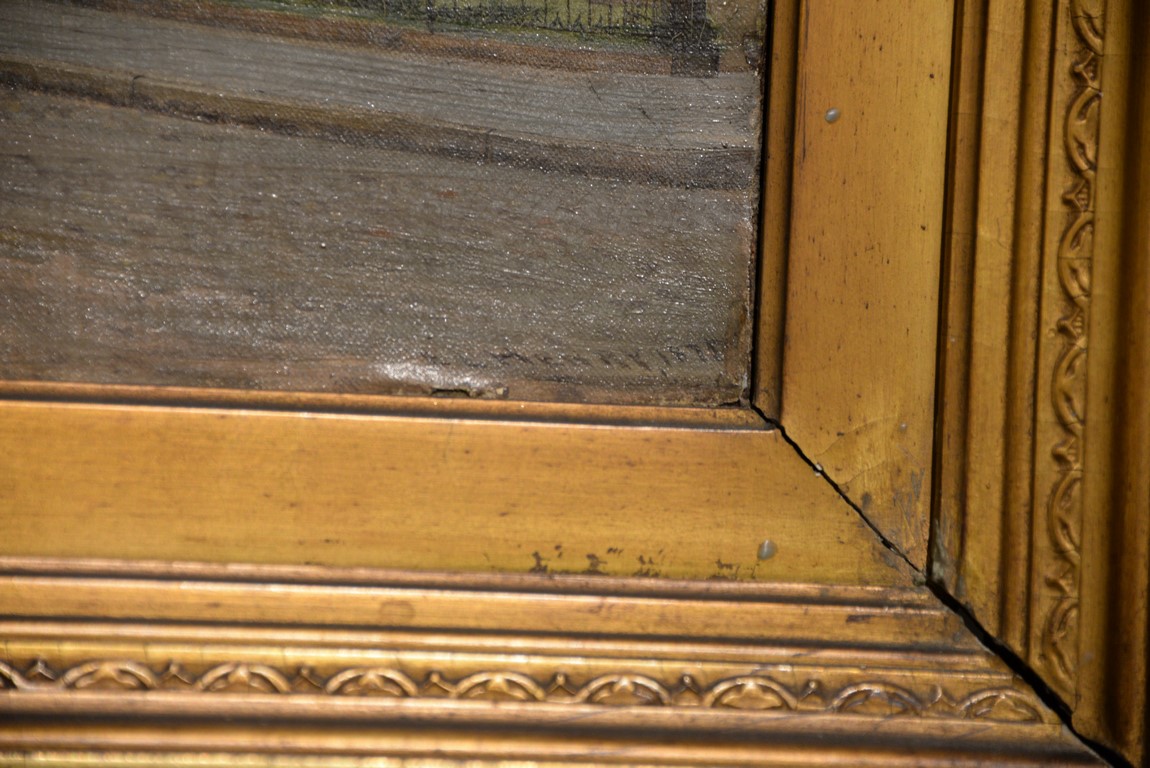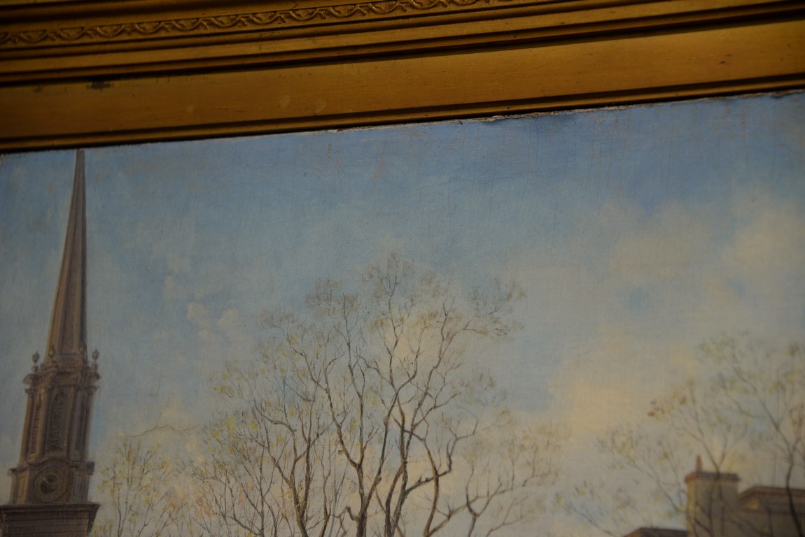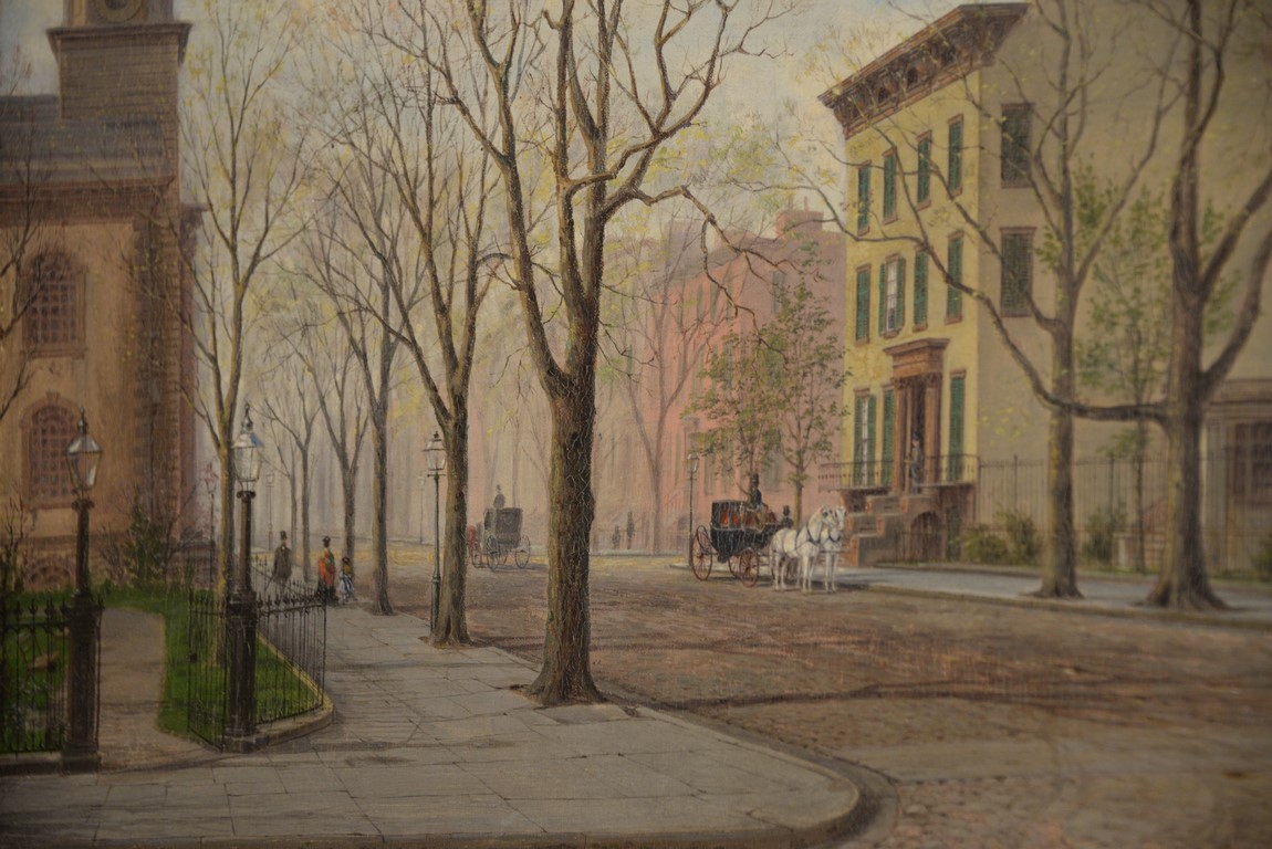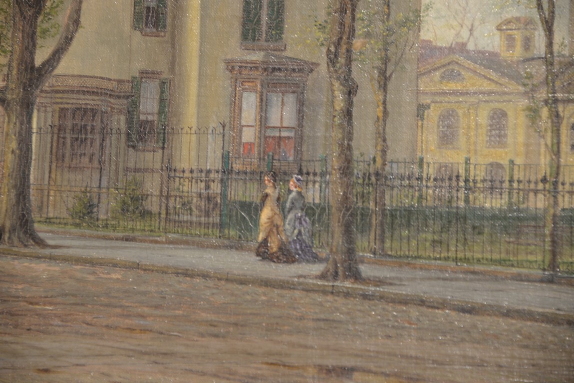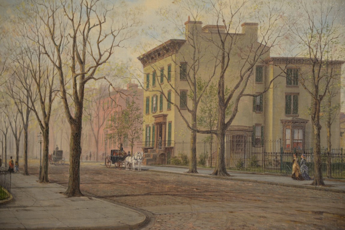 EDWARD LAMSON HENRY 1841-1919 The Home of Dudley Sanford Gregory oil on canvas signed lower right E. L. Henry 1865 16 x 27 Provenance: Mrs. Ernest Franklin Tyler France Gregory to current Consignor Reference: Photographic copy is in Frick Art Reference Library, N.Y. The Home of Dudley Sanford Gregory in Jersey City, New Jersey. Dudley was the first Mayor of Jersey City. Scene depicts Dudley S. Gregory’s home and Presbyterian Church at intersection of Washington and Sussex Streets at Washington Square and shows a tree lined street with Victorian iron fencing, horse drawn carriages, and several people.