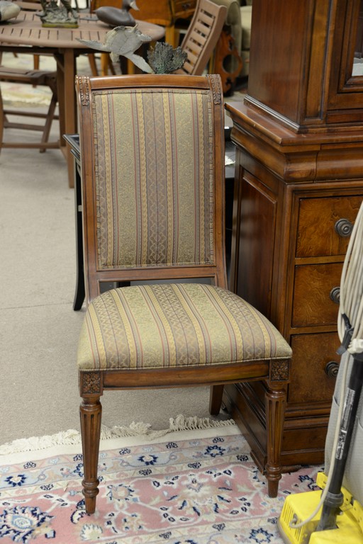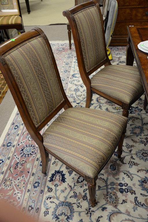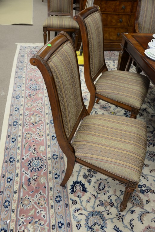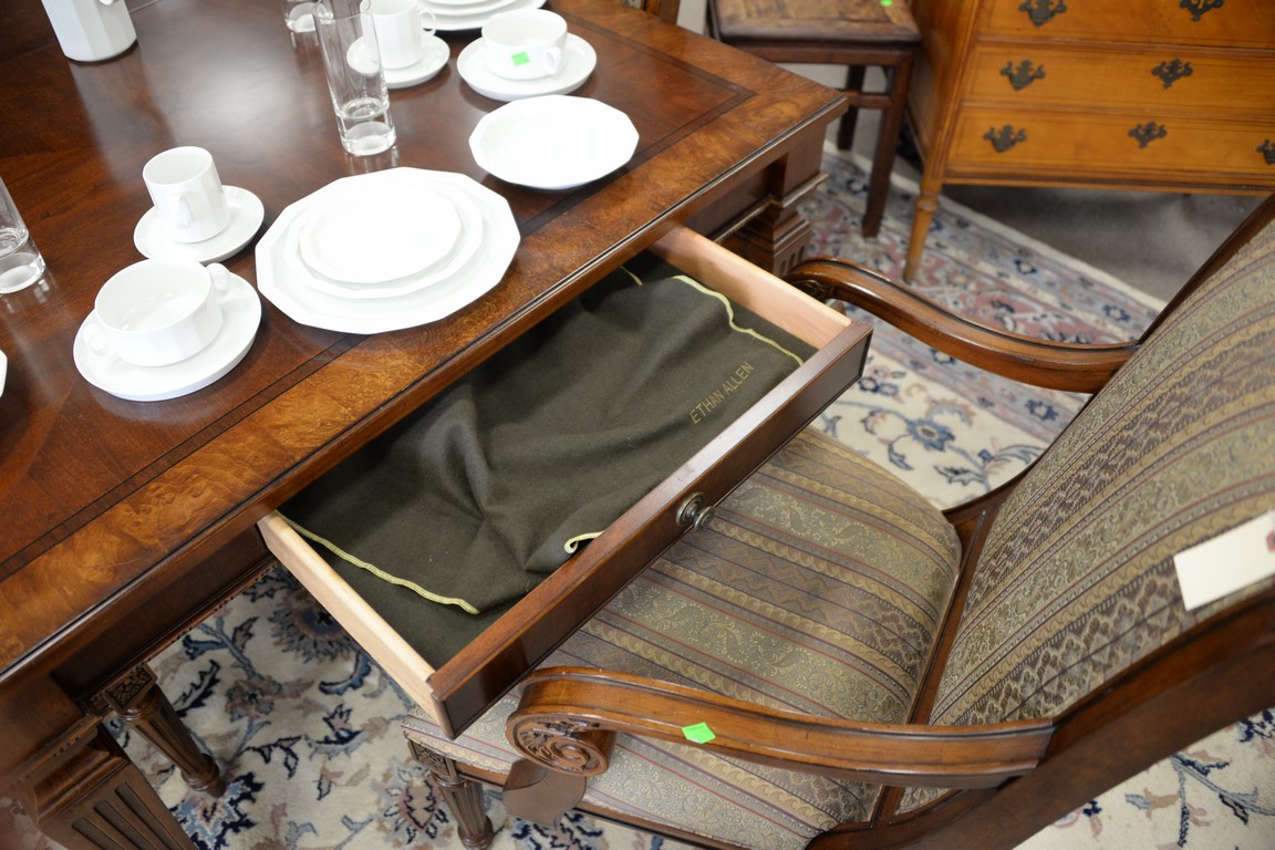 Ethan Allen dining set with eight upholstered chairs and table with two leaves and custom pads, table has drawer on either end, top closed: 46 x 72, top open: 46 x 120.