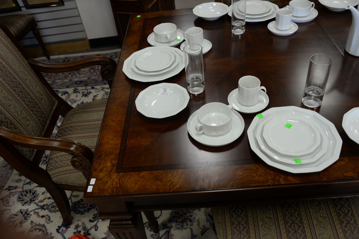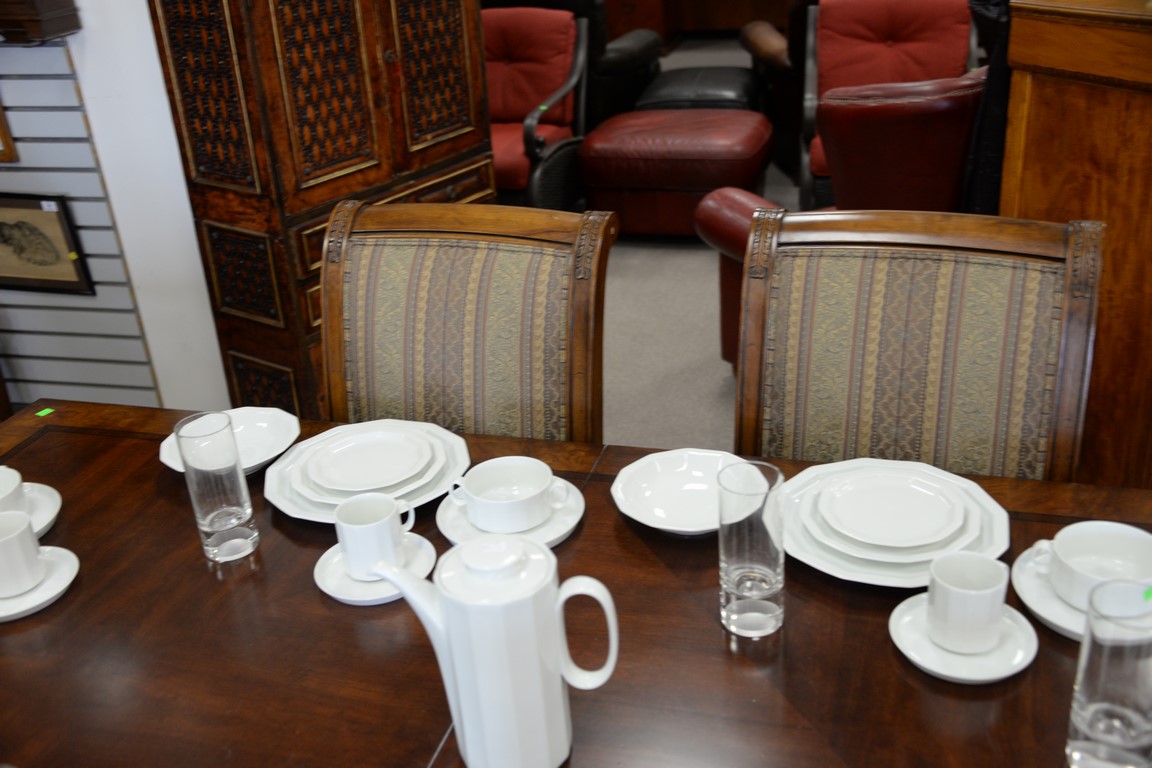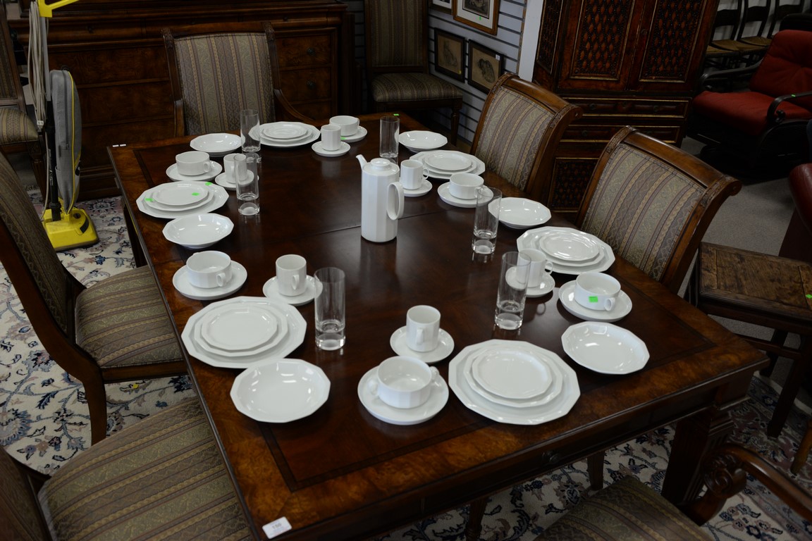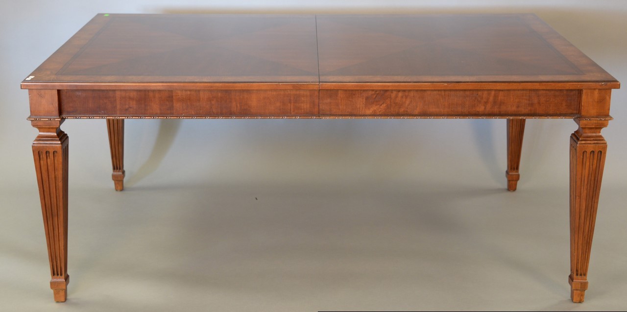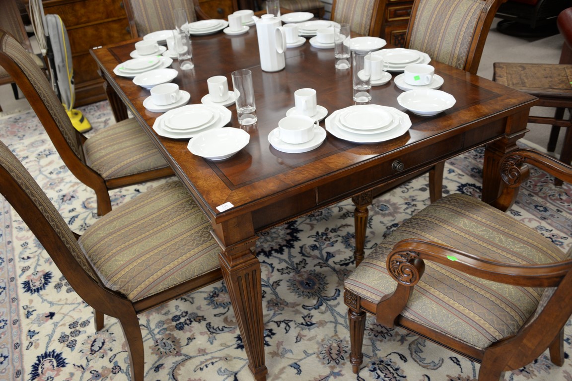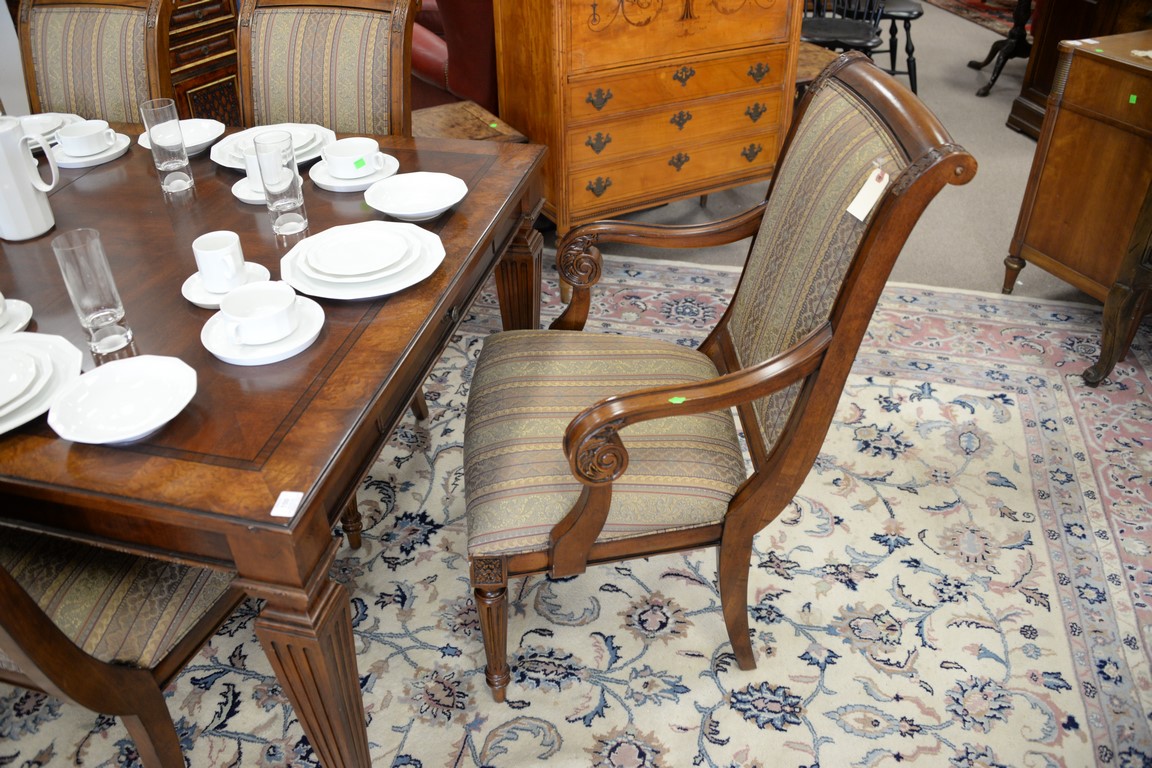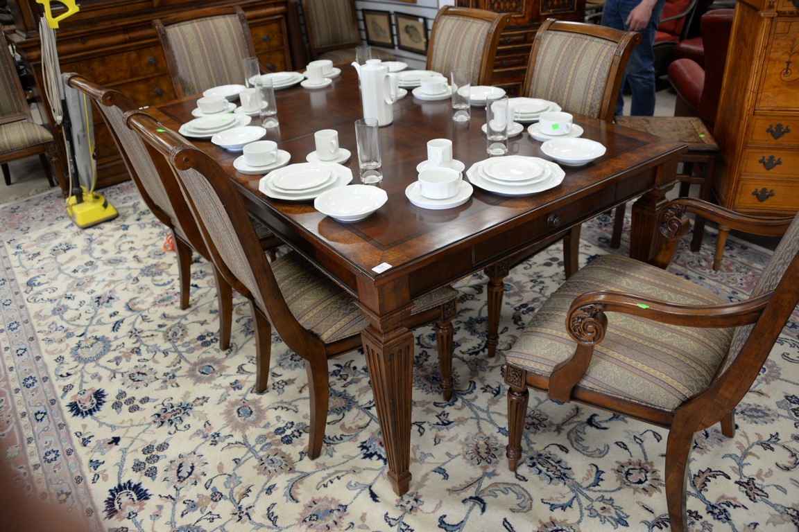 Lot 150: Ethan Allen dining set with eight upholstered chairs and table with two leaves and custom pads, table has drawer on either end, top …