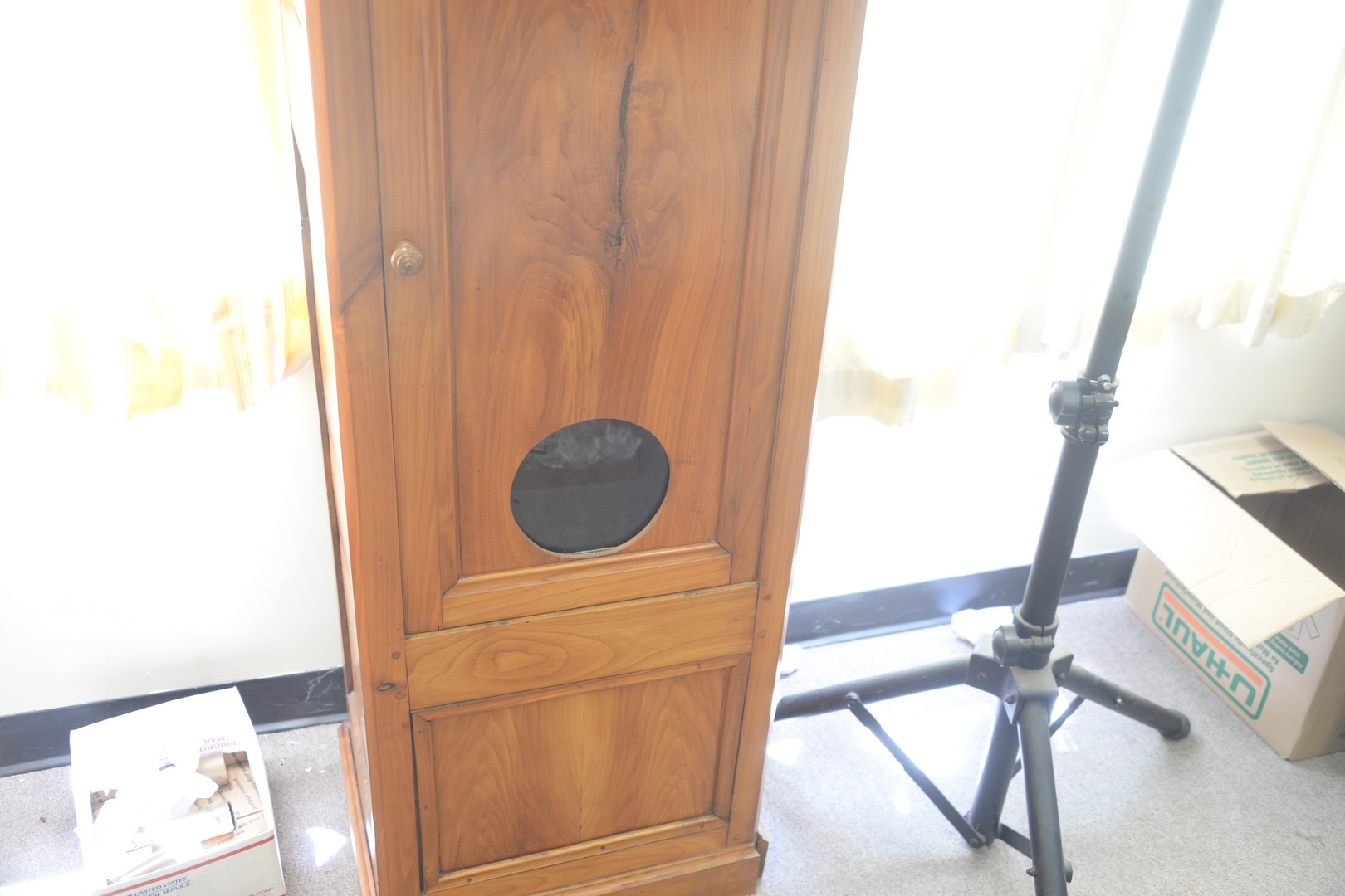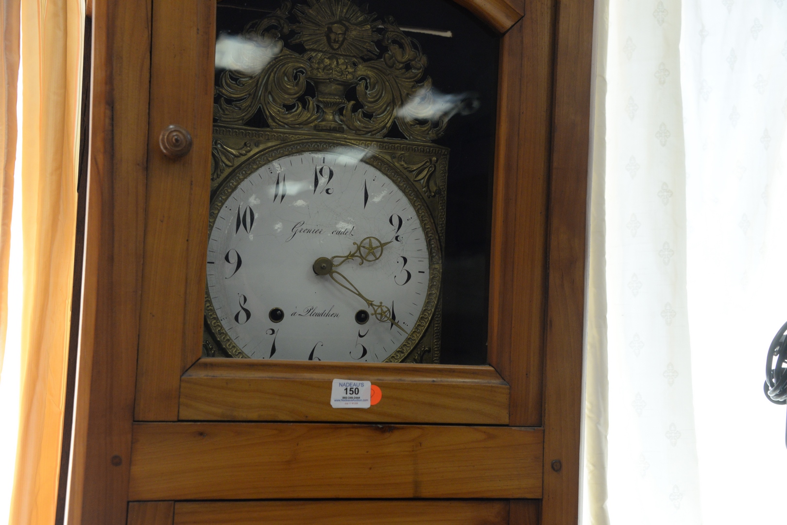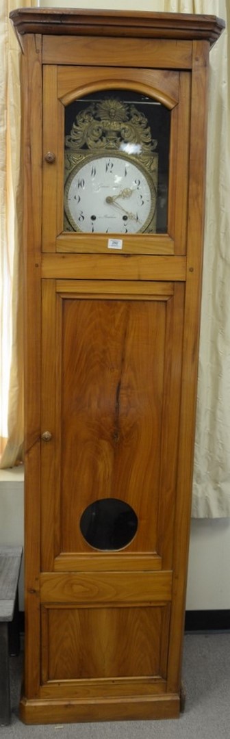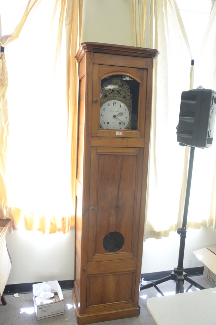 Lot 150: French Fruitwood Tall Clock having brass works and embossed, porcelain dial, with pendulum and weights, height 83 inches, width 22 1/2 inches, depth 15 inches.
