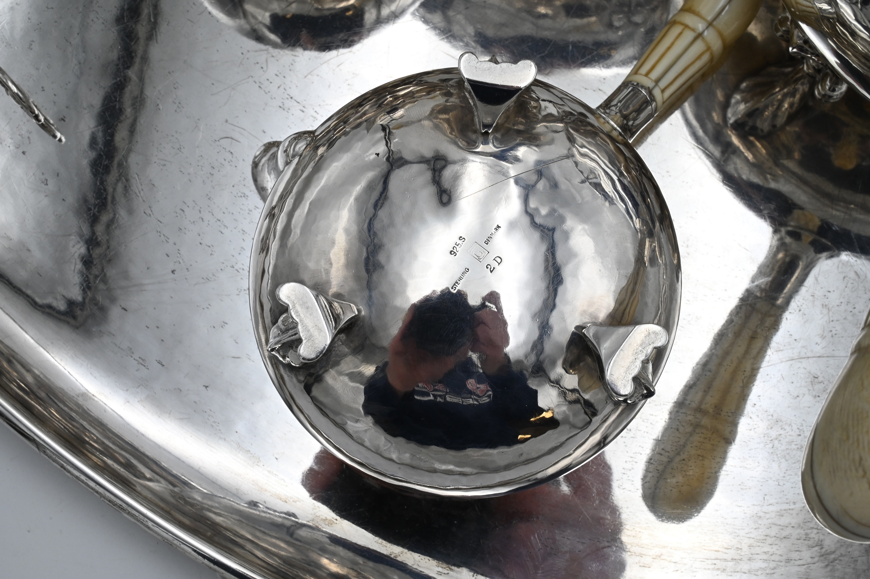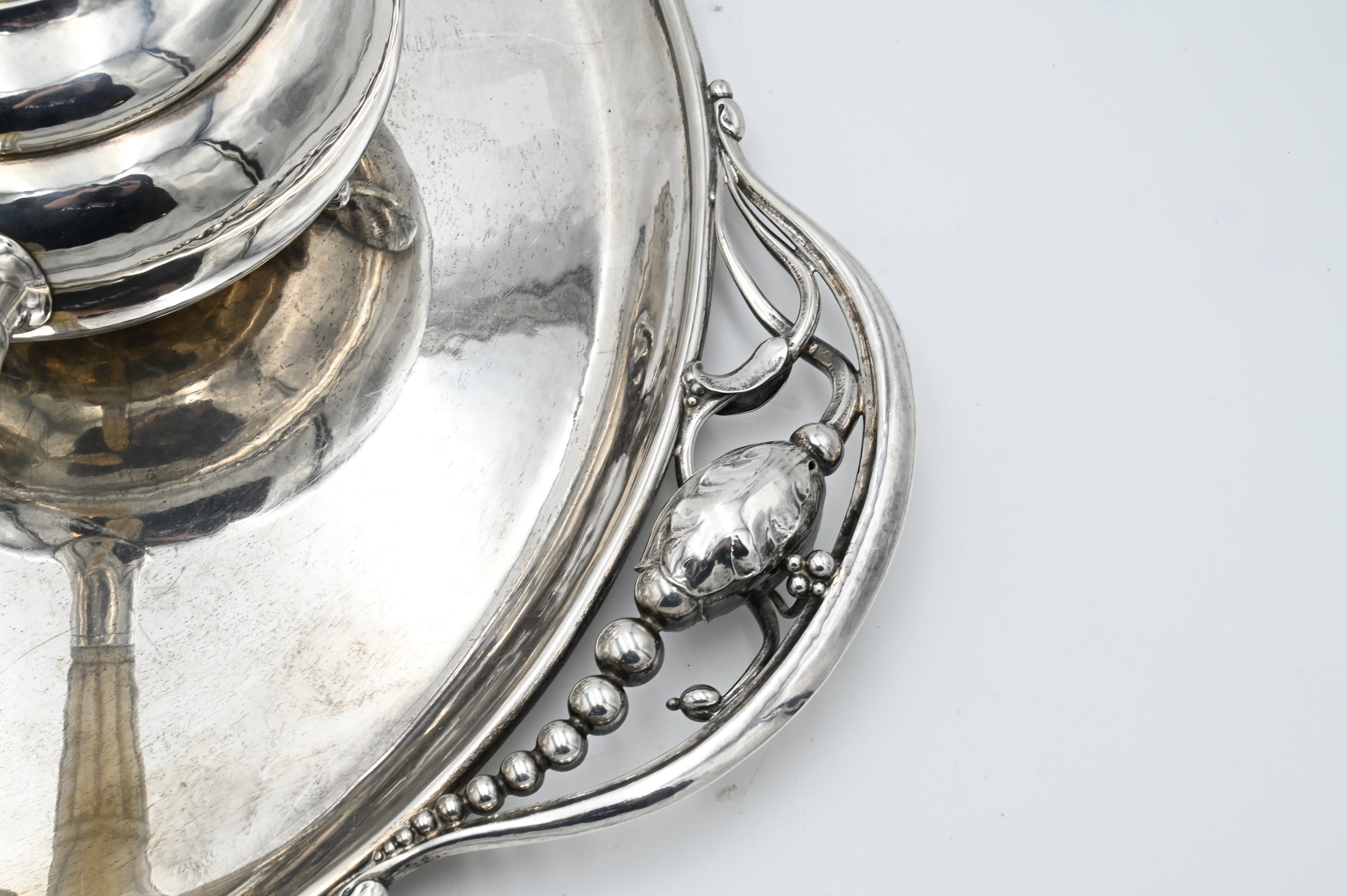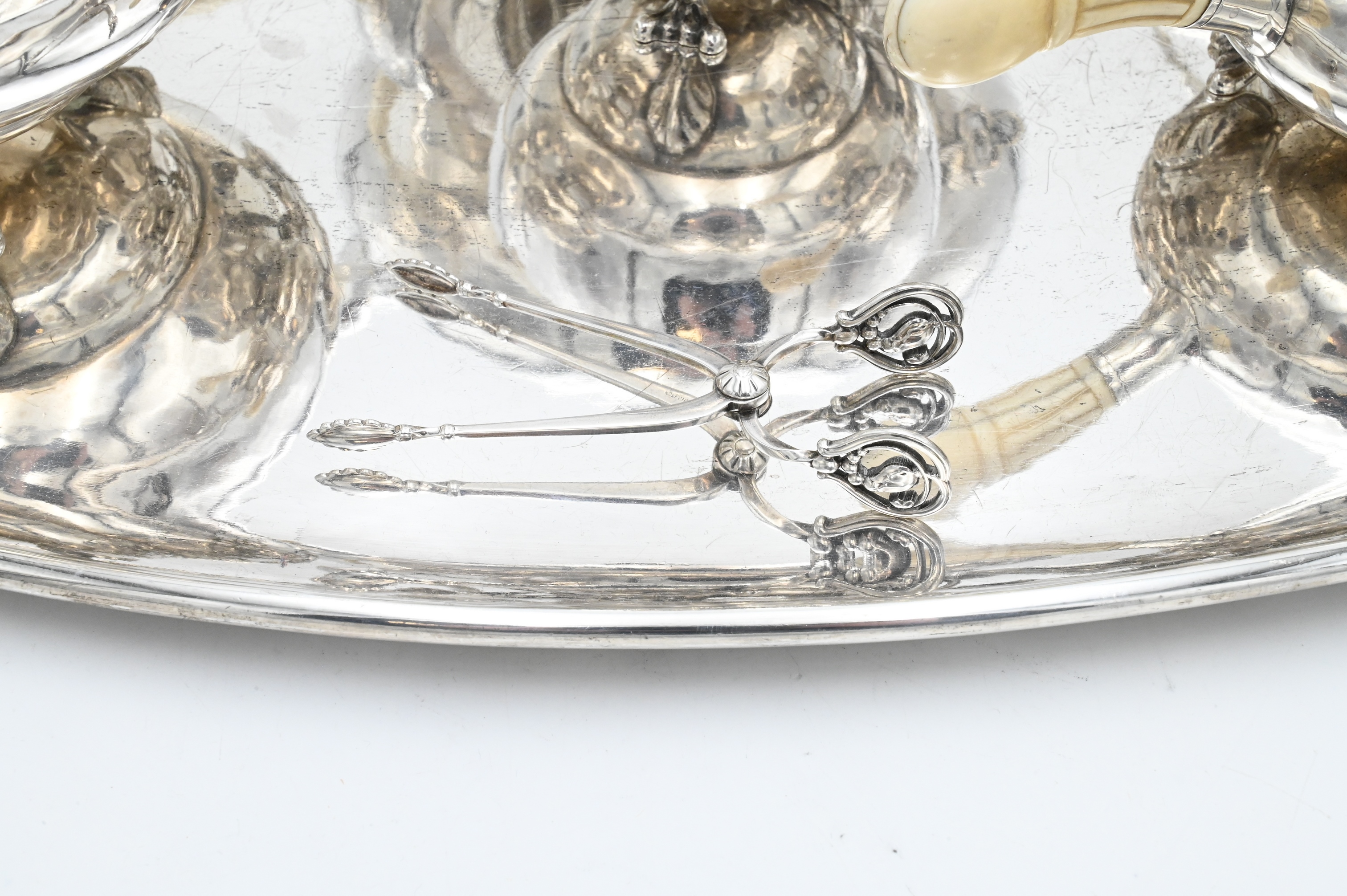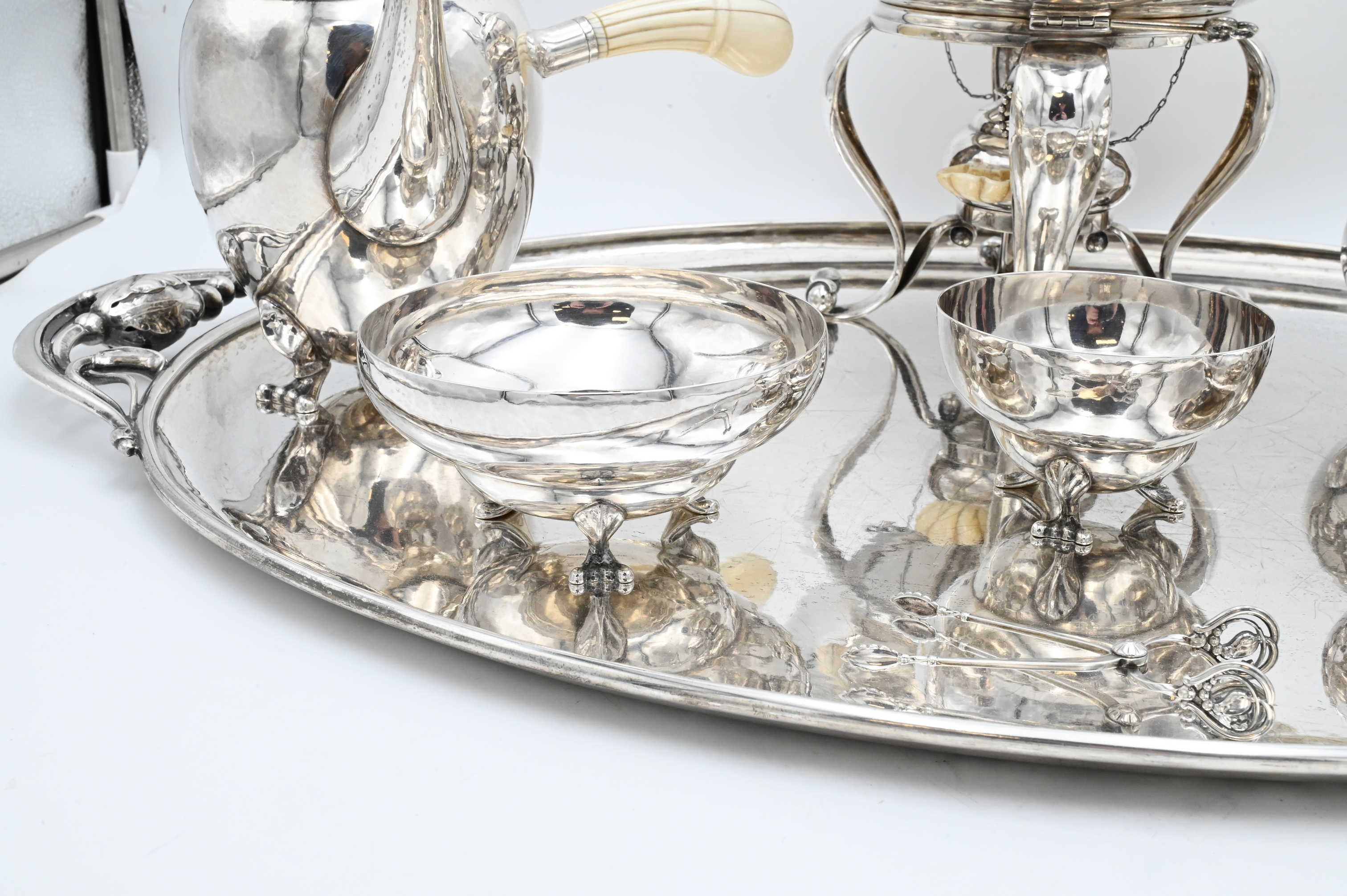 to include tray, creamer, sugar bowl without cover, waste bowl, as well as sugar tongs, all marked GJ in square 925, sterling Denmark numbers 2, 2D, 2B, sterling oval tray having blossom handles and mark of Georg Jensen Denmark