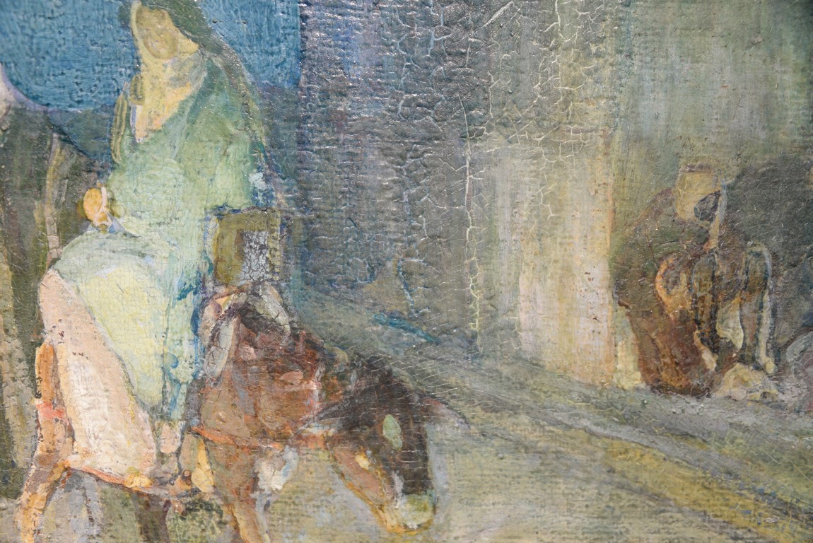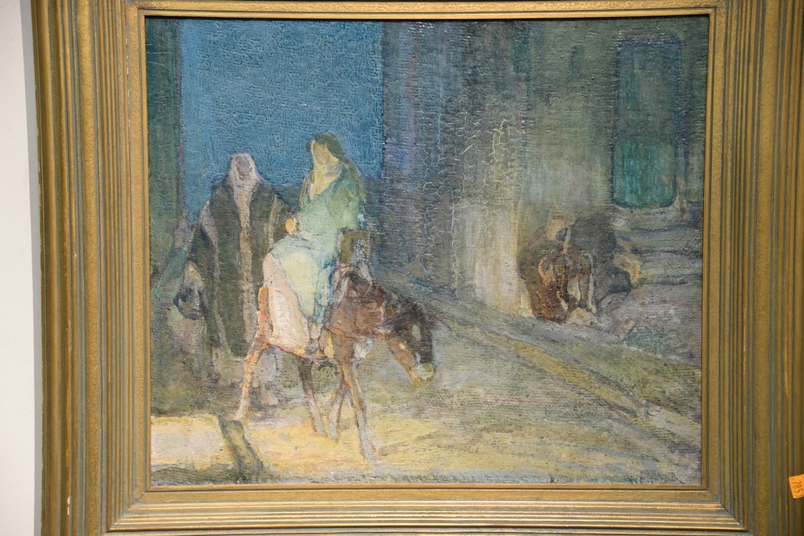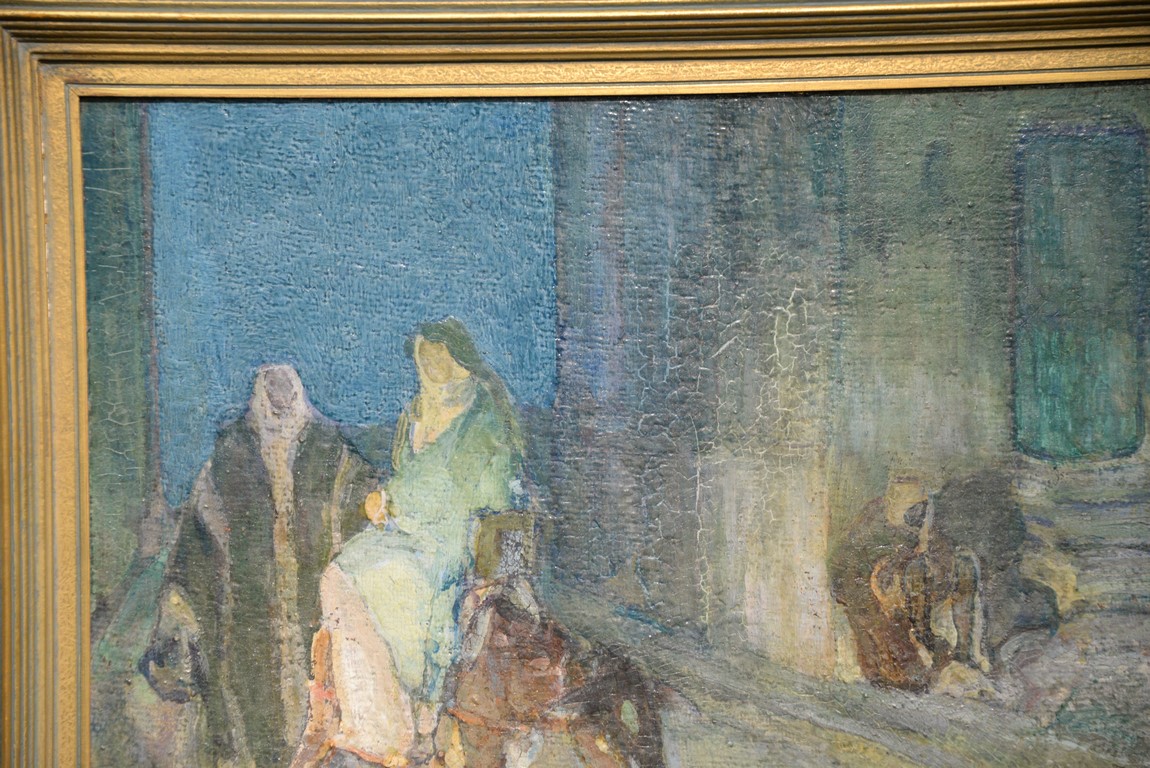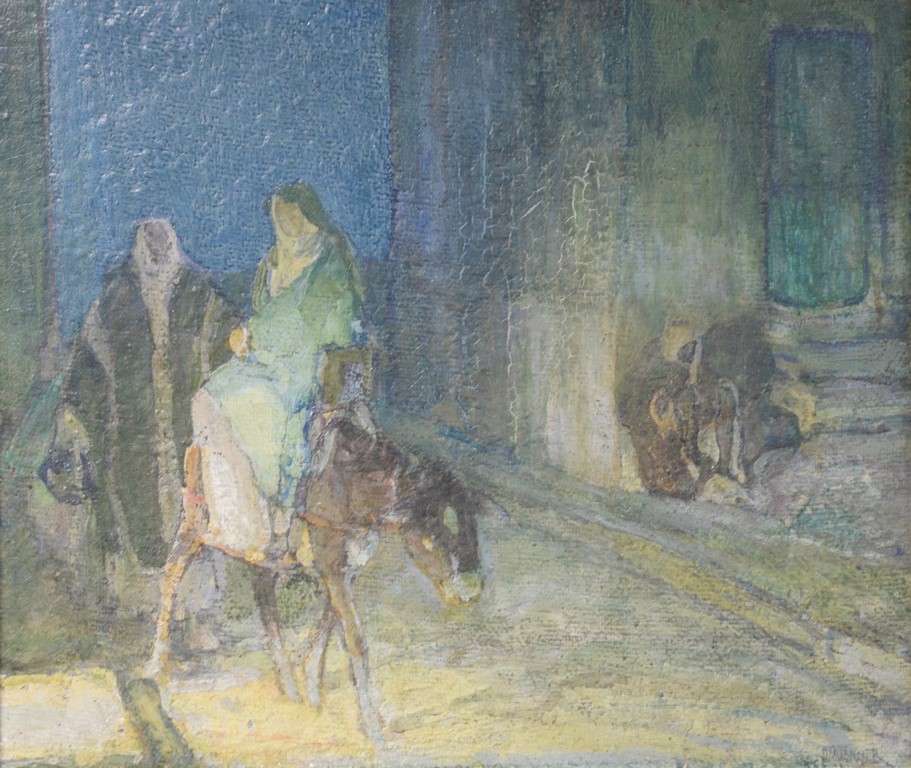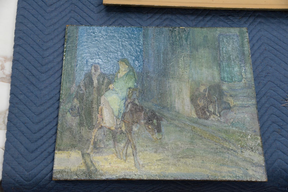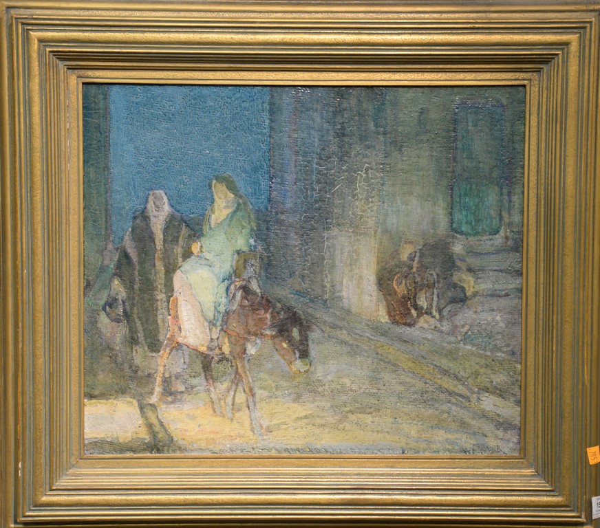 Henry Ossawa Tanner 1859-1937 Flight into Egypt oil on artist board signed lower right: H.O. Tanner 17 1/2 x 20 1/2 Written on verso: All the mastic varnished coul.. about 10% of what to believe to be hidded lines, June 14th painted a donkey’s Homestead Trip, June 15th varnished with glue mixture, August 17th all set glaze better America’s first internationally renowned African-American artist, Henry Ossawa Tanner was born in Pittsburgh to a well-educated and devoutly religious family. When Henry was age 13, his father, the Reverend Benjamin Tucker Tanner, moved the family to Philadelphia. With the support of his parents and inspiration from the art of the 1876 Philadelphia Exposition, he enrolled in the Pennsylvania Academy to study with Thomas Eakins who became a close friend. Tanner briefly painted animals and was determined to become the American Landseer in response to the demand for animal portraits. Between 1886 and 1887 Tanner was an illustrator for Harper Brothers, a publishing firm willing to advance black artists and writers. He then moved to Atlanta, Georgia, where he briefly and unsuccessfully ran a photography studio, but by 1891 he turned back to painting and sailed for France. In Paris he studied at the Julian Academy with Benjamin Constant and J.P. Laurens. He received many honors and was considered a ‘strong man’ at Julian’s before his first Salon picture. He traveled to celebrated locations as Pont-Aven, but remained relatively unswayed by contemporary art movements. Tanner discovered the Salons and their power to advance a painter’s career, both abroad and in America. The acceptance of his painting, The Banjo Lesson by the 1894 Salon marked both a turning point in his career and a shift in emphasis in his choice of subject, for it was his first major exploration of the pathos of the black in society. He returned briefly to Philadelphia but decided Paris was his natural home. At first, he was highly successful with genre painting but switched to religious subjects in the mid-1890’s and traveled extensively in the Near East to absorb Biblical references. In 1899, Tanner married Jessie Macauley Olssen, a white Californian, and decided to make France his home for the remainder of his life. He feared that Americans would not be accepting of an interracial marriage. In 1908, he wrote of France, There is a breadth, a generosity, an obsolete cosmopolitanism about her recognition of the fine arts, which bars no nationality, no race, no school, or variation of artistic method. Sources include: Antiques Magazine Peter Falk, Who Was Who in American Art