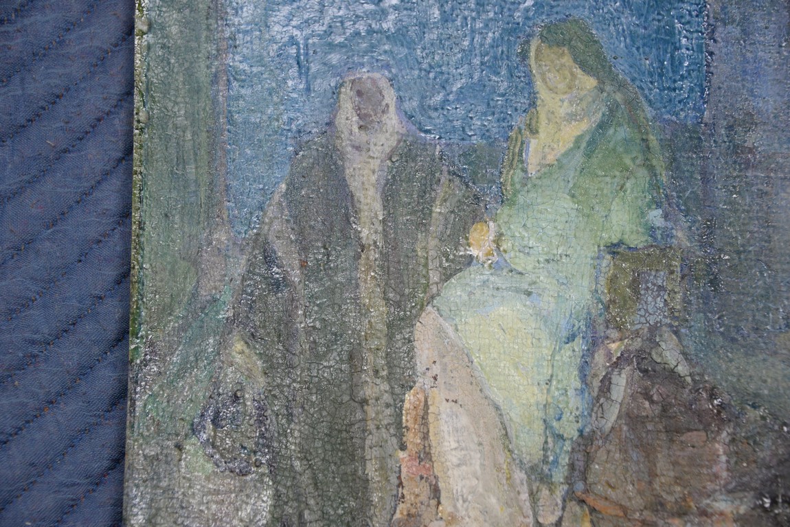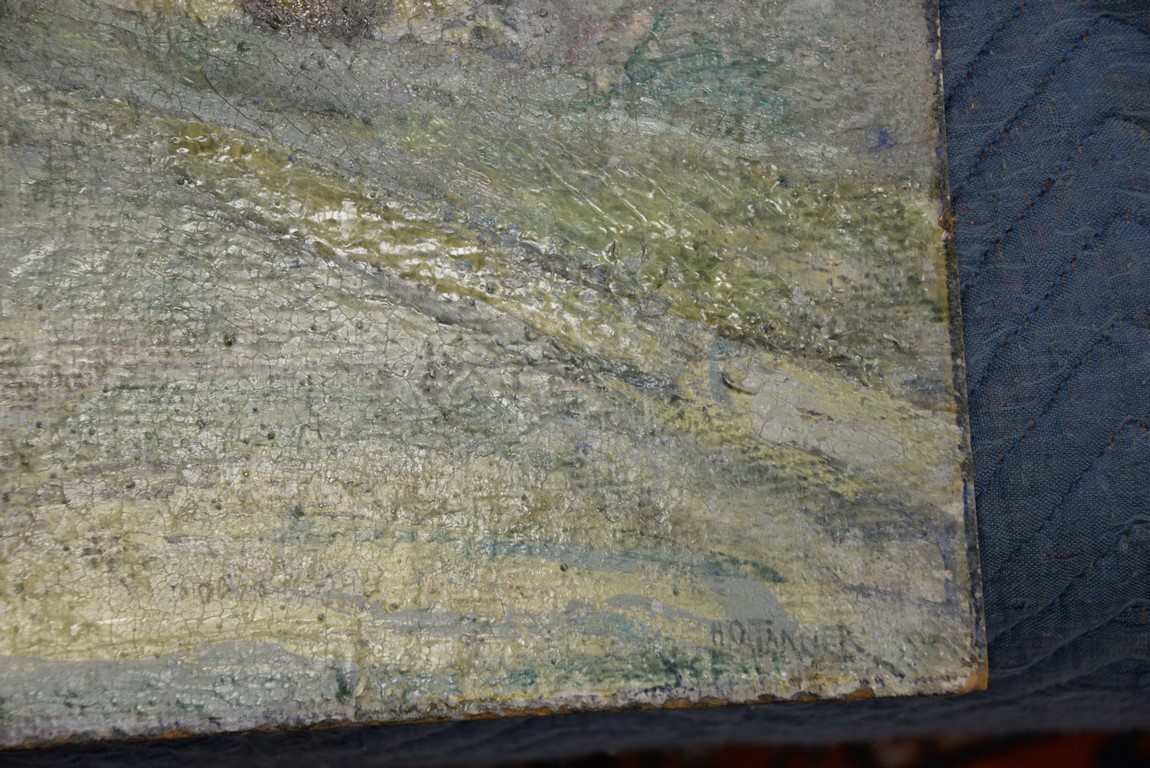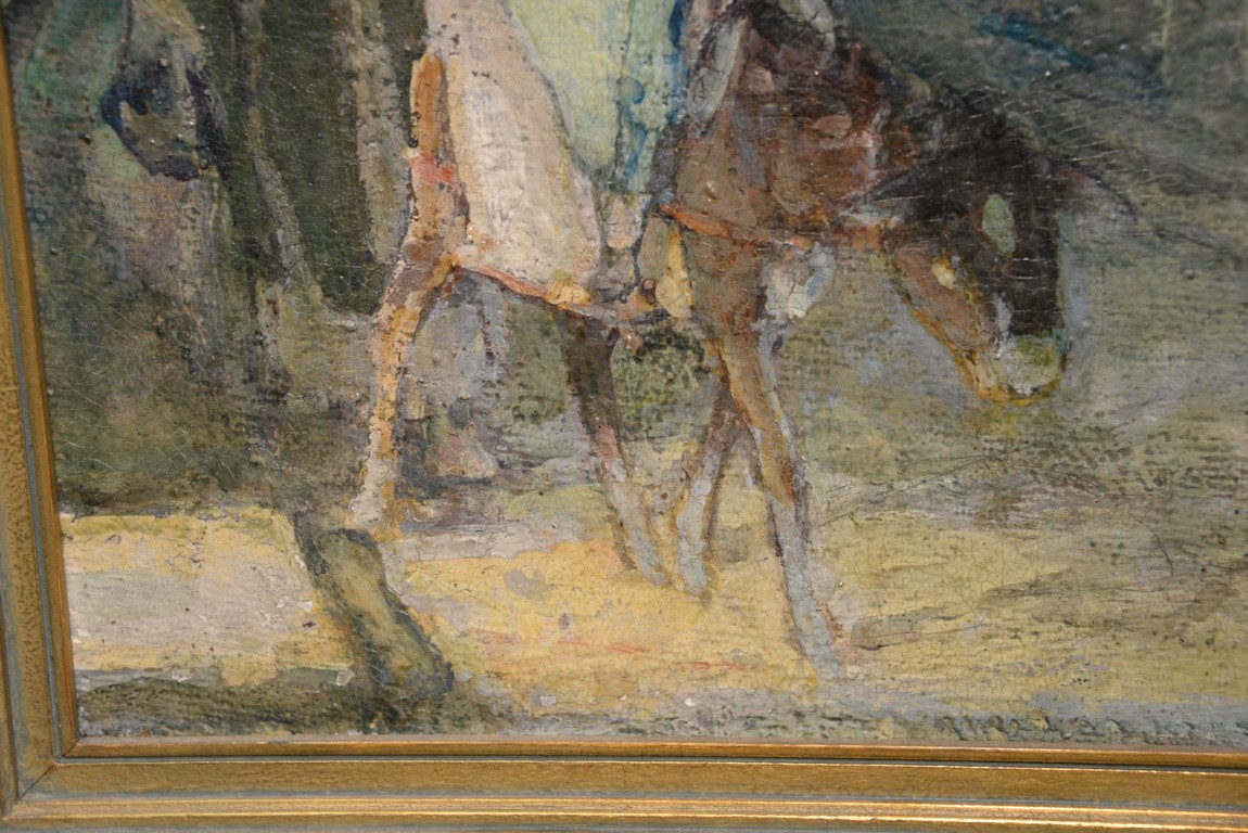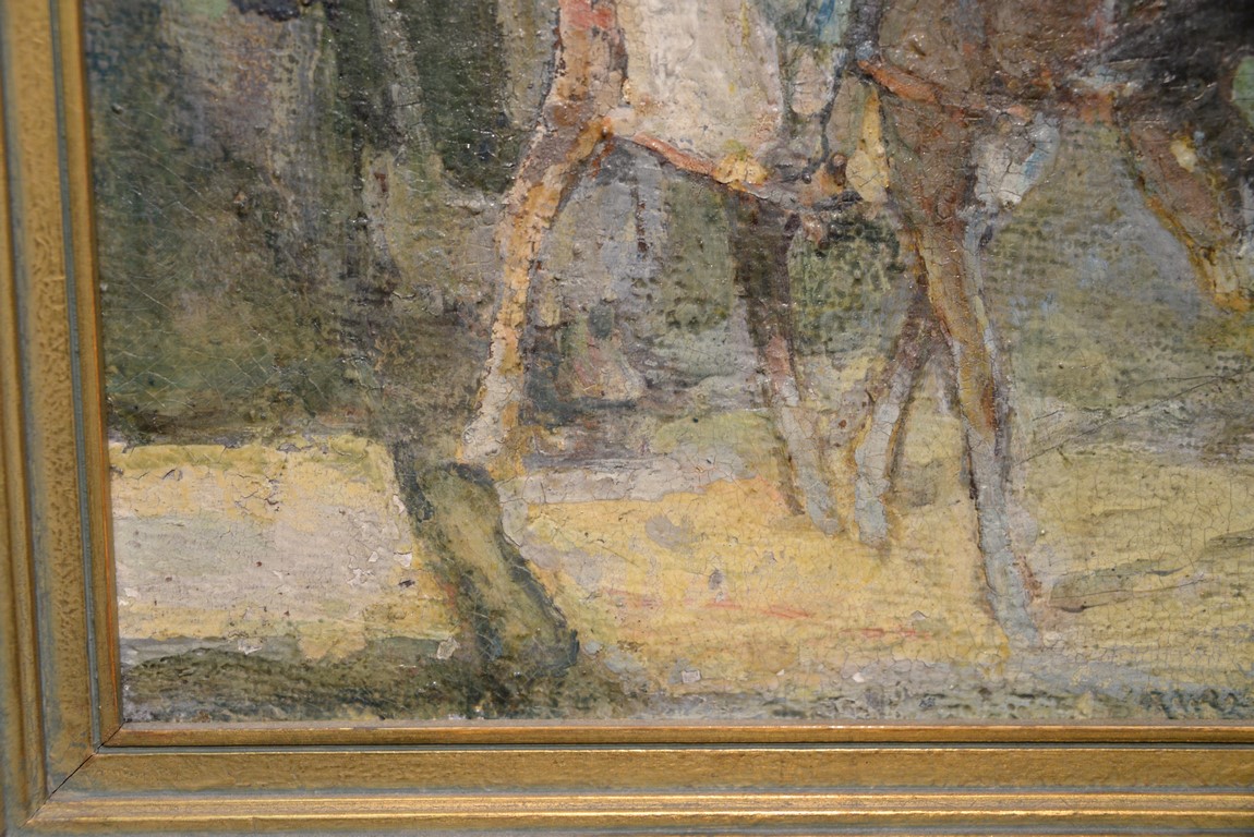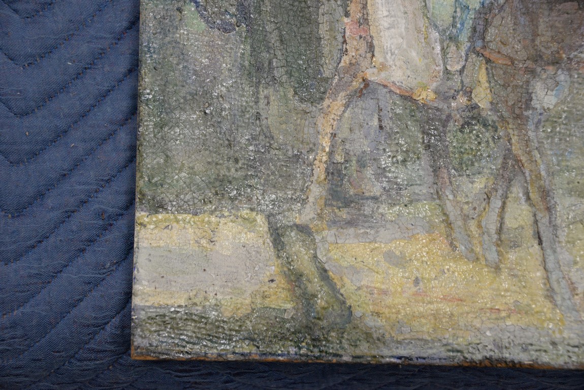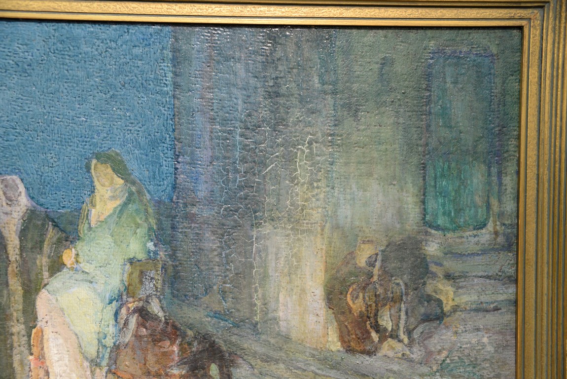 Henry Ossawa Tanner 1859-1937 Flight into Egypt oil on artist board signed lower right: H.O. Tanner 17 1/2 x 20 1/2 Written on verso: All the mastic varnished coul.. about 10% of what to believe to be hidded lines, June 14th painted a donkey’s Homestead Trip, June 15th varnished with glue mixture, August 17th all set glaze better America’s first internationally renowned African-American artist, Henry Ossawa Tanner was born in Pittsburgh to a well-educated and devoutly religious family. When Henry was age 13, his father, the Reverend Benjamin Tucker Tanner, moved the family to Philadelphia. With the support of his parents and inspiration from the art of the 1876 Philadelphia Exposition, he enrolled in the Pennsylvania Academy to study with Thomas Eakins who became a close friend. Tanner briefly painted animals and was determined to become the American Landseer in response to the demand for animal portraits. Between 1886 and 1887 Tanner was an illustrator for Harper Brothers, a publishing firm willing to advance black artists and writers. He then moved to Atlanta, Georgia, where he briefly and unsuccessfully ran a photography studio, but by 1891 he turned back to painting and sailed for France. In Paris he studied at the Julian Academy with Benjamin Constant and J.P. Laurens. He received many honors and was considered a ‘strong man’ at Julian’s before his first Salon picture. He traveled to celebrated locations as Pont-Aven, but remained relatively unswayed by contemporary art movements. Tanner discovered the Salons and their power to advance a painter’s career, both abroad and in America. The acceptance of his painting, The Banjo Lesson by the 1894 Salon marked both a turning point in his career and a shift in emphasis in his choice of subject, for it was his first major exploration of the pathos of the black in society. He returned briefly to Philadelphia but decided Paris was his natural home. At first, he was highly successful with genre painting but switched to religious subjects in the mid-1890’s and traveled extensively in the Near East to absorb Biblical references. In 1899, Tanner married Jessie Macauley Olssen, a white Californian, and decided to make France his home for the remainder of his life. He feared that Americans would not be accepting of an interracial marriage. In 1908, he wrote of France, There is a breadth, a generosity, an obsolete cosmopolitanism about her recognition of the fine arts, which bars no nationality, no race, no school, or variation of artistic method. Sources include: Antiques Magazine Peter Falk, Who Was Who in American Art