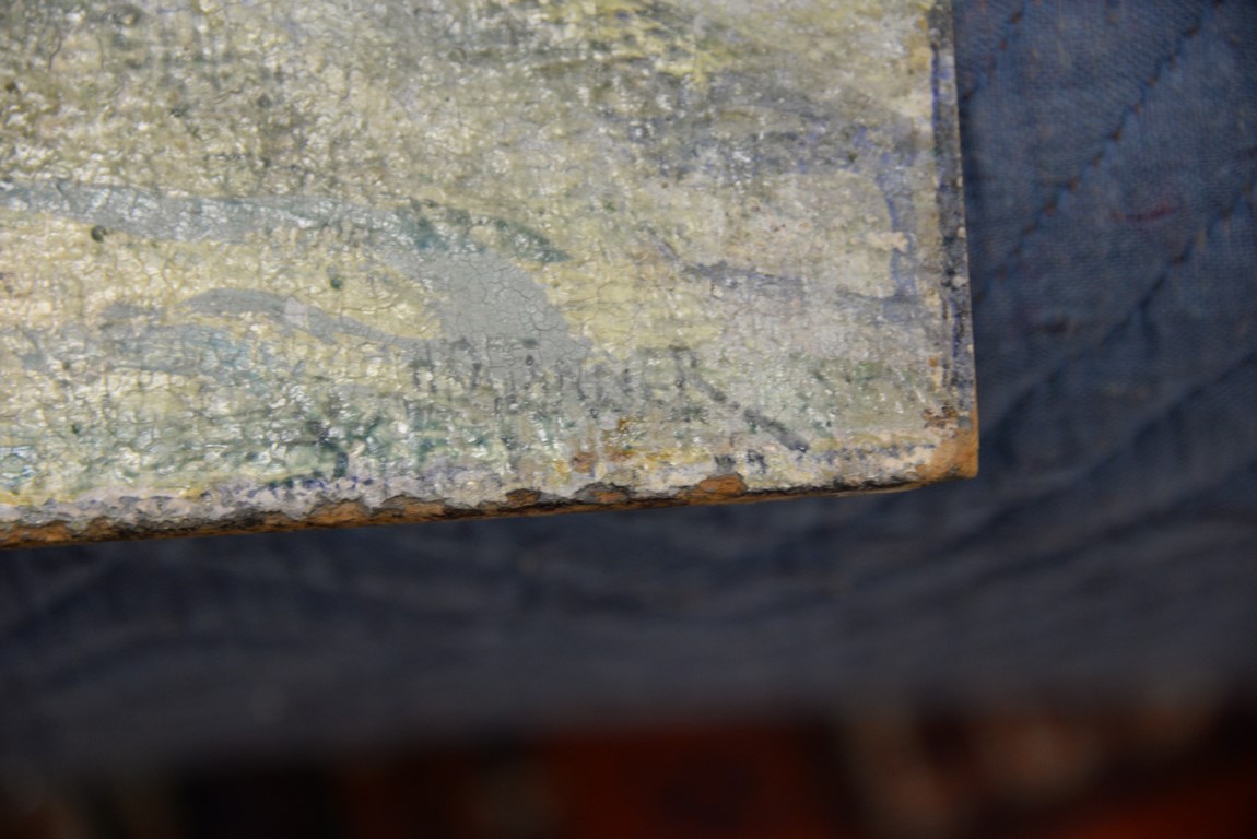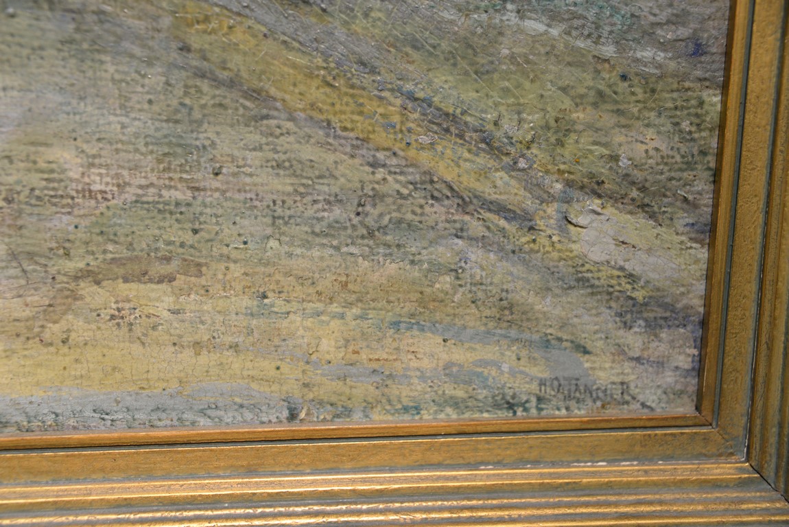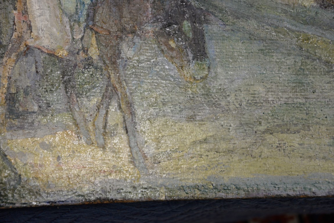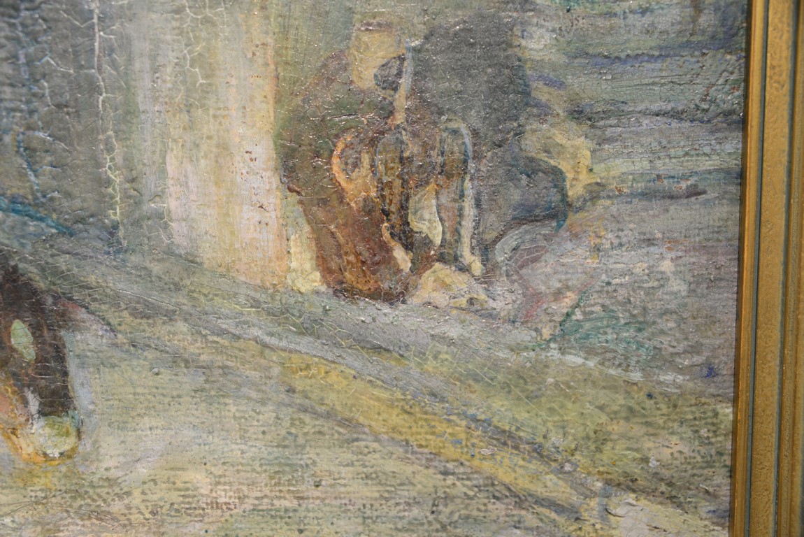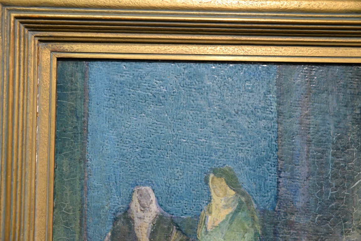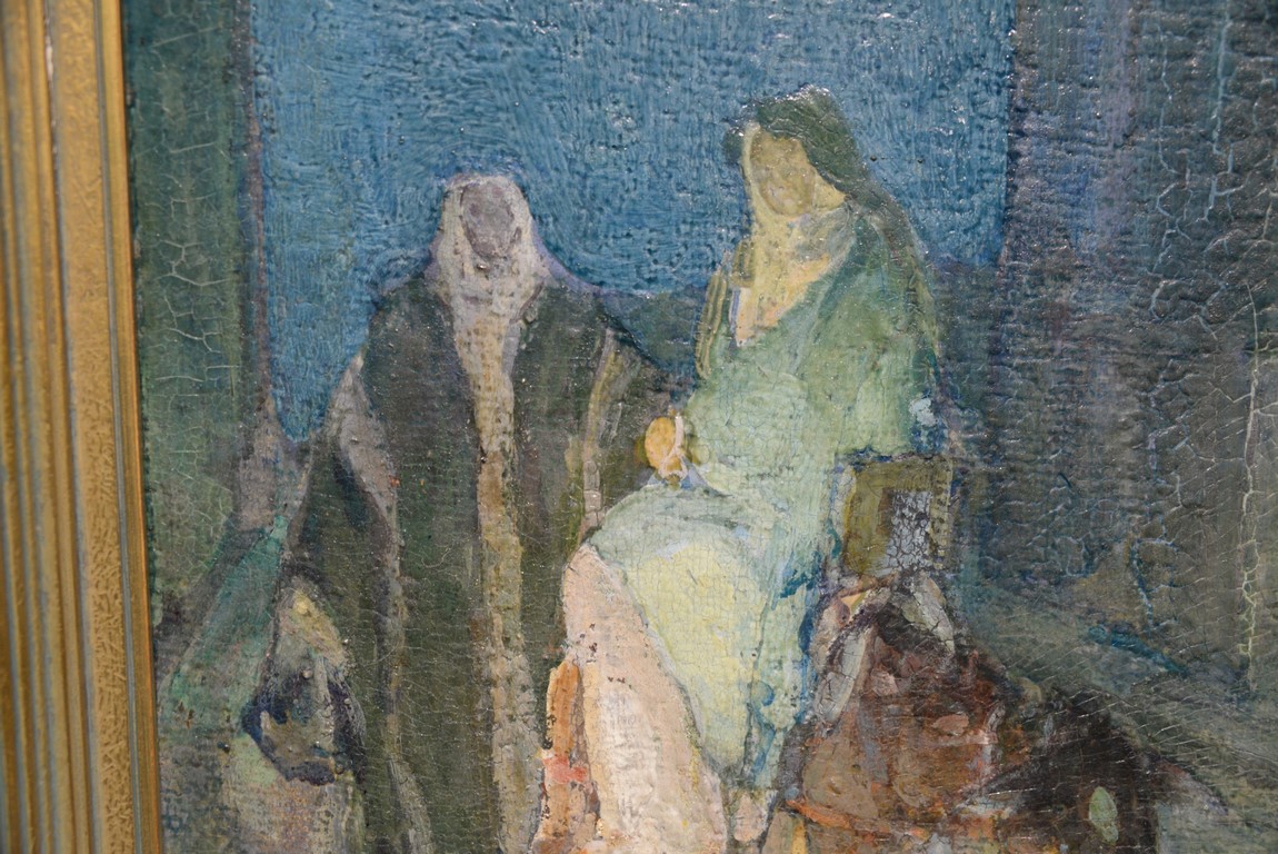 Henry Ossawa Tanner 1859-1937 Flight into Egypt oil on artist board signed lower right: H.O. Tanner 17 1/2 x 20 1/2 Written on verso: All the mastic varnished coul.. about 10% of what to believe to be hidded lines, June 14th painted a donkey’s Homestead Trip, June 15th varnished with glue mixture, August 17th all set glaze better America’s first internationally renowned African-American artist, Henry Ossawa Tanner was born in Pittsburgh to a well-educated and devoutly religious family. When Henry was age 13, his father, the Reverend Benjamin Tucker Tanner, moved the family to Philadelphia. With the support of his parents and inspiration from the art of the 1876 Philadelphia Exposition, he enrolled in the Pennsylvania Academy to study with Thomas Eakins who became a close friend. Tanner briefly painted animals and was determined to become the American Landseer in response to the demand for animal portraits. Between 1886 and 1887 Tanner was an illustrator for Harper Brothers, a publishing firm willing to advance black artists and writers. He then moved to Atlanta, Georgia, where he briefly and unsuccessfully ran a photography studio, but by 1891 he turned back to painting and sailed for France. In Paris he studied at the Julian Academy with Benjamin Constant and J.P. Laurens. He received many honors and was considered a ‘strong man’ at Julian’s before his first Salon picture. He traveled to celebrated locations as Pont-Aven, but remained relatively unswayed by contemporary art movements. Tanner discovered the Salons and their power to advance a painter’s career, both abroad and in America. The acceptance of his painting, The Banjo Lesson by the 1894 Salon marked both a turning point in his career and a shift in emphasis in his choice of subject, for it was his first major exploration of the pathos of the black in society. He returned briefly to Philadelphia but decided Paris was his natural home. At first, he was highly successful with genre painting but switched to religious subjects in the mid-1890’s and traveled extensively in the Near East to absorb Biblical references. In 1899, Tanner married Jessie Macauley Olssen, a white Californian, and decided to make France his home for the remainder of his life. He feared that Americans would not be accepting of an interracial marriage. In 1908, he wrote of France, There is a breadth, a generosity, an obsolete cosmopolitanism about her recognition of the fine arts, which bars no nationality, no race, no school, or variation of artistic method. Sources include: Antiques Magazine Peter Falk, Who Was Who in American Art