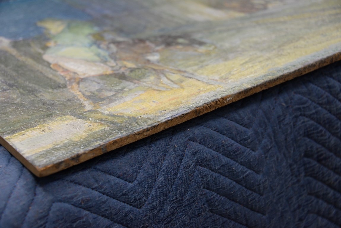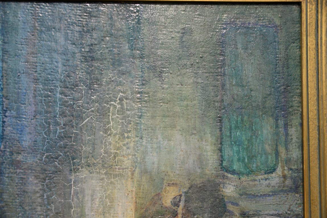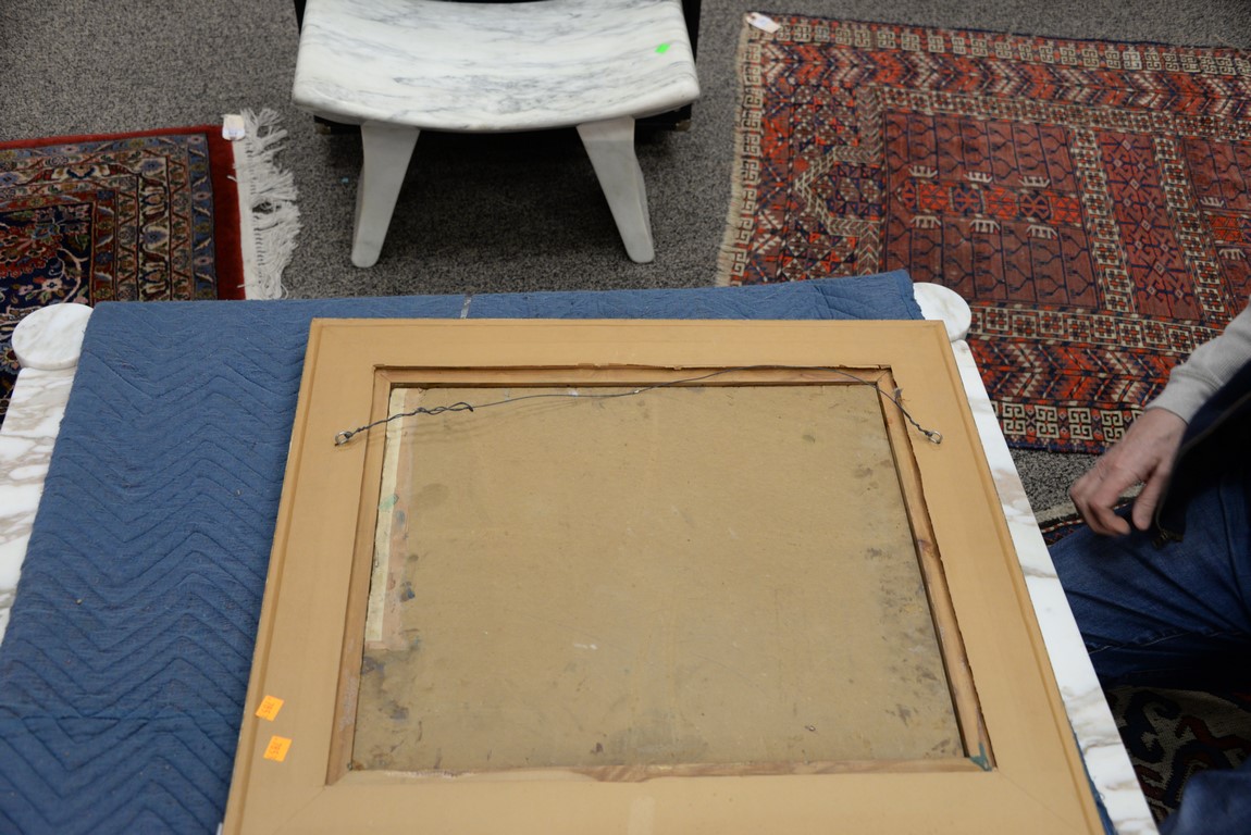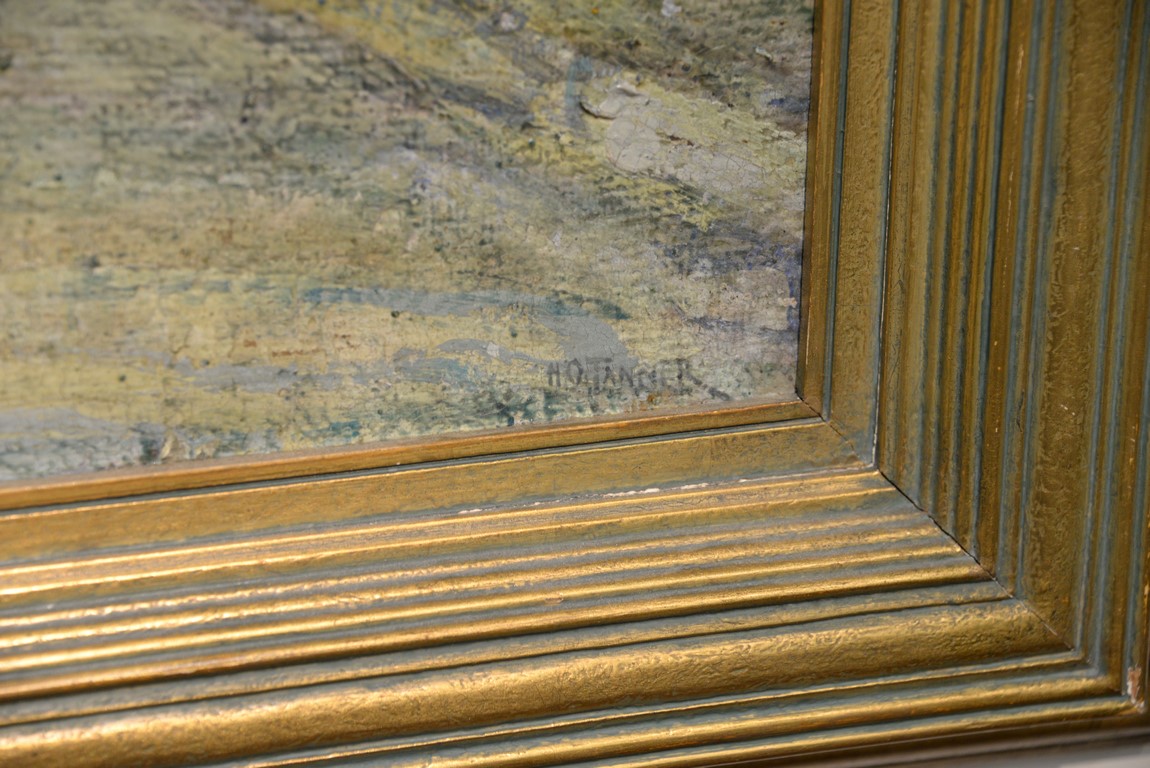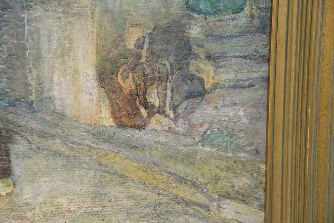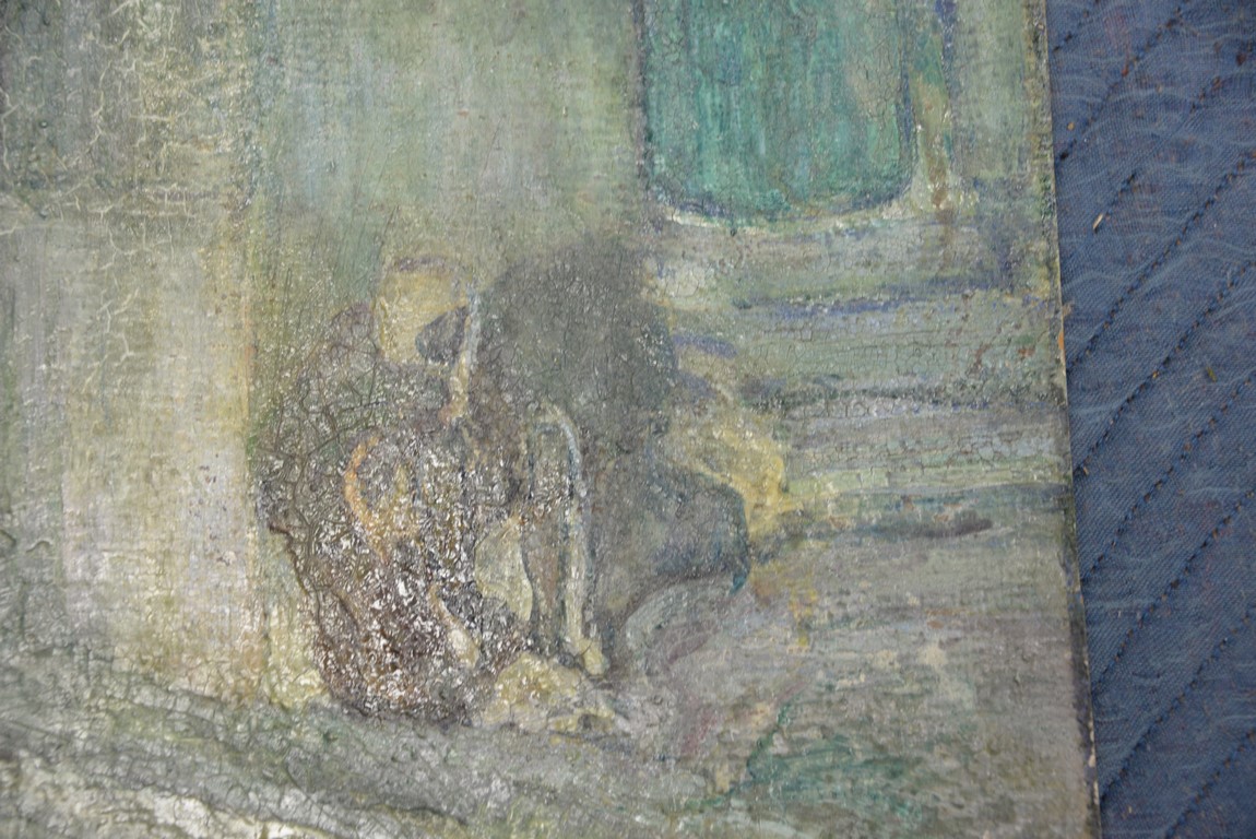 Henry Ossawa Tanner 1859-1937 Flight into Egypt oil on artist board signed lower right: H.O. Tanner 17 1/2 x 20 1/2 Written on verso: All the mastic varnished coul.. about 10% of what to believe to be hidded lines, June 14th painted a donkey’s Homestead Trip, June 15th varnished with glue mixture, August 17th all set glaze better America’s first internationally renowned African-American artist, Henry Ossawa Tanner was born in Pittsburgh to a well-educated and devoutly religious family. When Henry was age 13, his father, the Reverend Benjamin Tucker Tanner, moved the family to Philadelphia. With the support of his parents and inspiration from the art of the 1876 Philadelphia Exposition, he enrolled in the Pennsylvania Academy to study with Thomas Eakins who became a close friend. Tanner briefly painted animals and was determined to become the American Landseer in response to the demand for animal portraits. Between 1886 and 1887 Tanner was an illustrator for Harper Brothers, a publishing firm willing to advance black artists and writers. He then moved to Atlanta, Georgia, where he briefly and unsuccessfully ran a photography studio, but by 1891 he turned back to painting and sailed for France. In Paris he studied at the Julian Academy with Benjamin Constant and J.P. Laurens. He received many honors and was considered a ‘strong man’ at Julian’s before his first Salon picture. He traveled to celebrated locations as Pont-Aven, but remained relatively unswayed by contemporary art movements. Tanner discovered the Salons and their power to advance a painter’s career, both abroad and in America. The acceptance of his painting, The Banjo Lesson by the 1894 Salon marked both a turning point in his career and a shift in emphasis in his choice of subject, for it was his first major exploration of the pathos of the black in society. He returned briefly to Philadelphia but decided Paris was his natural home. At first, he was highly successful with genre painting but switched to religious subjects in the mid-1890’s and traveled extensively in the Near East to absorb Biblical references. In 1899, Tanner married Jessie Macauley Olssen, a white Californian, and decided to make France his home for the remainder of his life. He feared that Americans would not be accepting of an interracial marriage. In 1908, he wrote of France, There is a breadth, a generosity, an obsolete cosmopolitanism about her recognition of the fine arts, which bars no nationality, no race, no school, or variation of artistic method. Sources include: Antiques Magazine Peter Falk, Who Was Who in American Art