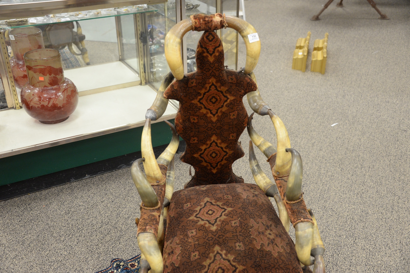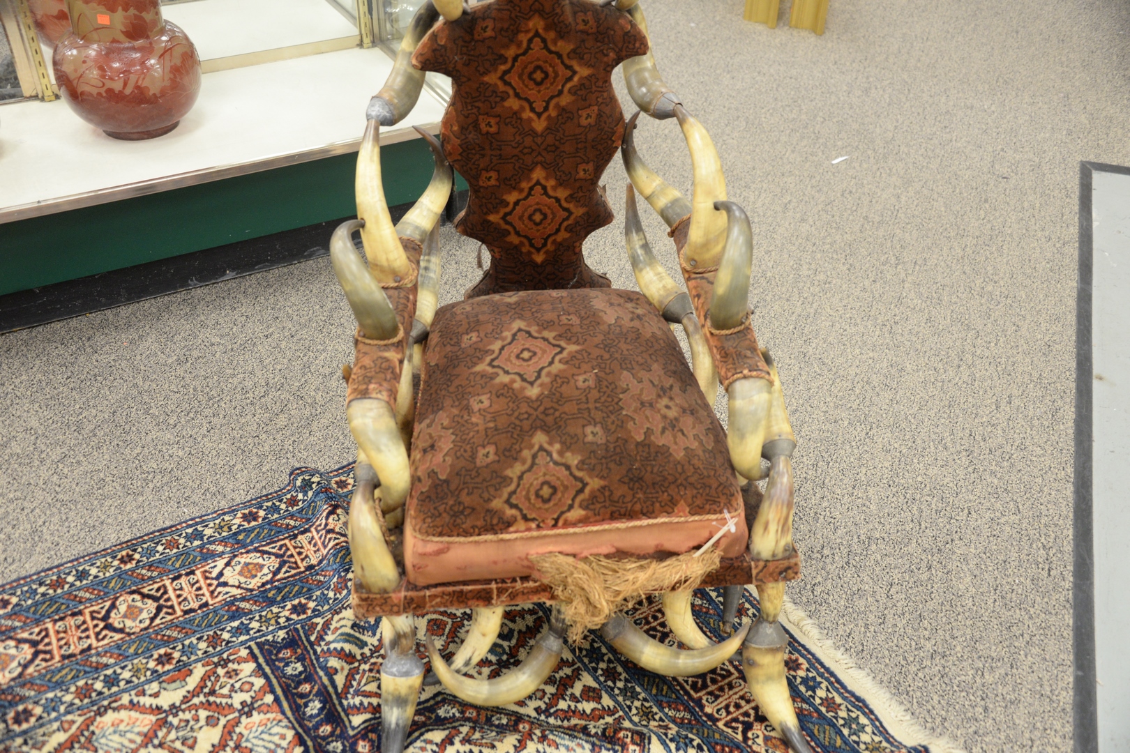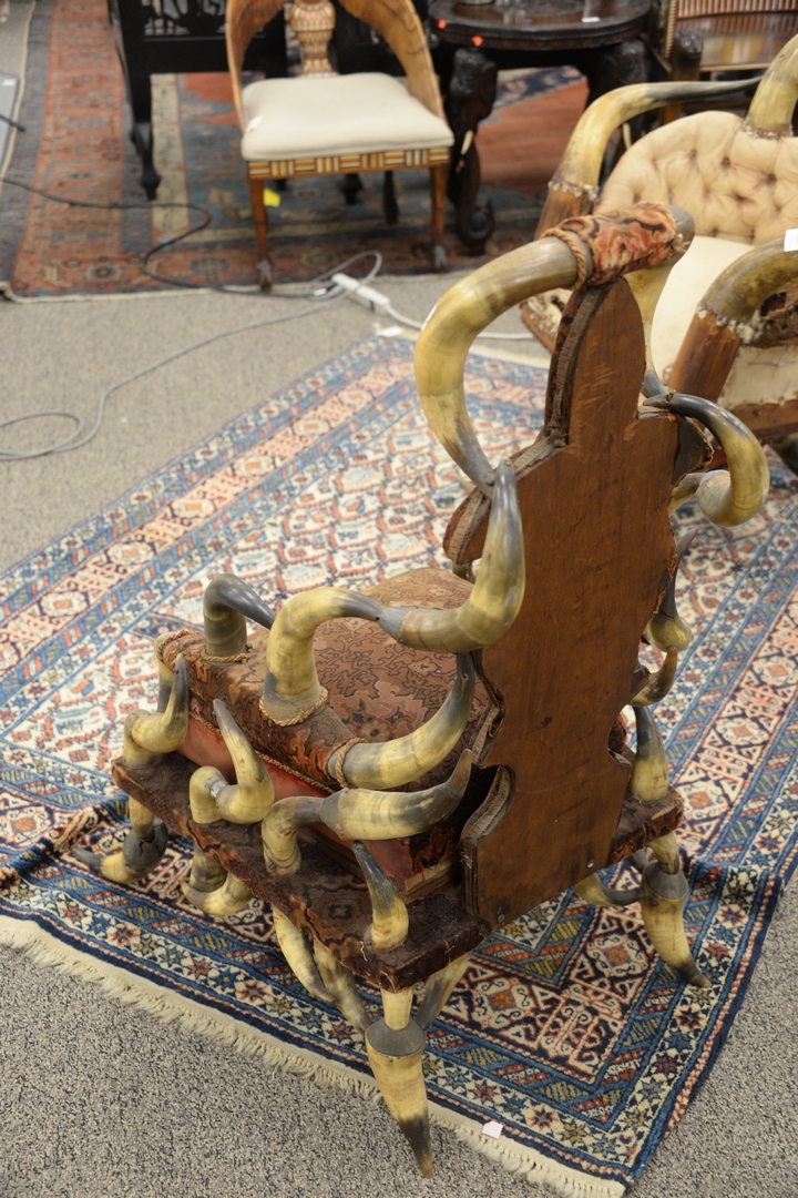 Horn Armchair, having Victorian upholstery, height 41 inches, width 23 inches.