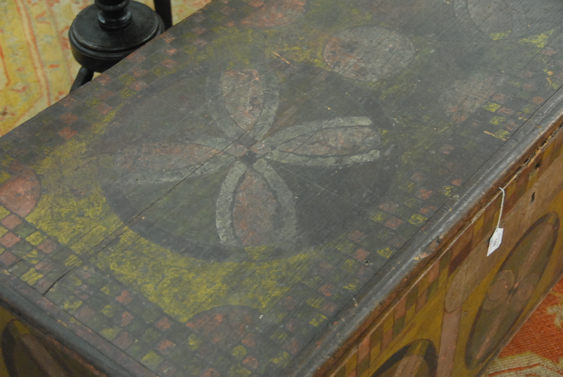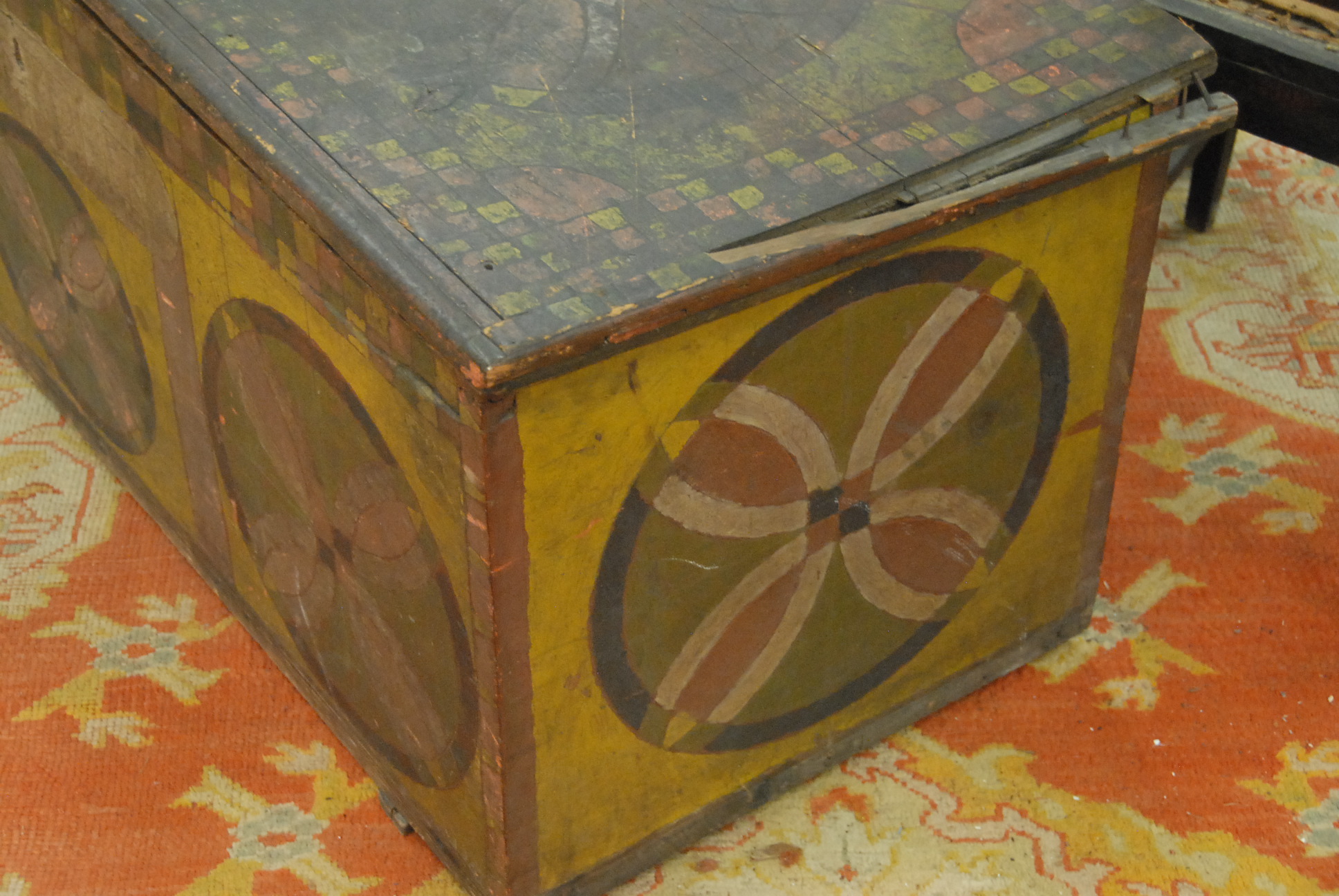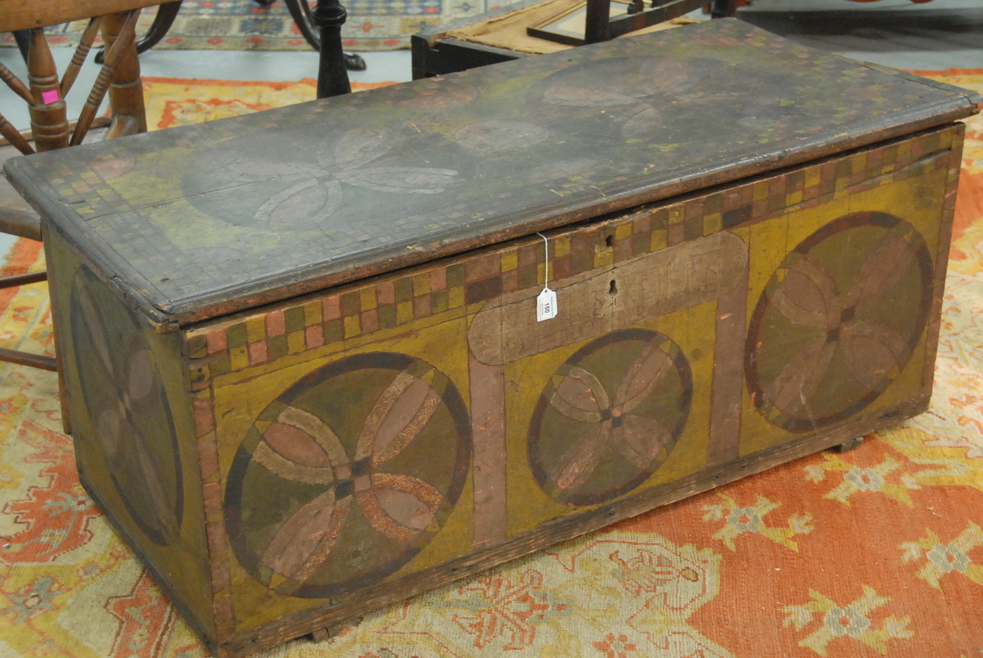 Lot 150: Lift top chest with original paint decoration yellow, green, and red with pinwheels and squares, marked on front John Kumer Ten December 1841 bottom molding missing, top hinges as is. ht. 21 in. wd. 50 in. dp. 20 3/4 in.