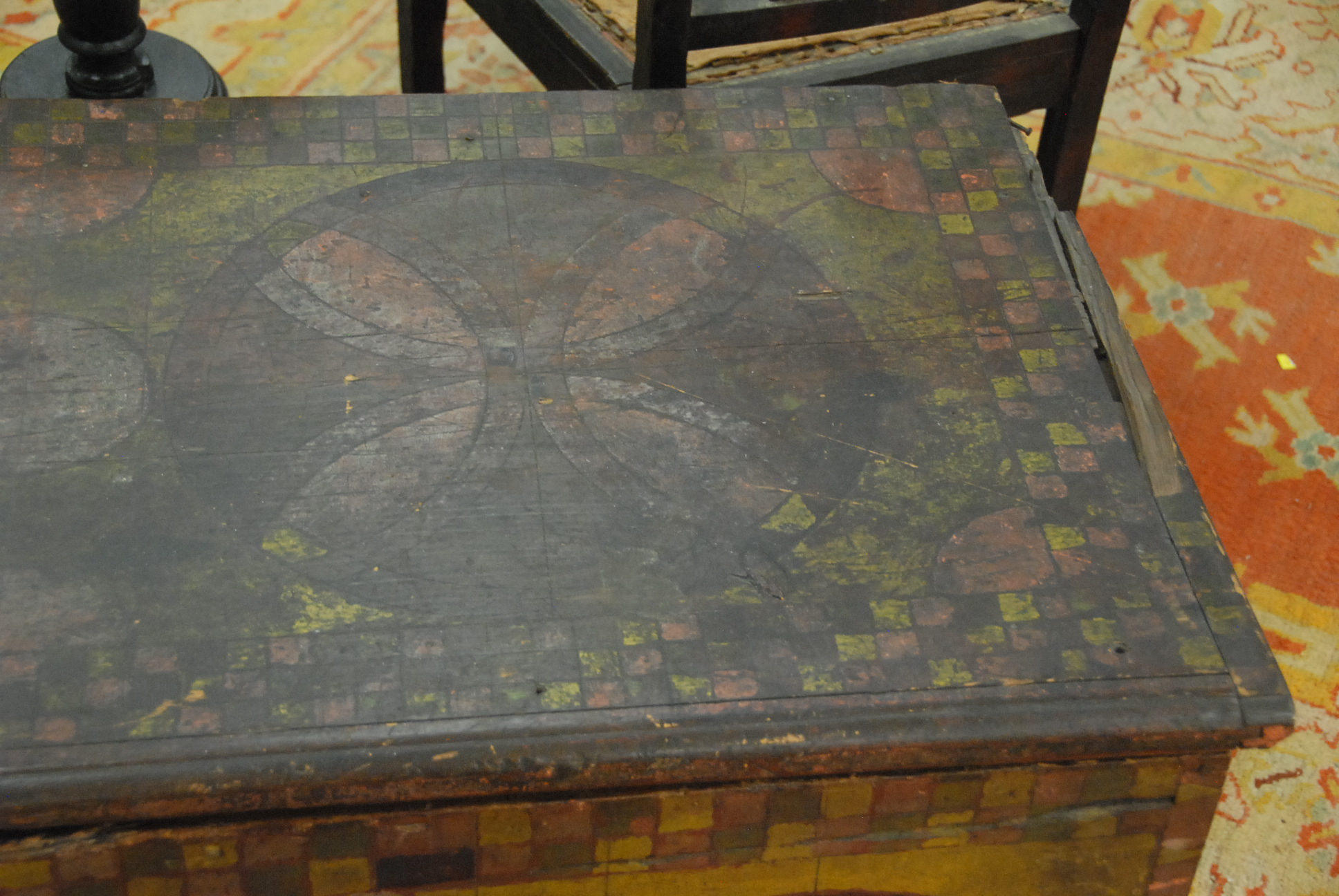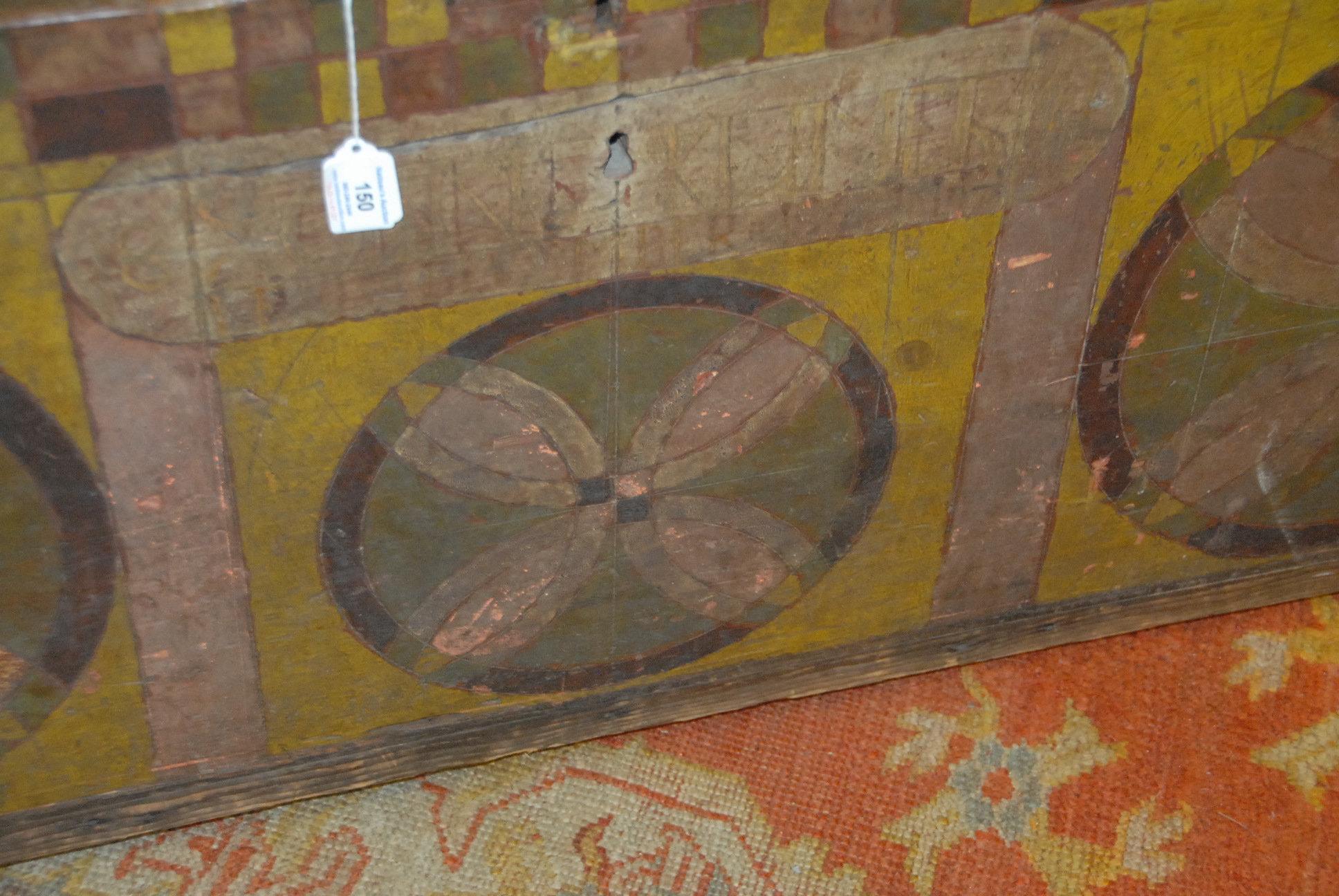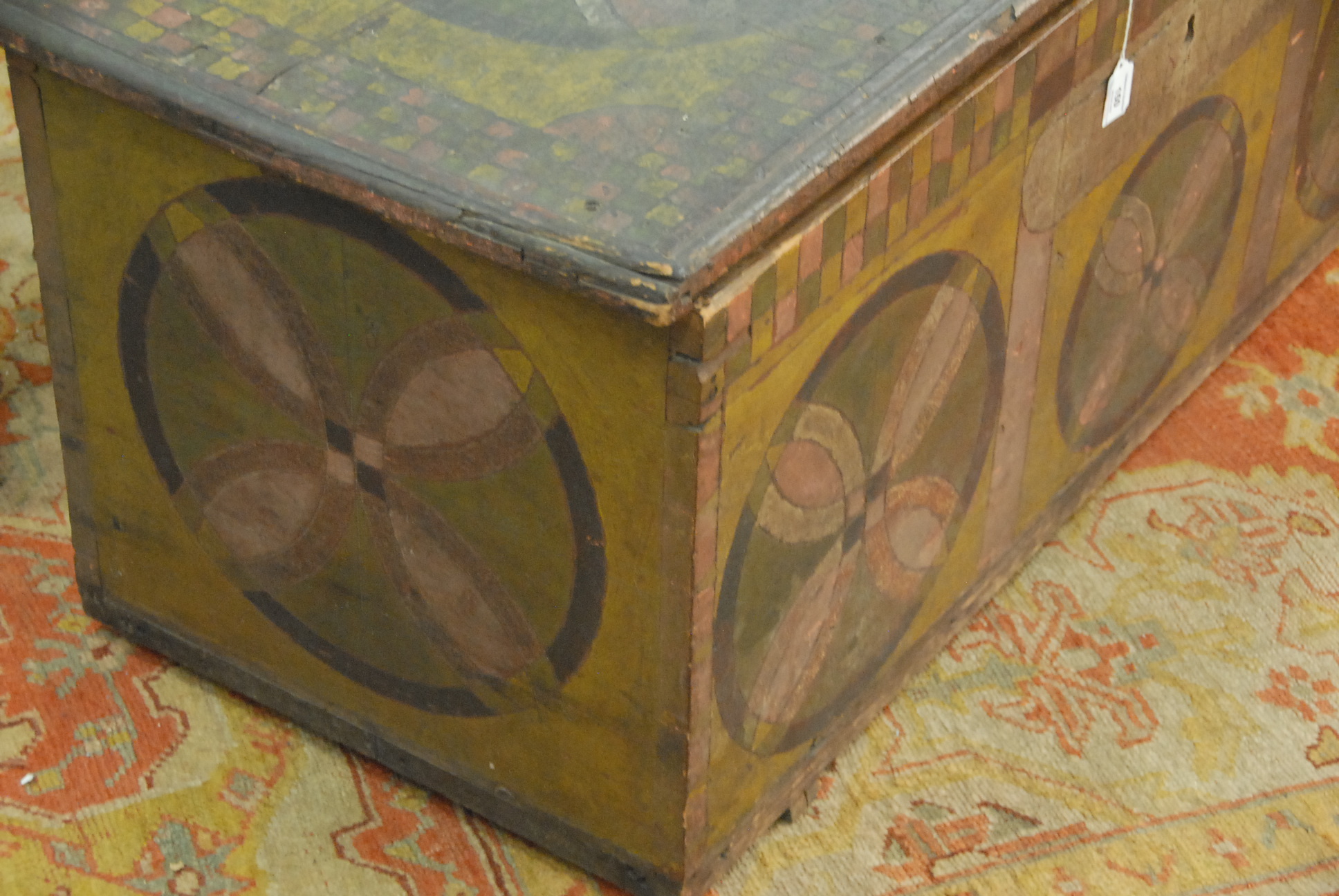 Lot 150: Lift top chest with original paint decoration yellow, green, and red with pinwheels and squares, marked on front John Kumer Ten December 1841 bottom molding missing, top hinges as is. ht. 21 in. wd. 50 in. dp. 20 3/4 in.