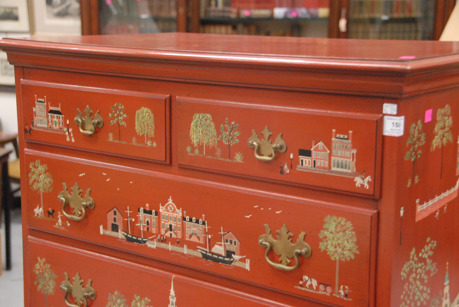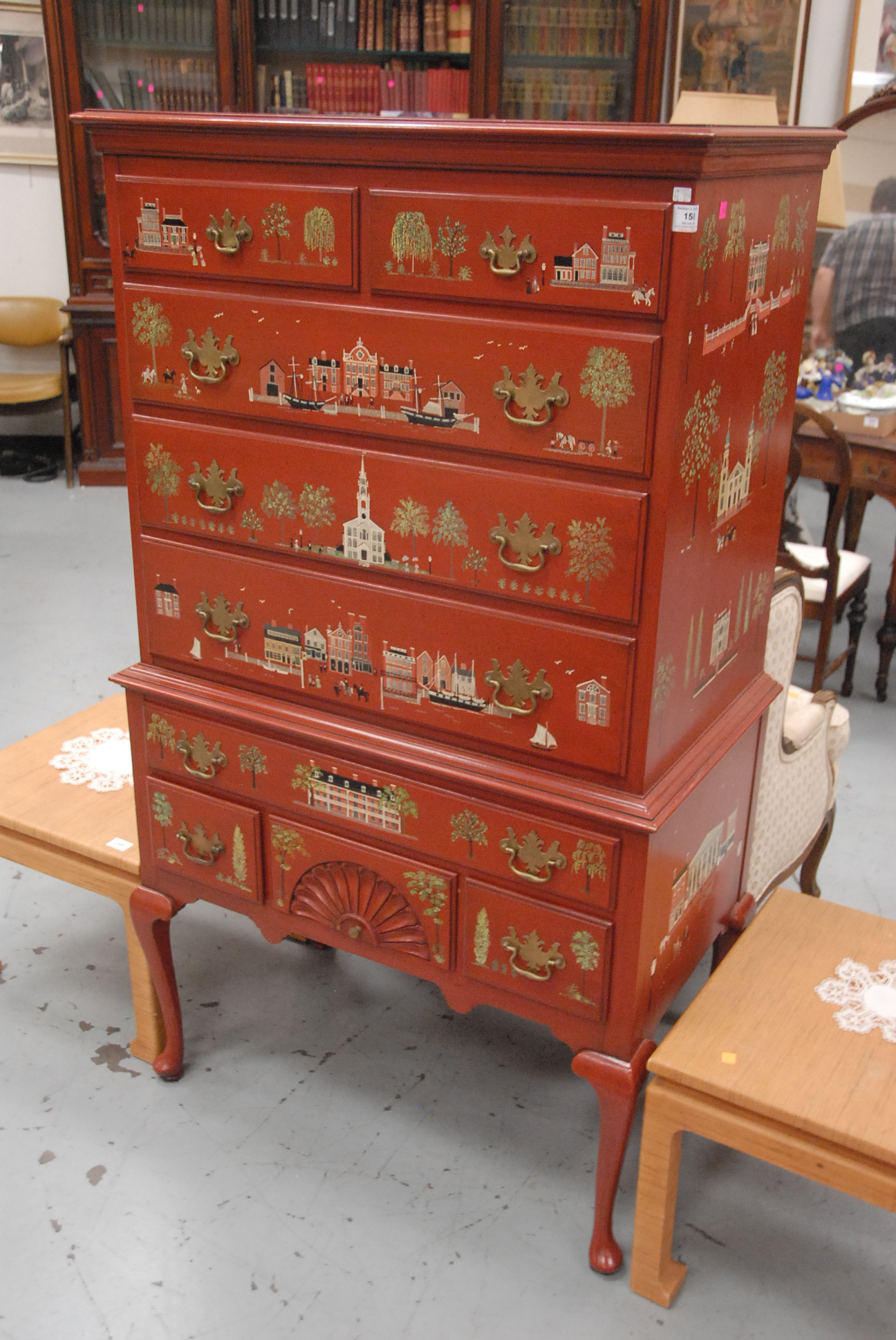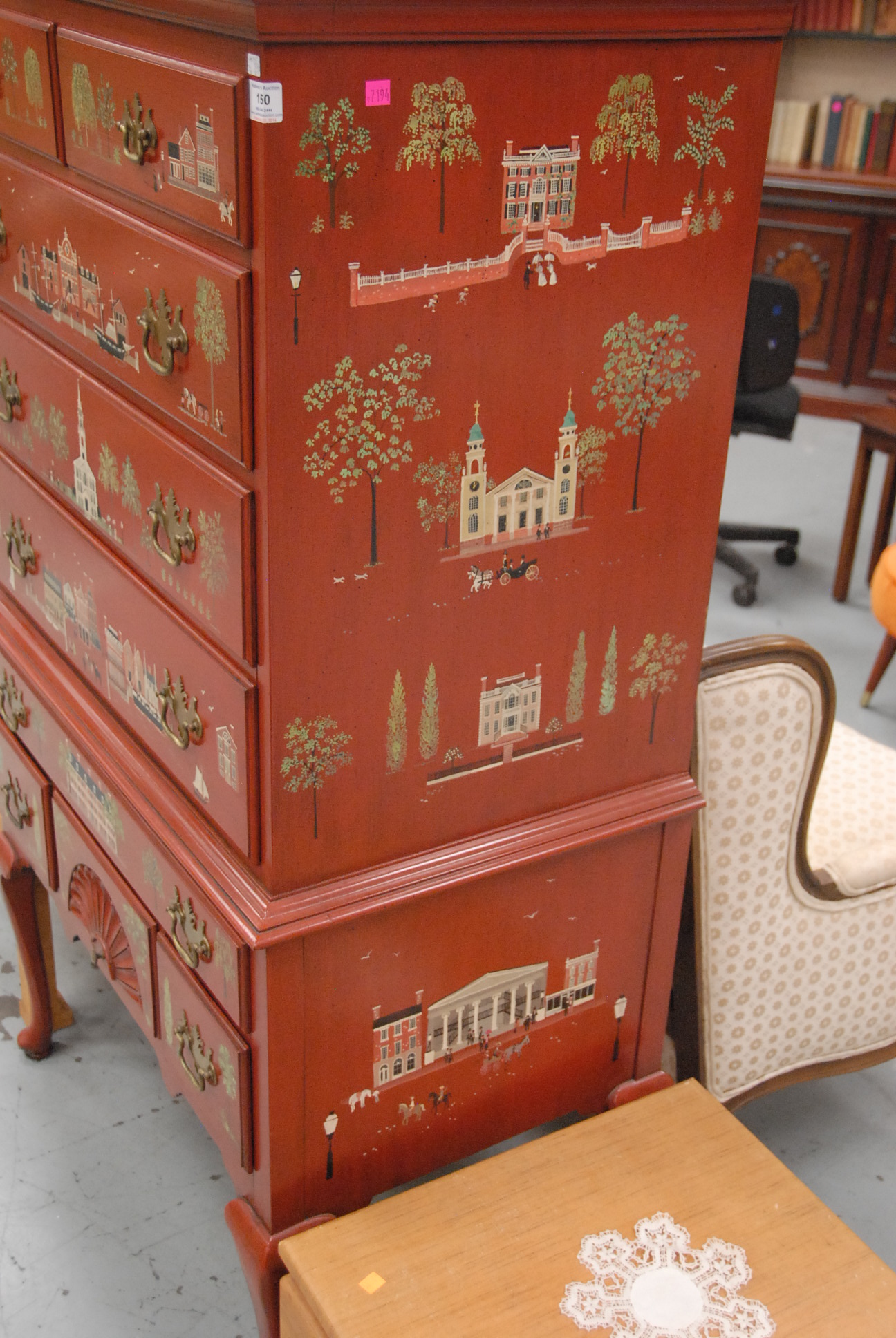 Lot 150: Maxwell Mays painted highboy, painted with Providence scenes. ht. 59in. wd. 33in.