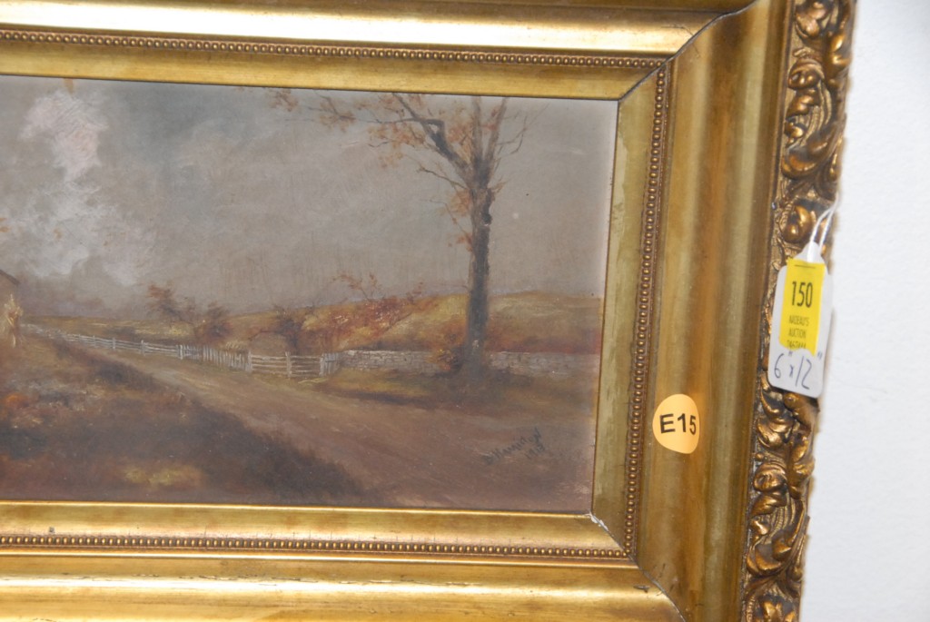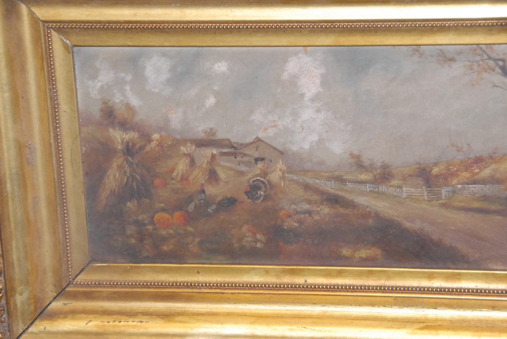 Lot 150: Oil on board signed B. Hamilton 1913 farm scene with haystacks turkeys and pumpkins in a patch, 6 x 12.