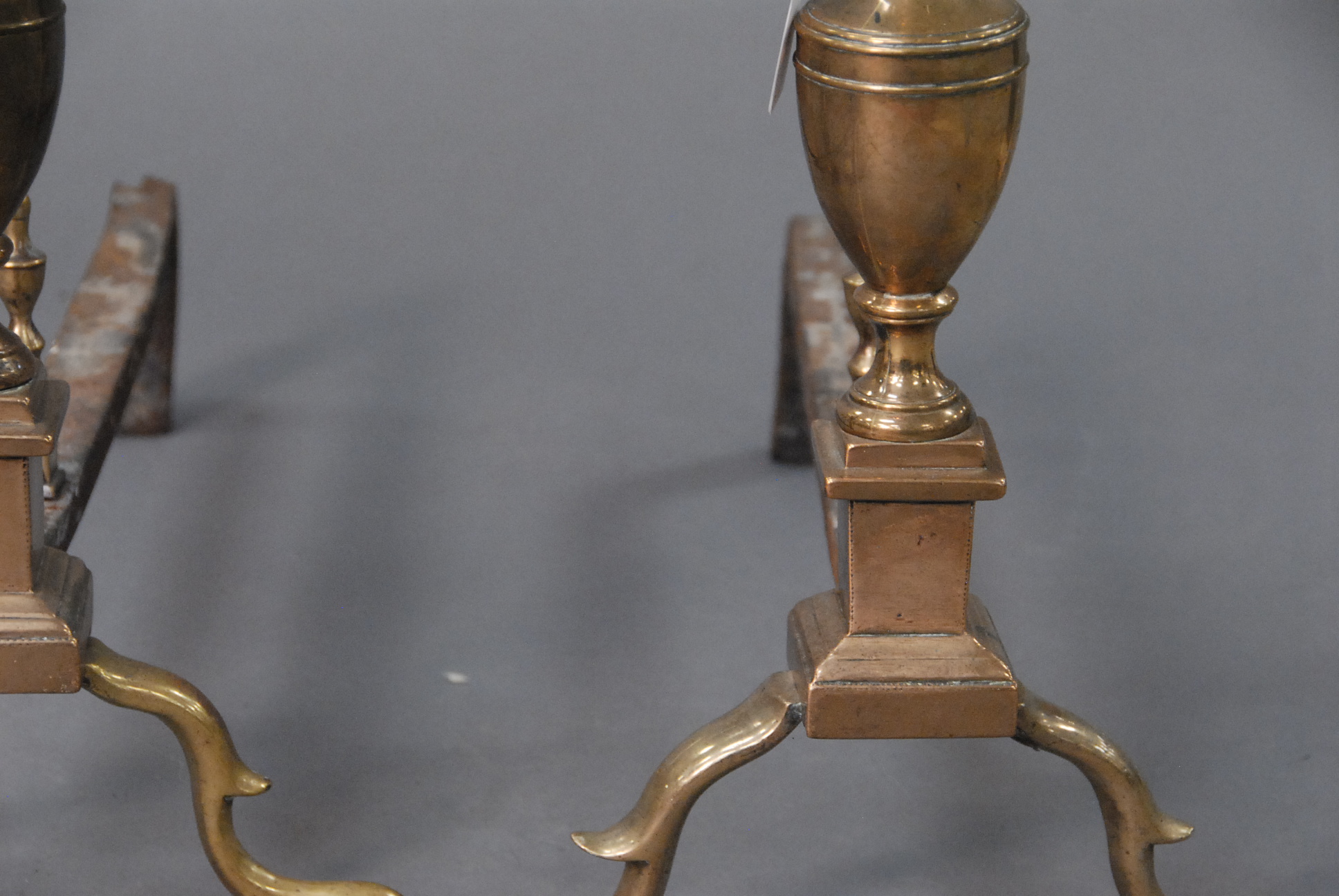 Pair of Federal brass andirons with urn tops and log stops, circa 1820.