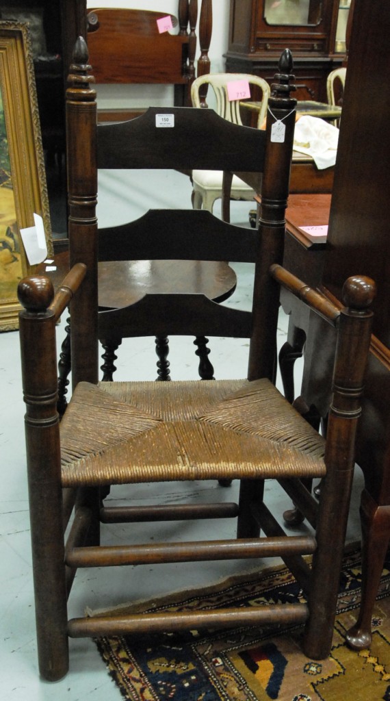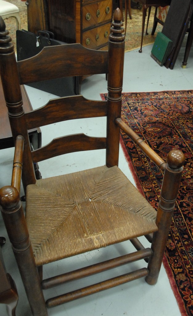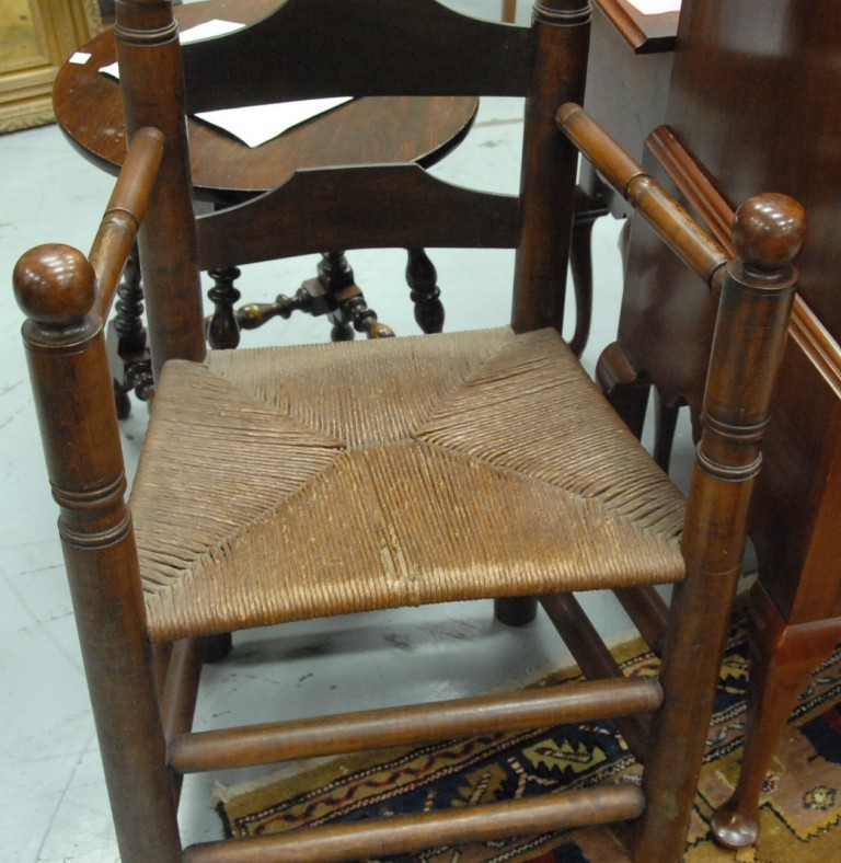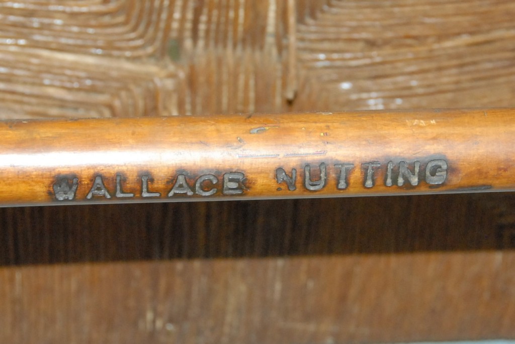 Pair of Wallace Nutting armchairs Pilgrim Century style with turned finials, three slats, ball hand rests, and rush seats, branded Wallace Nutting in block letters. height 47in. width 25in. seat height 18in.