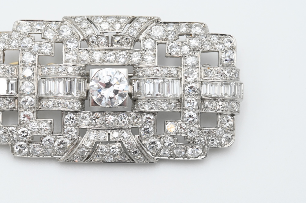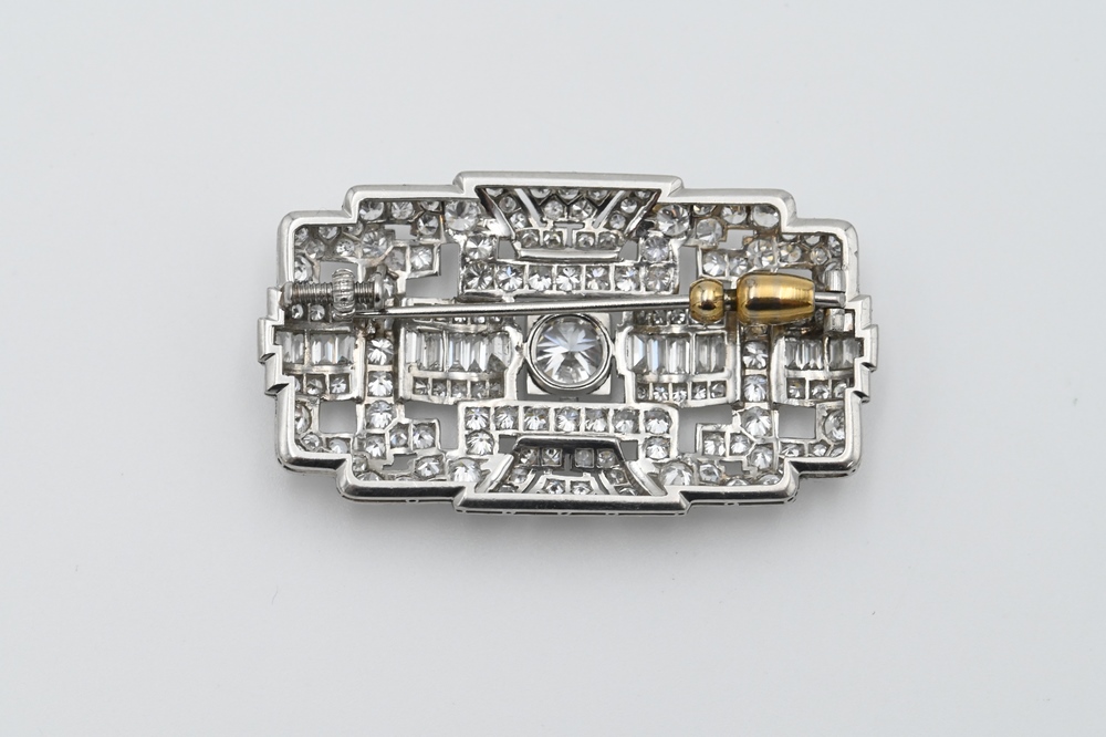 Platinum Diamond Brooch, rectangular shape, measuring approximately 2 x 1 1/8 inches, pave set with 154 round full and single cut diamonds, diamonds have an approximate total carat weight of 6.0 carats by formula averaging H-I color and S12 -I1 clarity; the center diamond is round brilliant cut with H-I color and S12 – I1 clarity with an approximate carat weight of 1.40 by formula, measuring approximately 7.25 x 7.29 x 4.35 millimeters; the center diamond is flanked by 20 straight baguette cut diamonds averaging H-I color and VS clarity, with an approximate carat weight of 1.20 by formula; the pin with diamonds weighs approximately 11.40 dwt.; 175 diamond total, 8.6 total carats in diamonds.