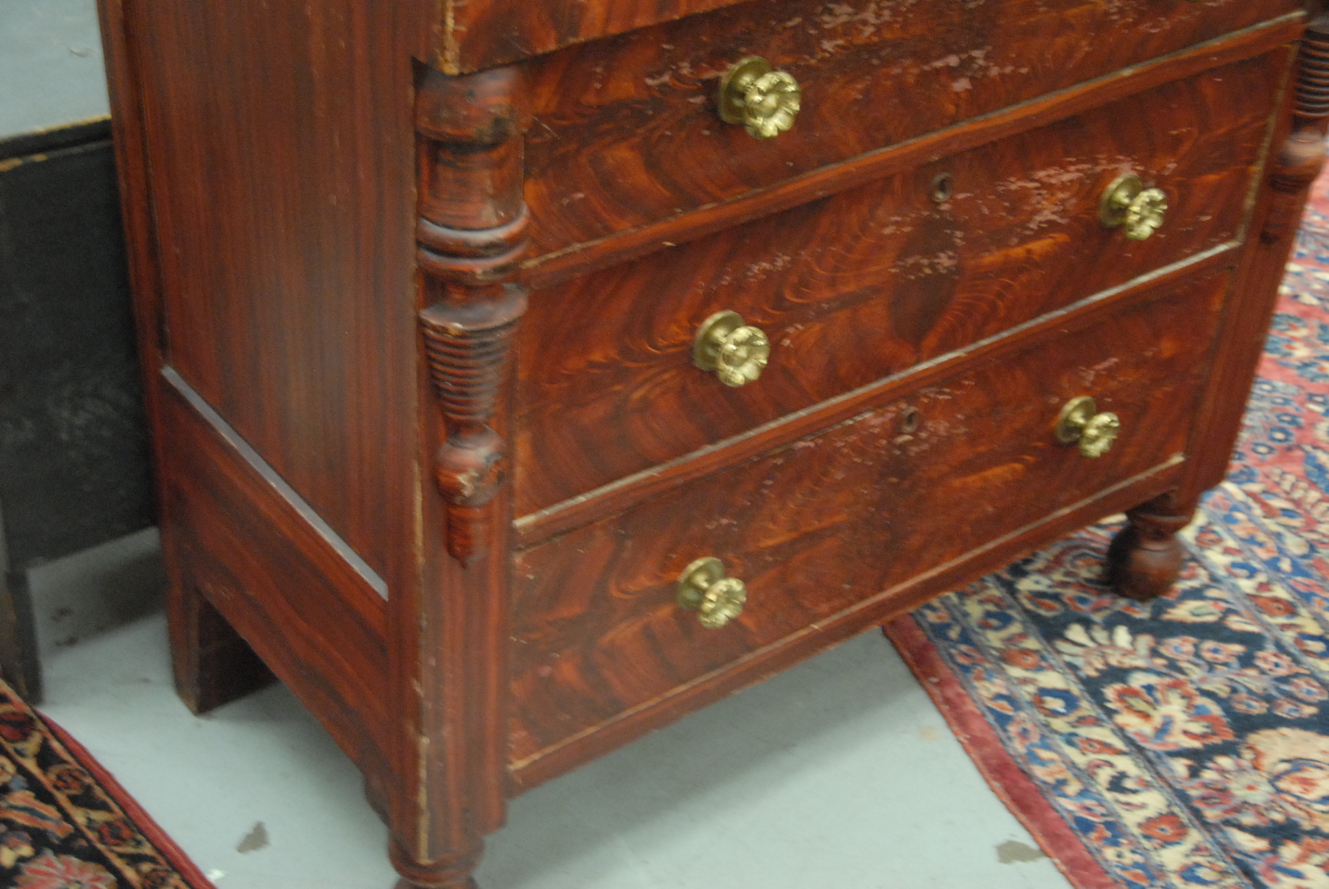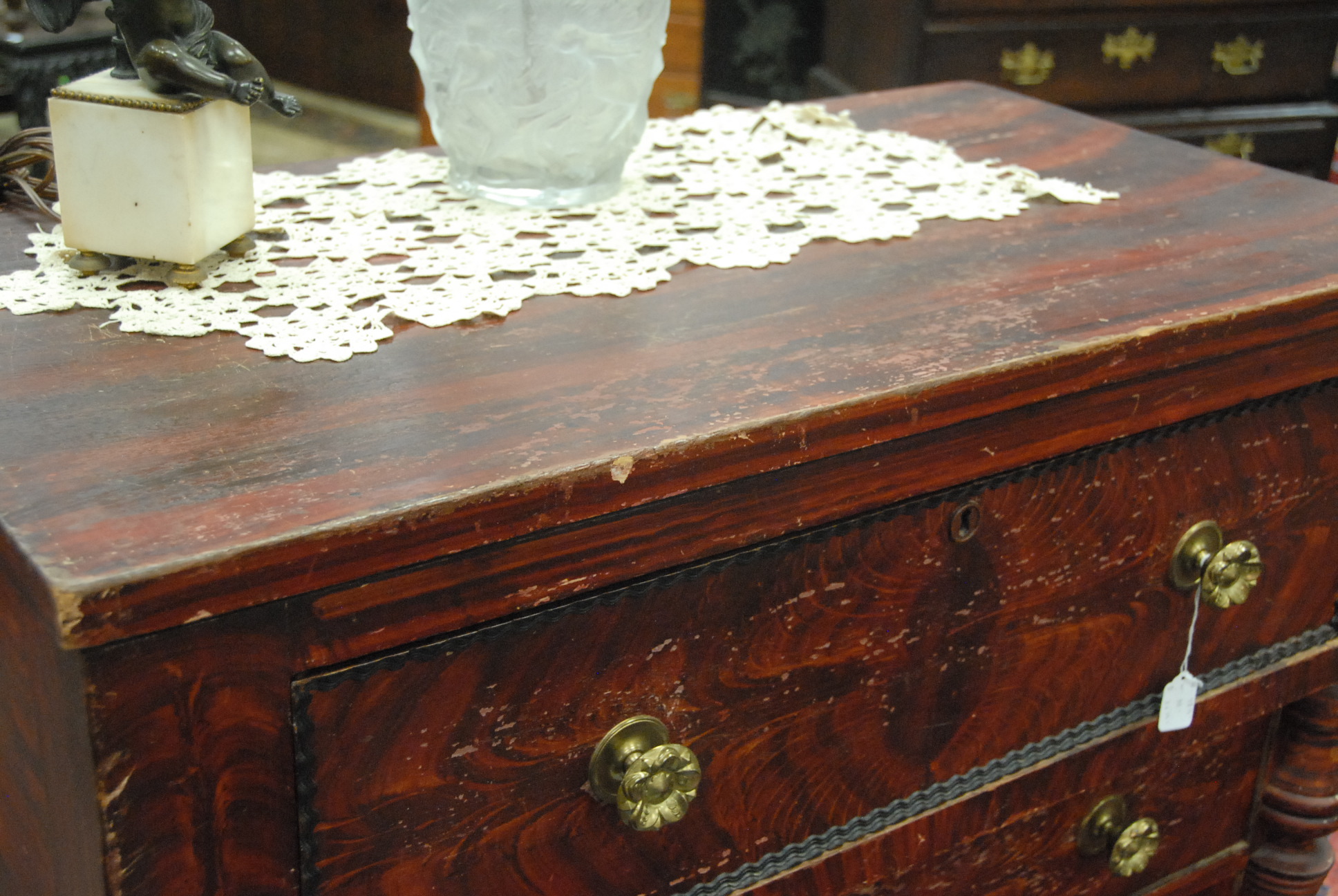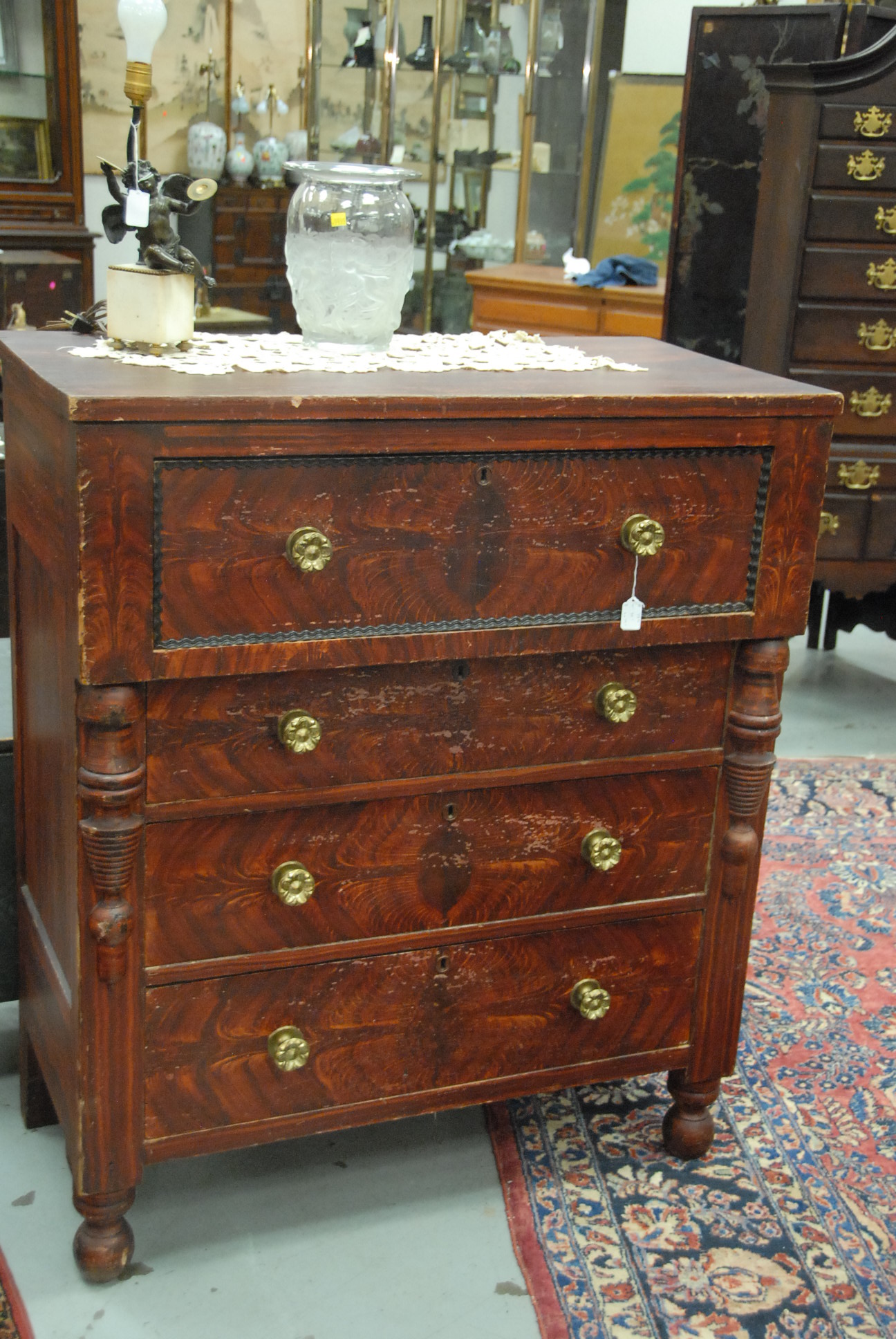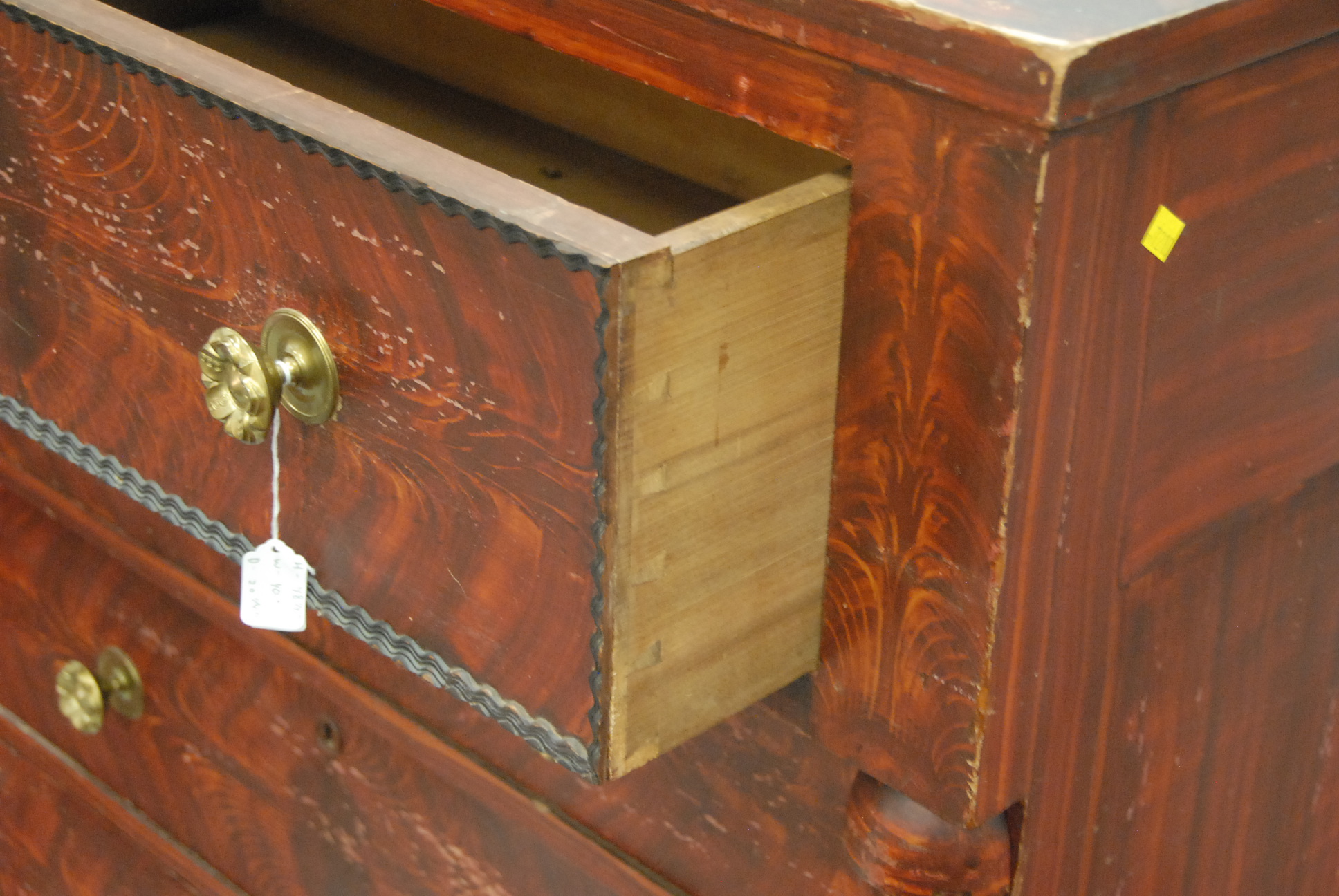 Lot 150: Sheraton chest of four drawers, mahogany grain painted with brass pulls on turned feet. ht. 48 1/4in. wd. 40in. dp. 20 1/4in.