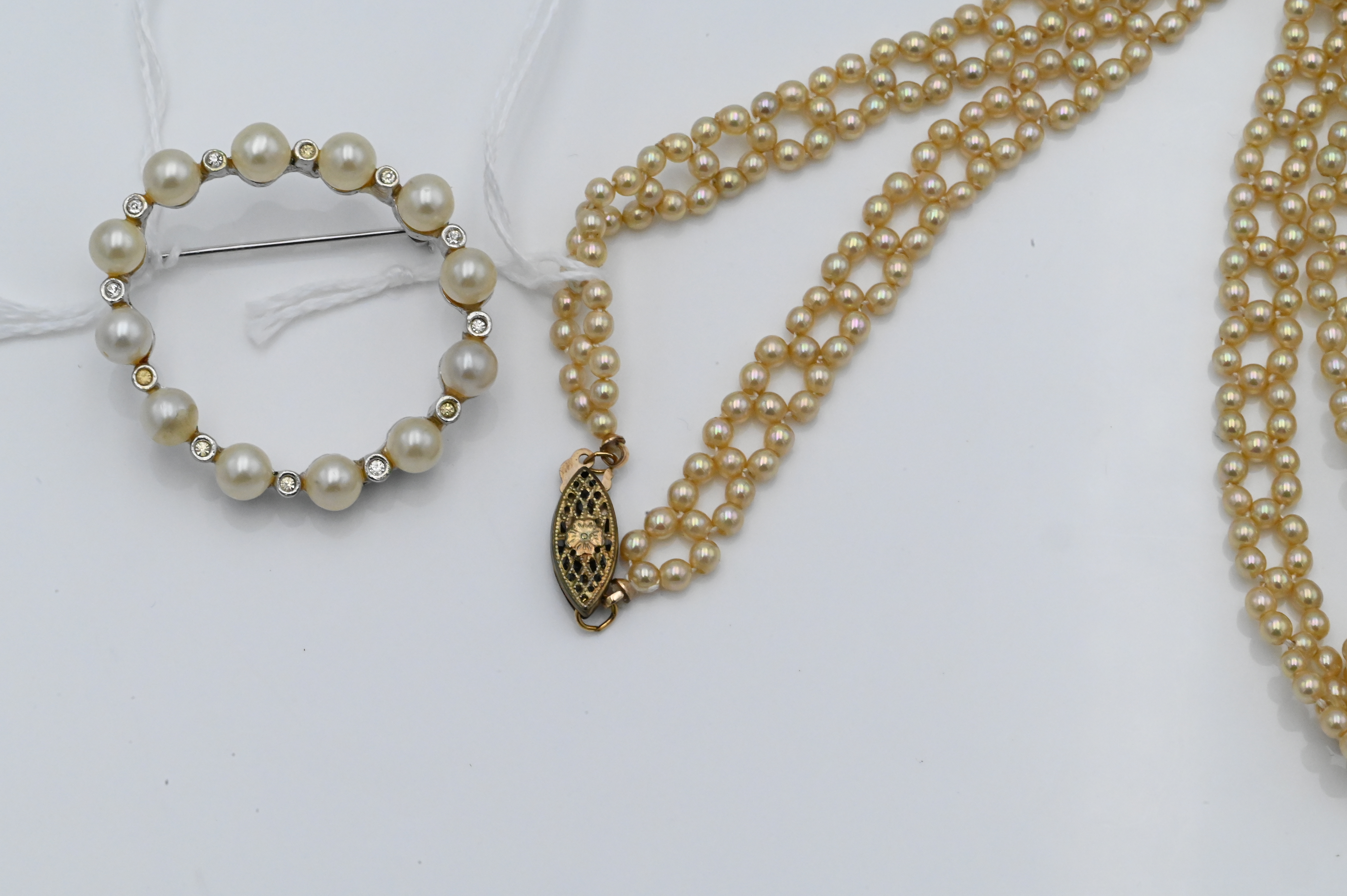 Three Piece Pearl Single Strand Necklace, having 14 karat clasp along with pin and costume pearls.