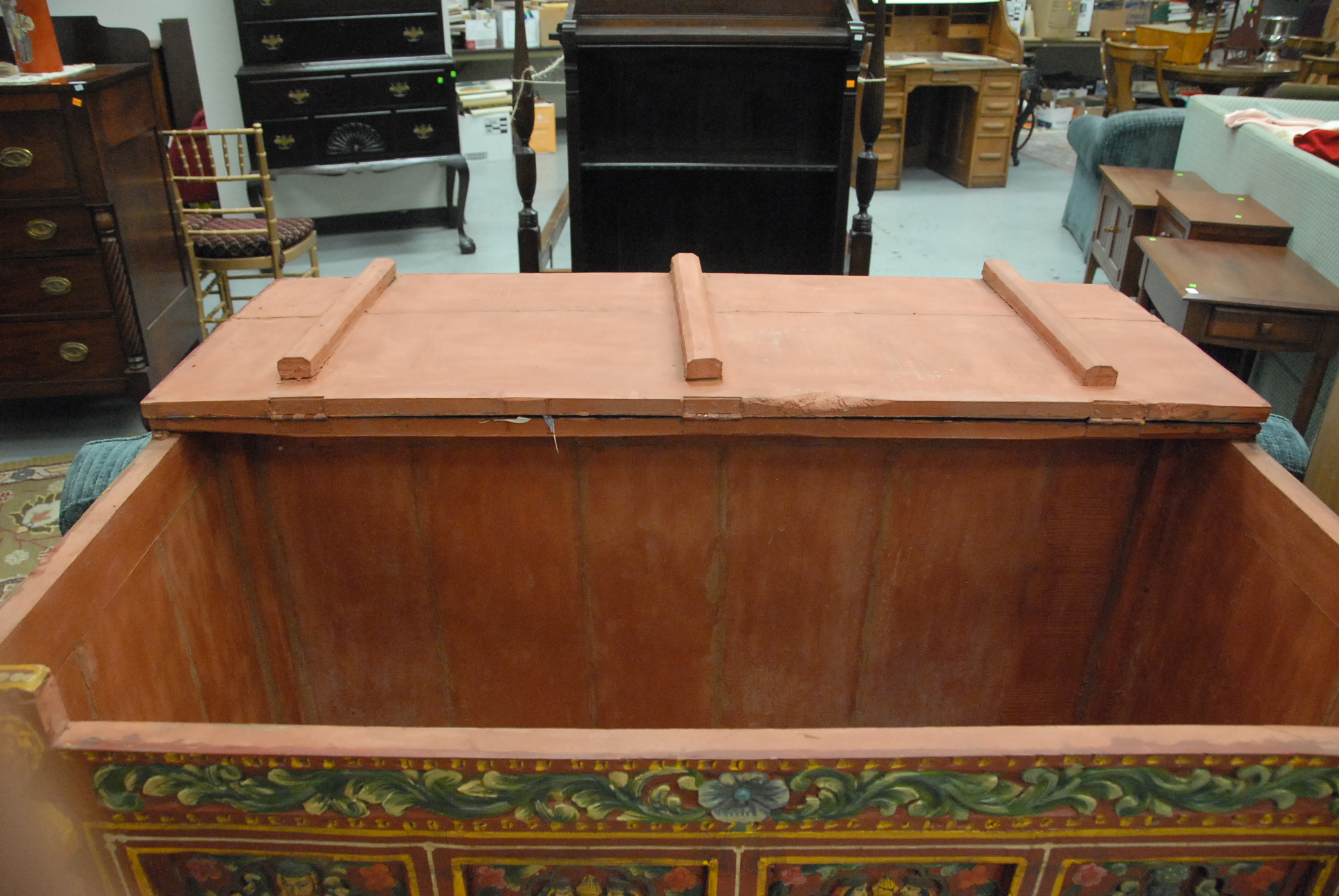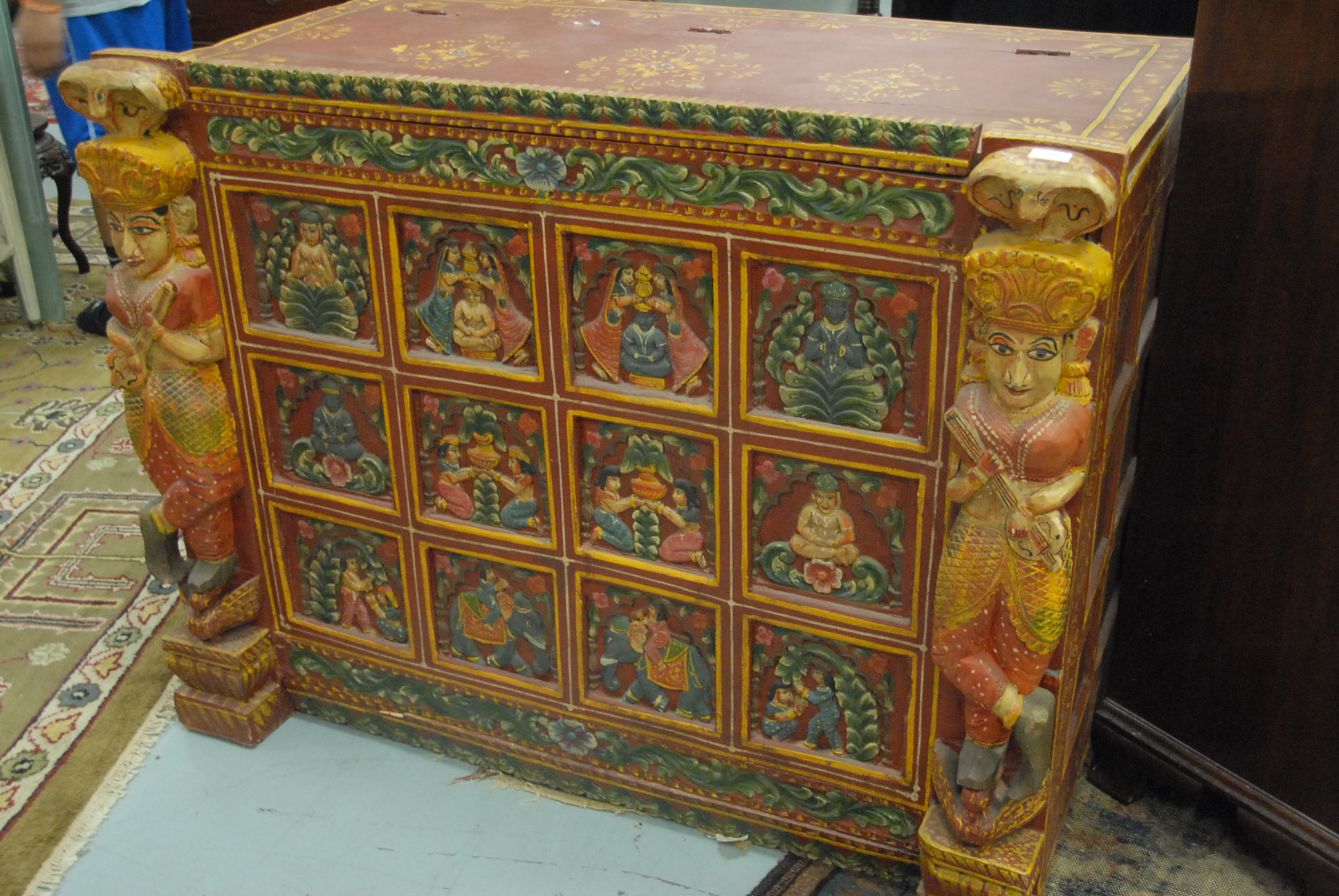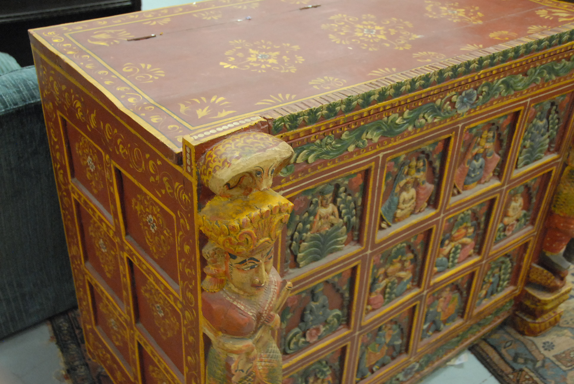 Tibetan carved and painted lift top chest with carved figural pillars.