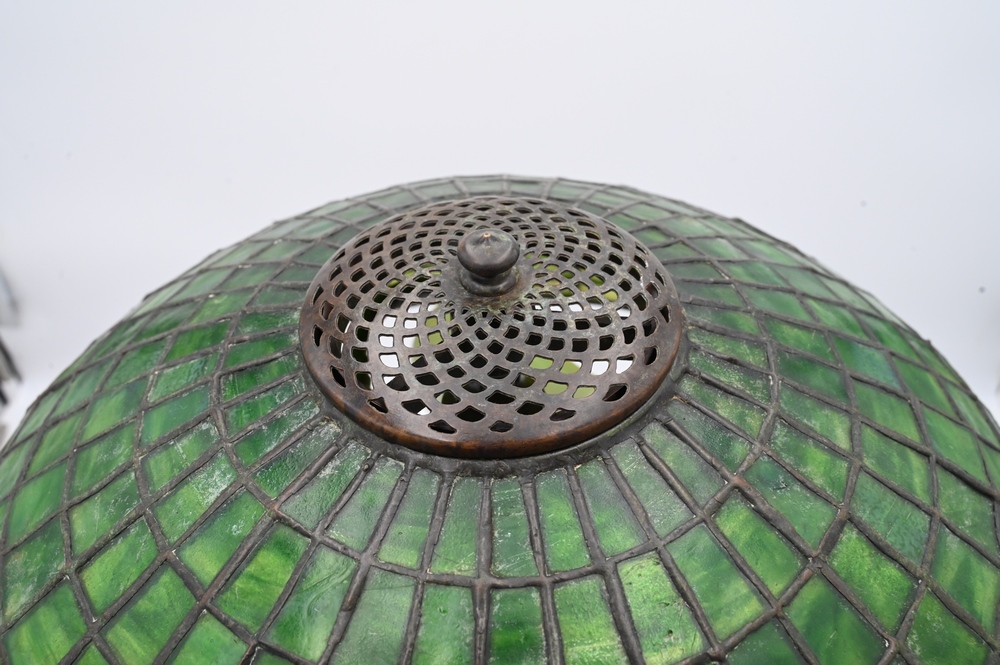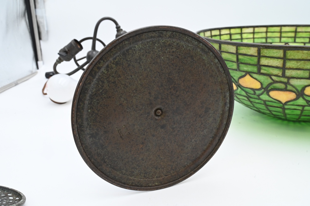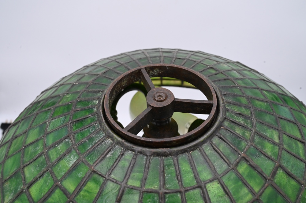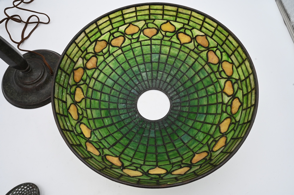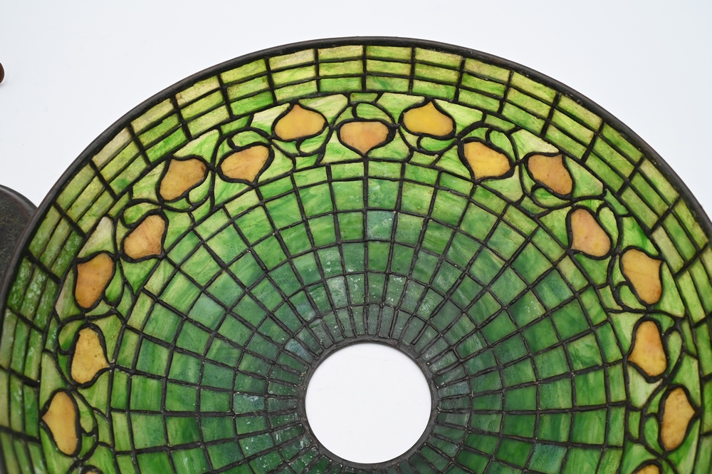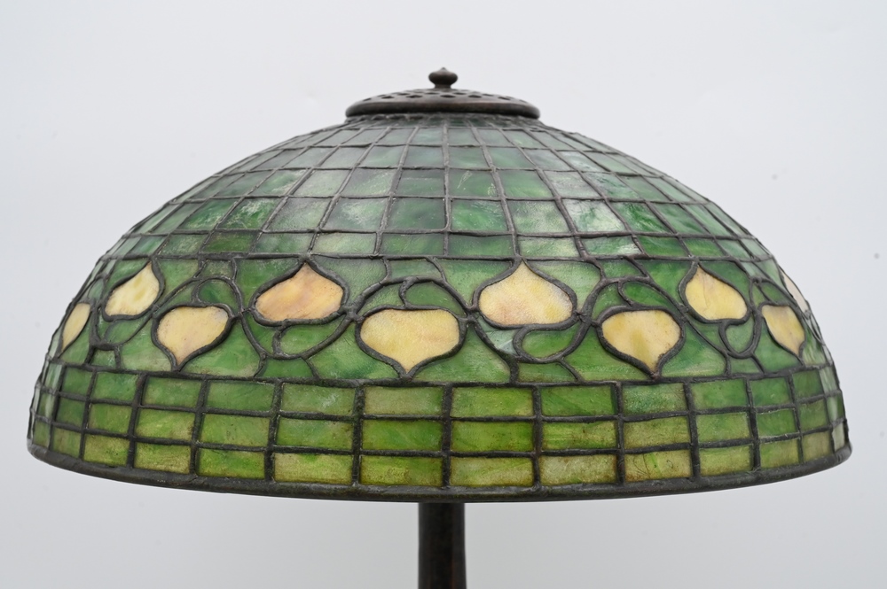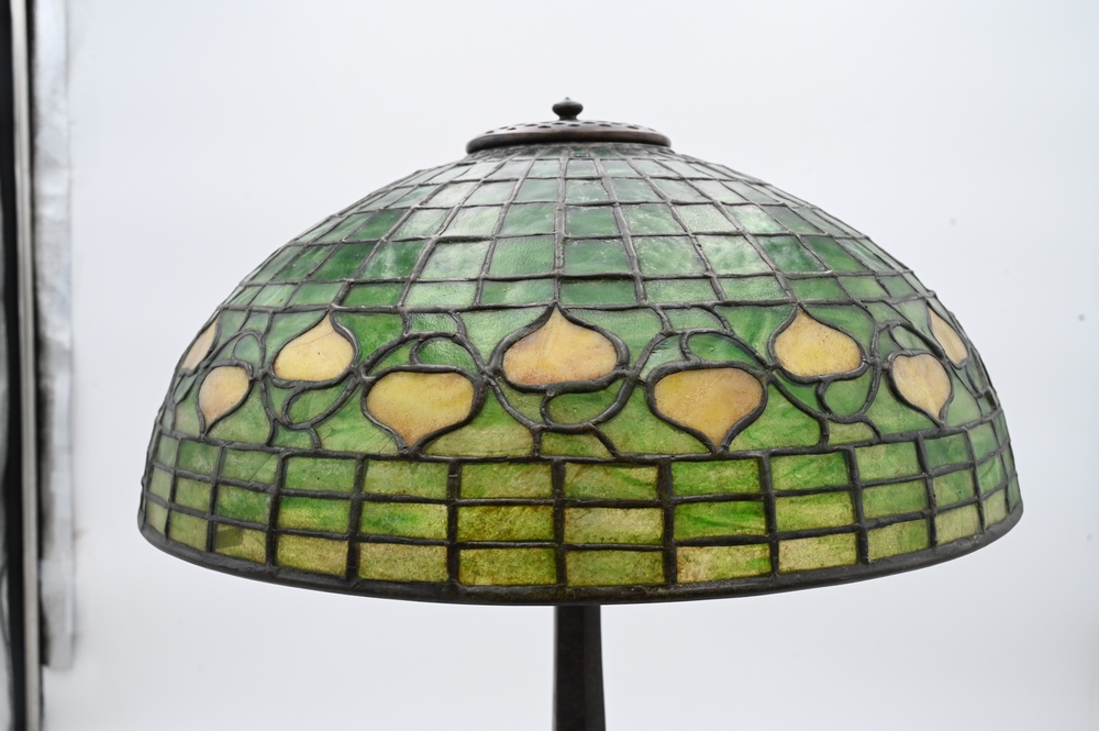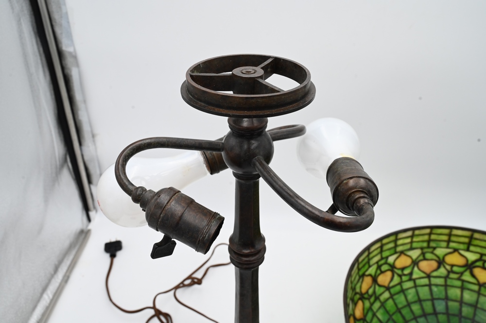 Tiffany Acorn Table Lamp, having 16 inch diameter shade, marked Tiffany New York on bronze, three socket base marked Tiffany Studios New York 534, height 23 inches.